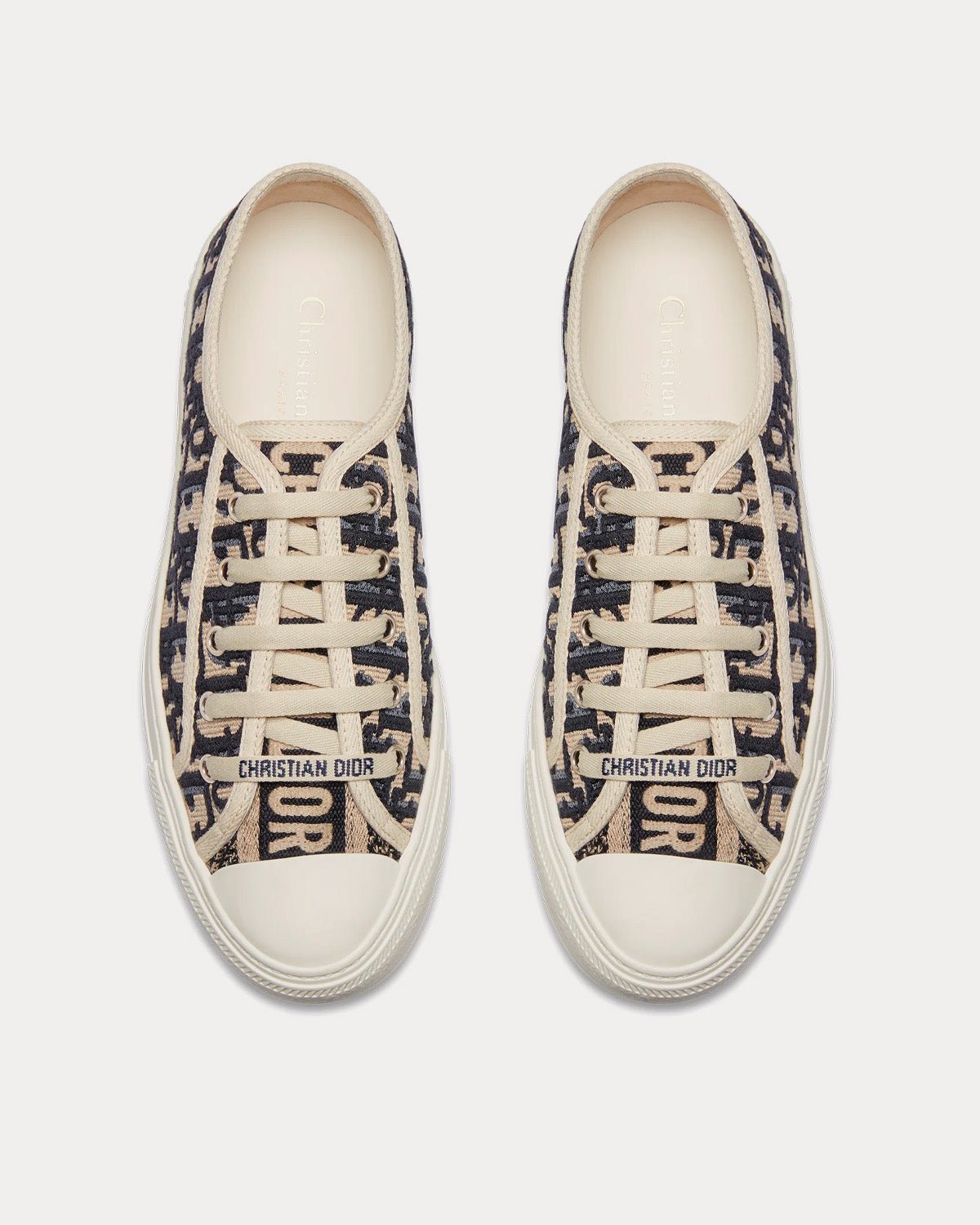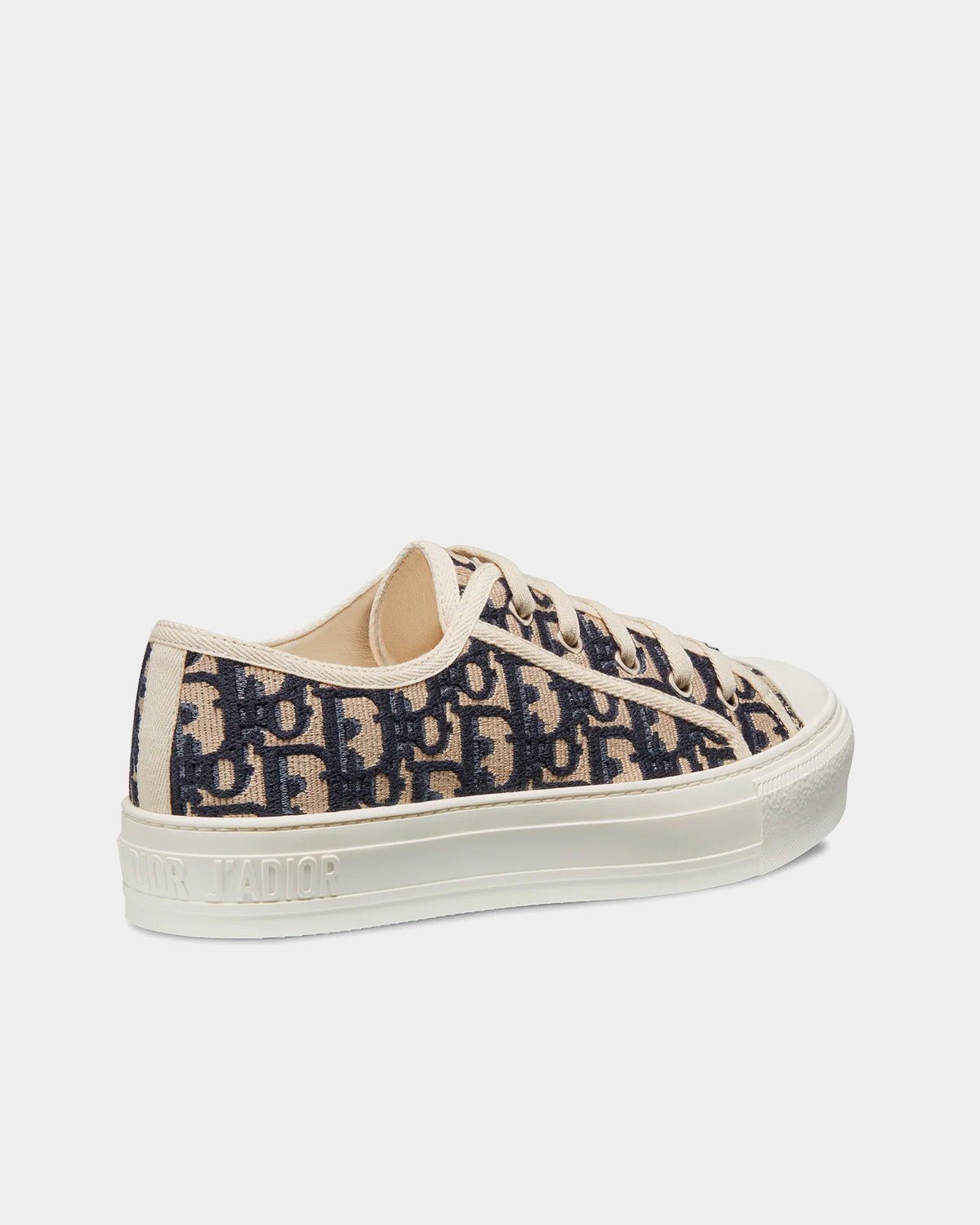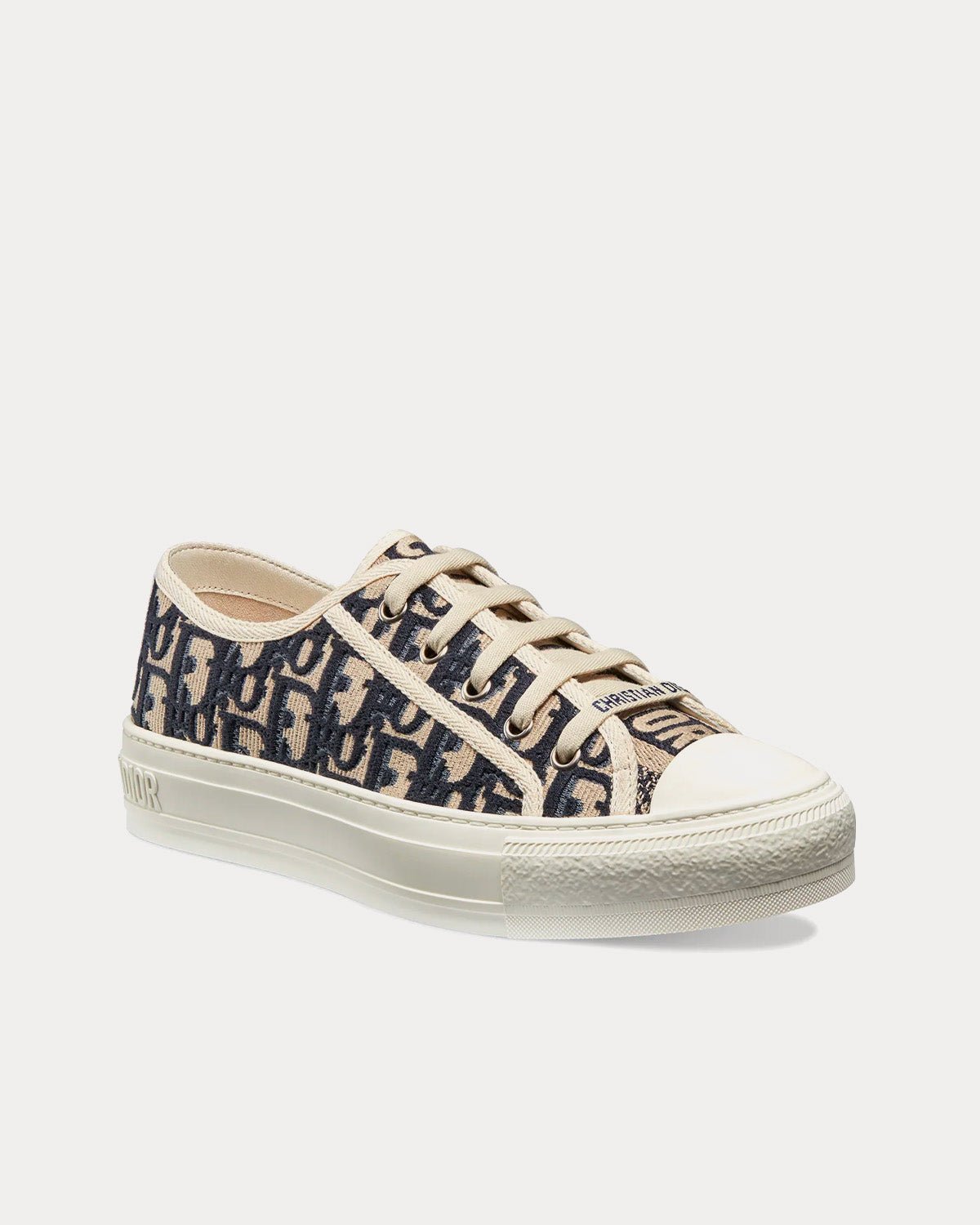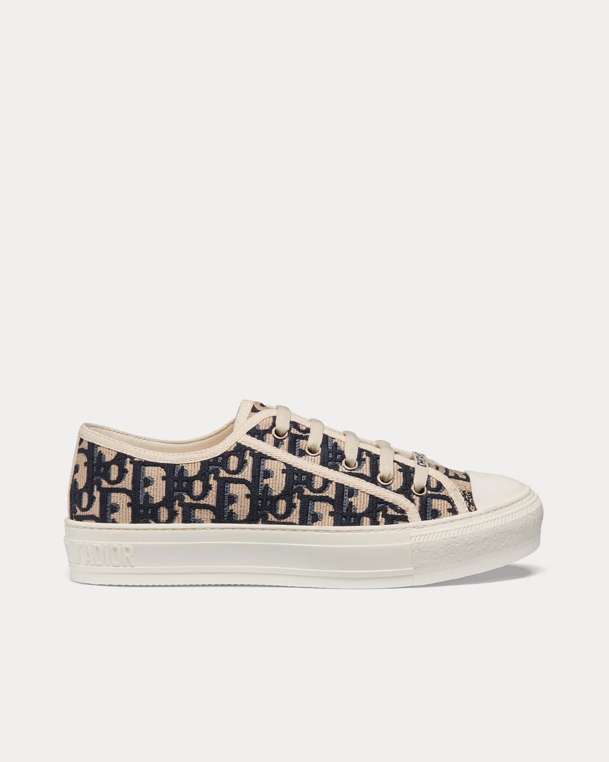 Les baskets basses pour femme DiorWalk’n’Dior en coton bleu foncé brodé oblique Dior présentent des signatures sur la languette, la semelle et les lacets, ainsi qu’une plateforme en EVA ornée d’une étoile, symbole porte-bonheur de Christian Dior. Fabriquées en Italie.