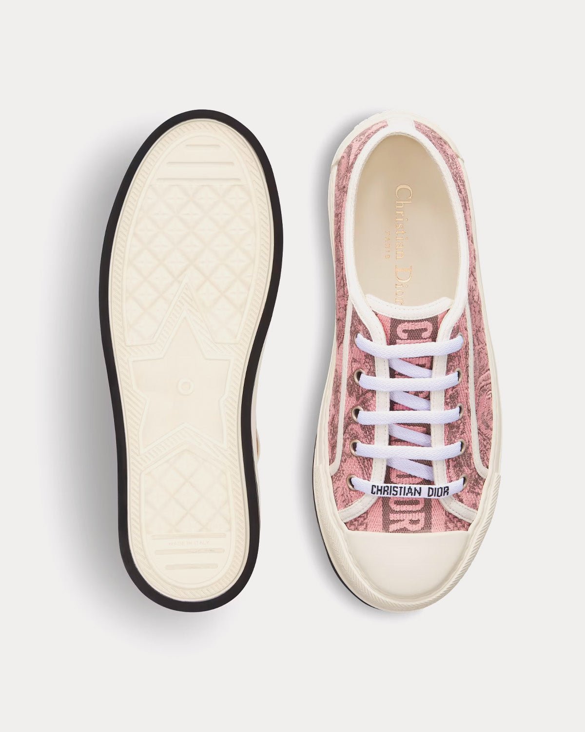 Baskets basses à plateforme pour femme DiorWalk’n’Dior. Baskets basses à plateforme en coton brodé rose et gris avec motif toile de Jouy sauvage. Elles présentent des signatures sur la languette, la semelle et les lacets, ainsi qu’une plateforme en EVA ornée d’une étoile, symbole porte-bonheur de Christian Dior. Fabriquées en Italie.