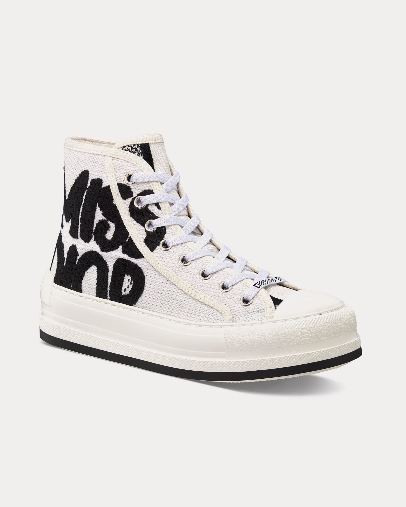 Les baskets montantes à plateforme pour femme DiorWalk’n’Dior en coton brodé blanc et noir arborent le motif graffiti Miss Dior, clin d’œil à la première collection de prêt-à-porter de 1967 et manifeste de la célébration du féminisme par Maria Grazia Chiuri. Elles arborent des signatures sur la languette, la semelle et les lacets, ainsi qu’une plateforme en EVA ornée d’une étoile, symbole porte-bonheur de Christian Dior. Fabriquées en Italie.