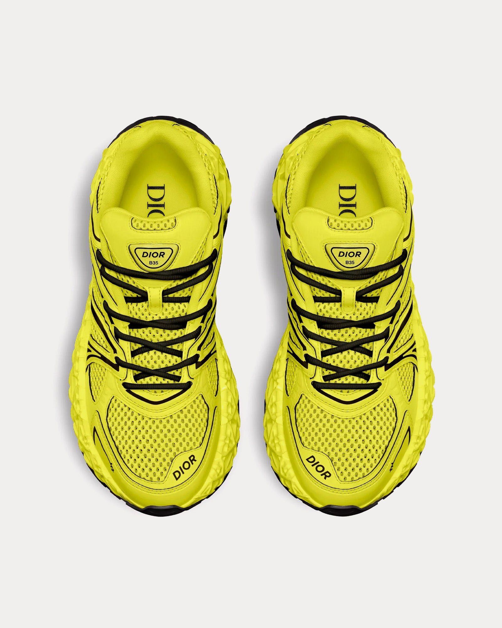 Les baskets basses pour homme Dior x Kaws B35 NXXT en tissu technique jaune et maille technique jaune présentent une tige en tissu technique et maille, une doublure en maille technique, les signatures Dior et 47 sur les côtés, la signature Dior B35 sur la languette et le contrefort, une bande élastique intérieure pour un maintien sûr, des semelles extérieures ajourées Cannage avec signature Dior et une construction soudée. Fabriquées en Italie.