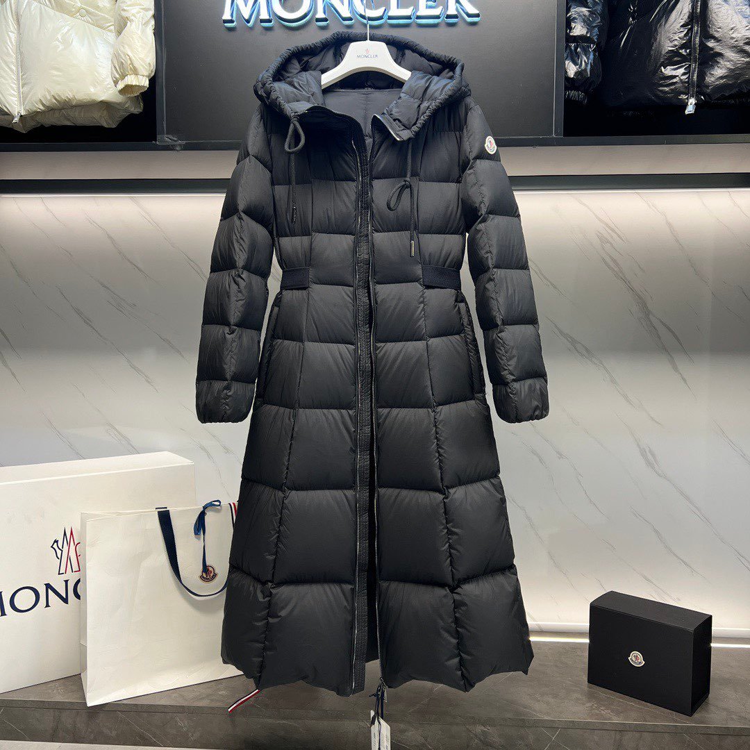 Doudoune longue pour femme signée Moncler, en coloris noir classique, avec capuche et ceinture pour un look élégant et une protection optimale contre le froid.