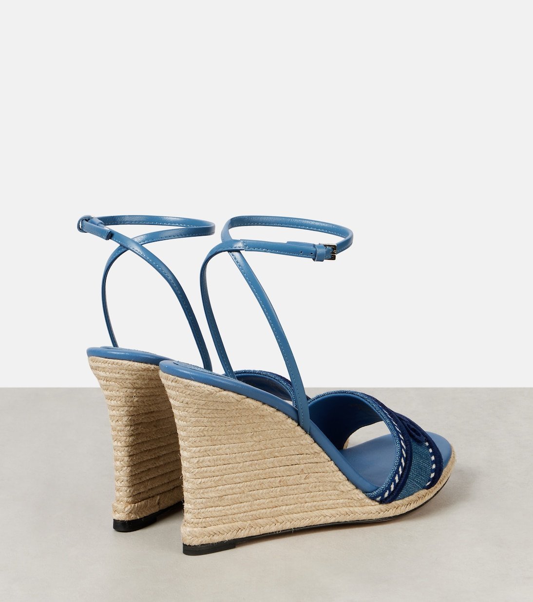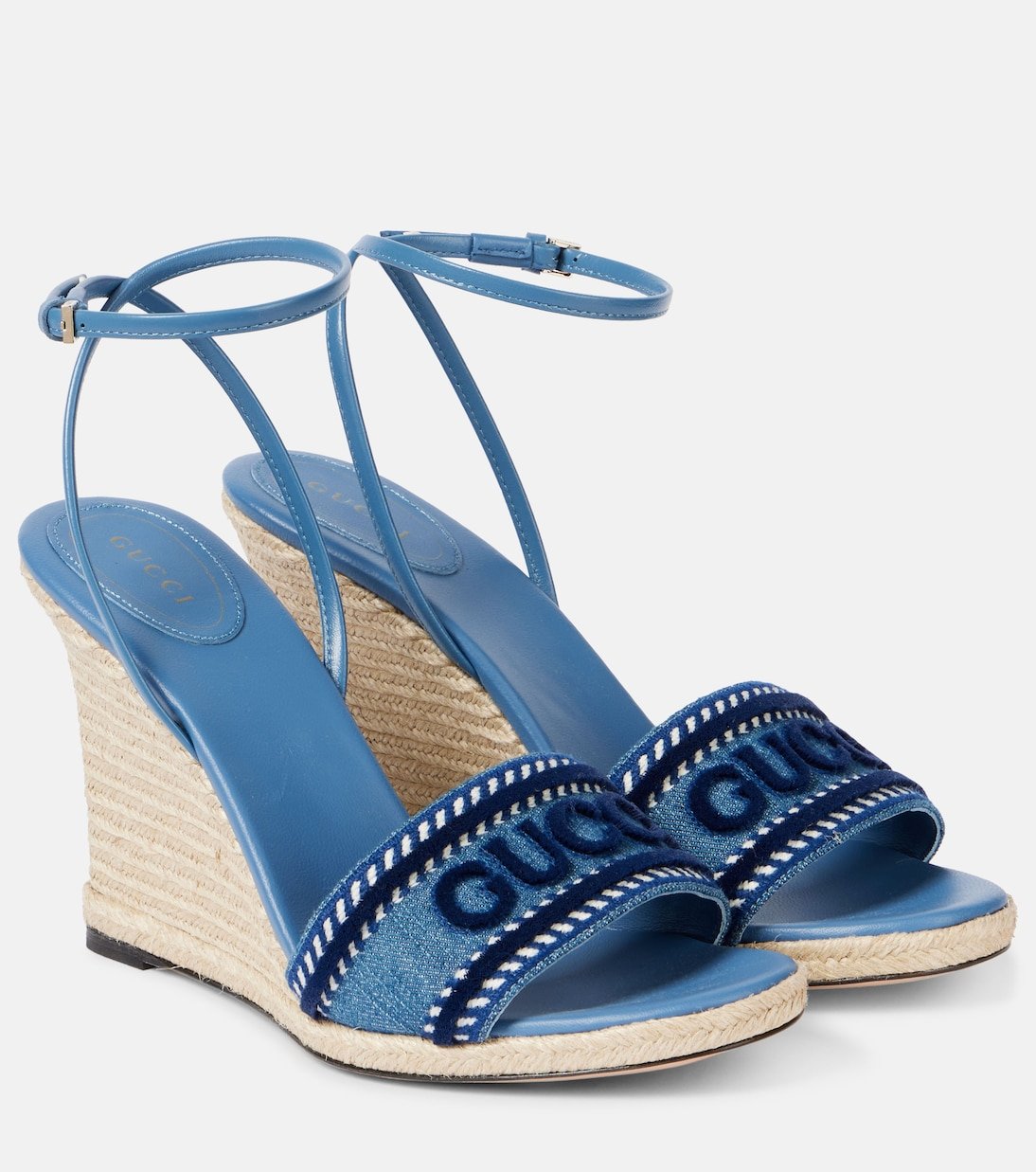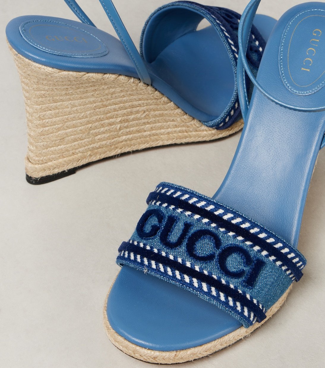 Ces espadrilles de Gucci sont brodées du logo du label en ton sur ton. Elles sont dotées d’une empeigne en denim et de brides en cuir, et reposent sur des talons compensés en jute.
