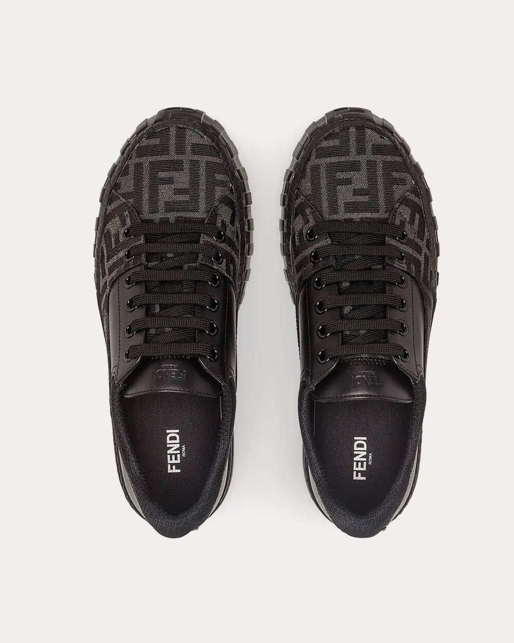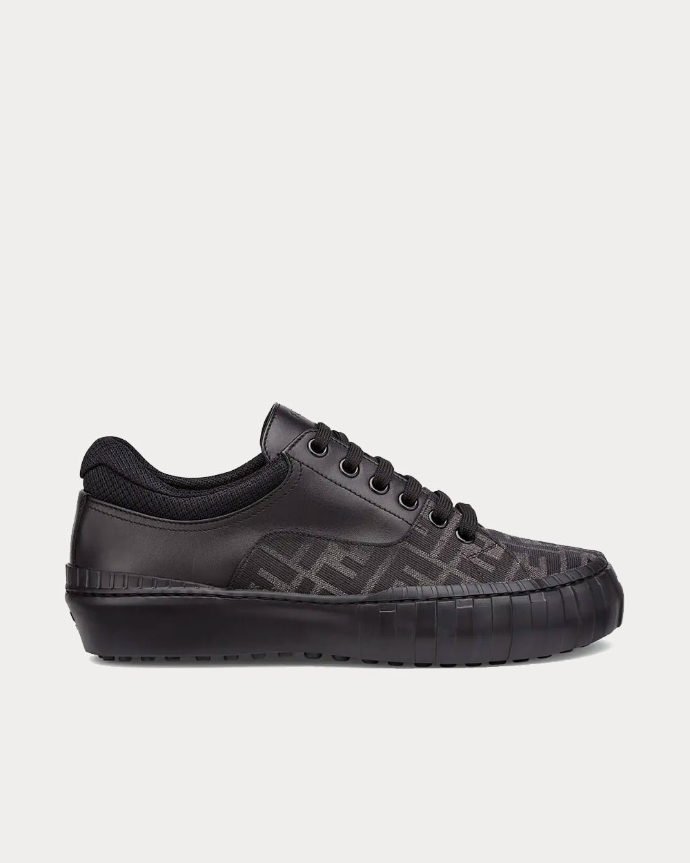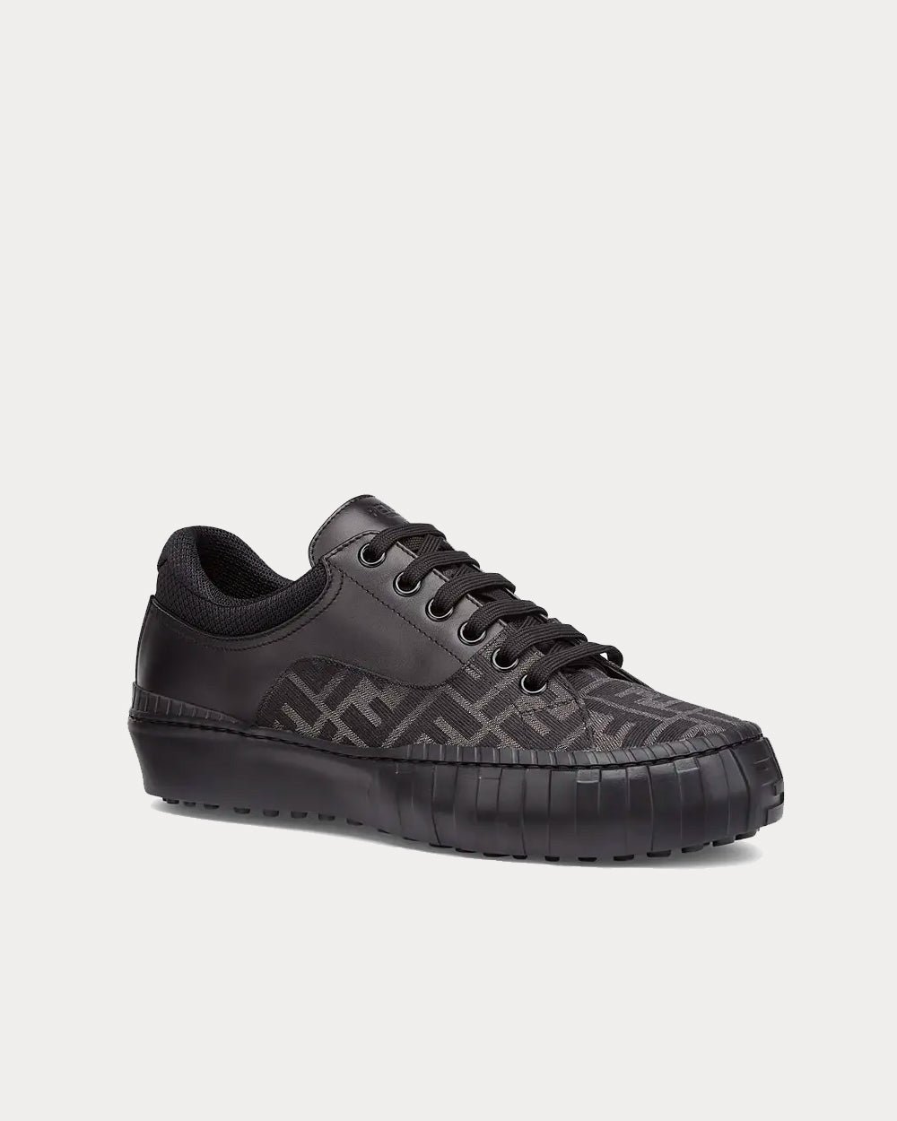 Baskets à lacets Fendi Force. Confectionnées en cuir noir et tissu jacquard FF gris et noir. Ornées d’œillets métalliques et d’une bordure en mesh technique. Semelle en caoutchouc léger avec détail FF embossé sur le bout. Fabriquées en Italie.