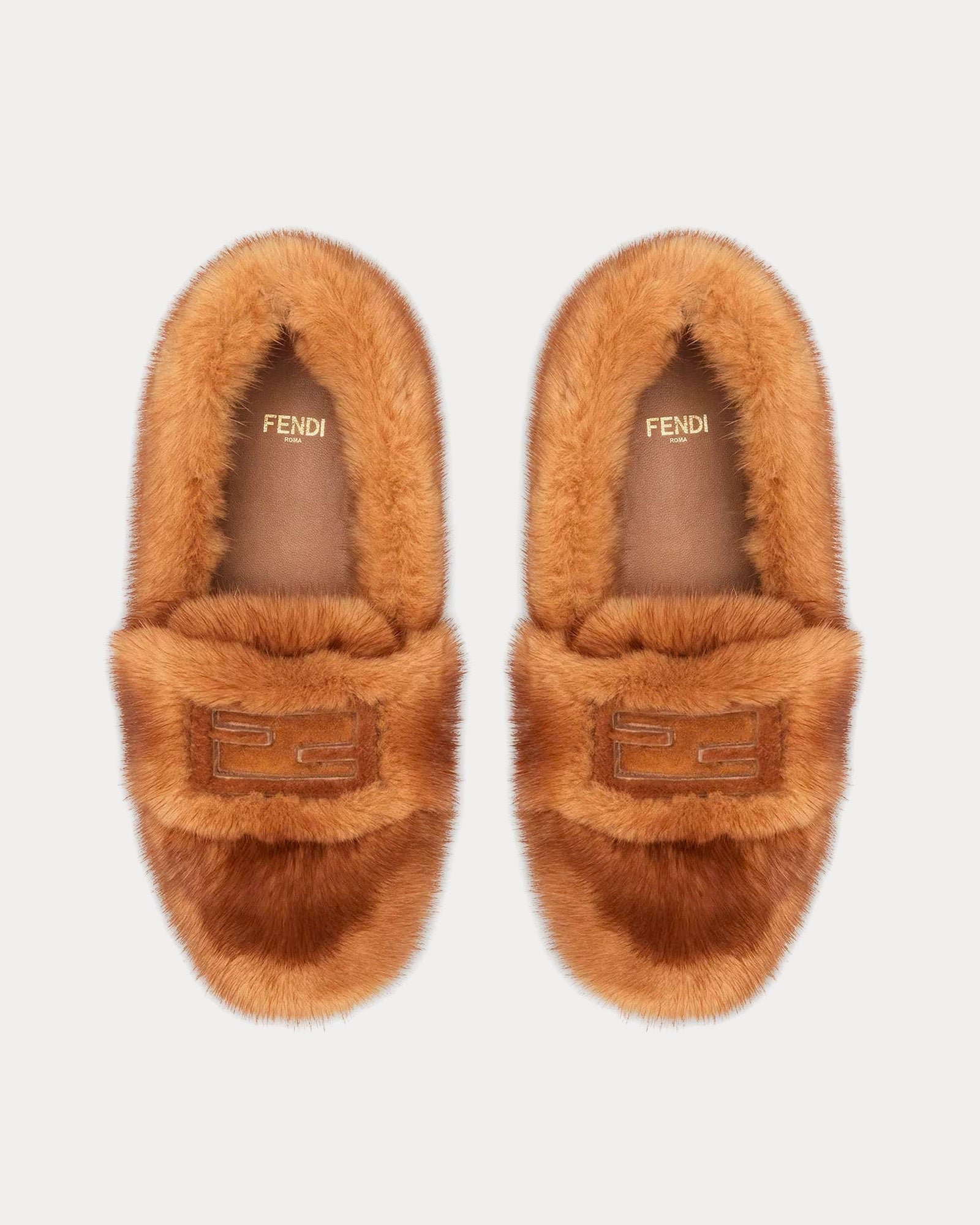 Les mocassins Fendi Baguette pour femmes de couleur beige sont confectionnés en vison et présentent un tablier et une empeigne cousus ornés du motif FF, des semelles en caoutchouc et des semelles intérieures en cuir.