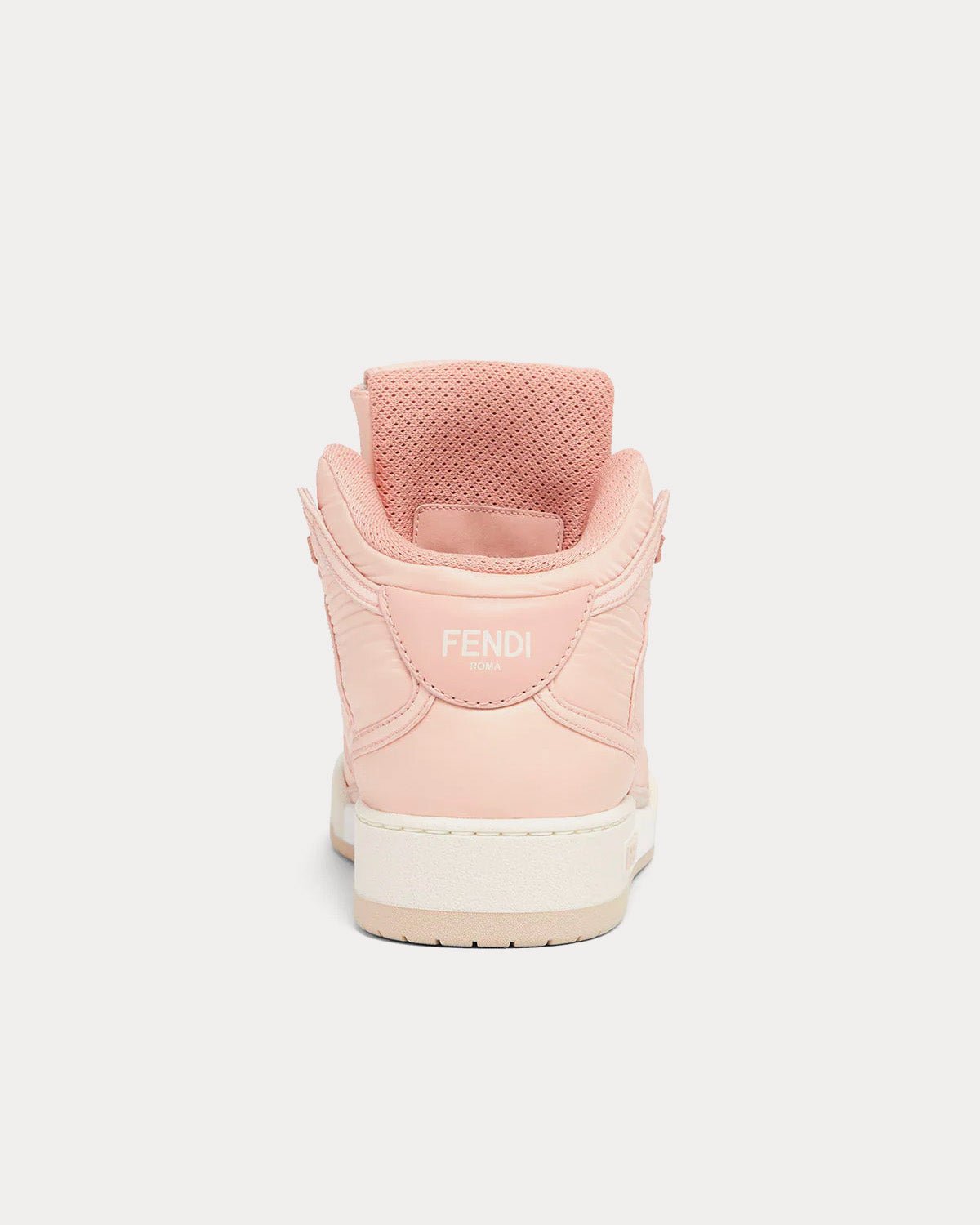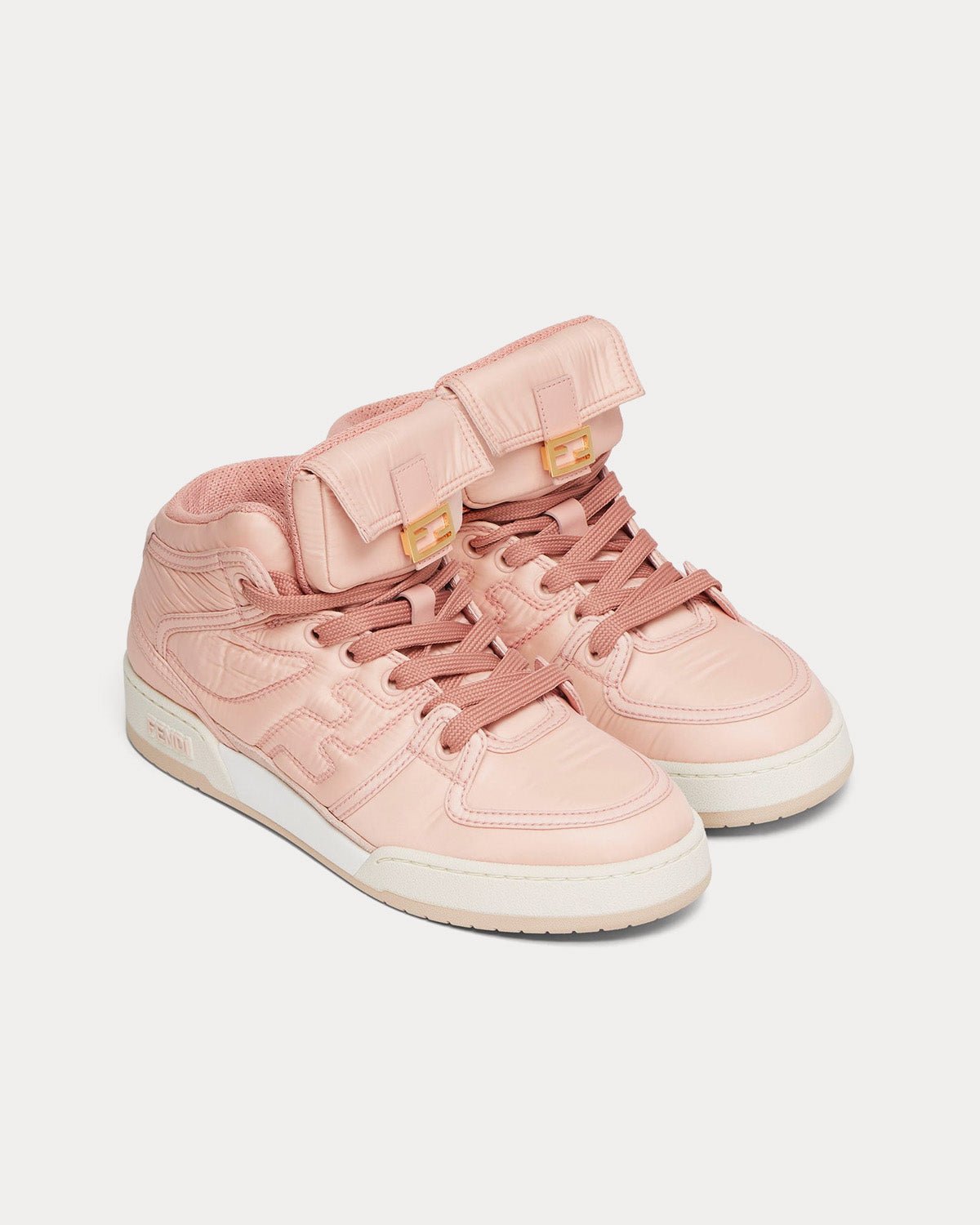 Baskets montantes à lacets Fendi Match en édition spéciale pour célébrer le 25e anniversaire de la Baguette, avec poche Baguette sur la languette. Fabriquées en nylon rose pêche. Semelle en caoutchouc blanc avec inscription Fendi sur le côté. Fabriquées en Italie.