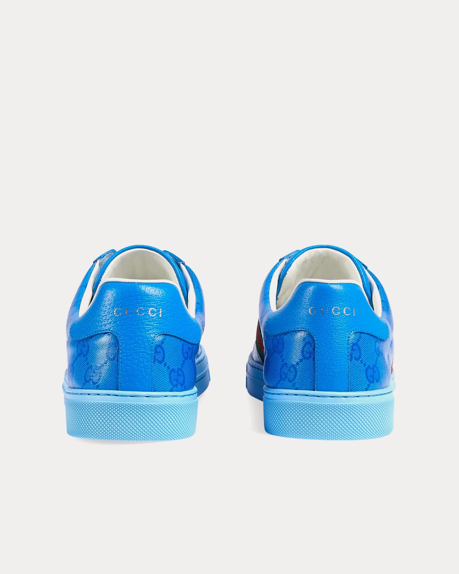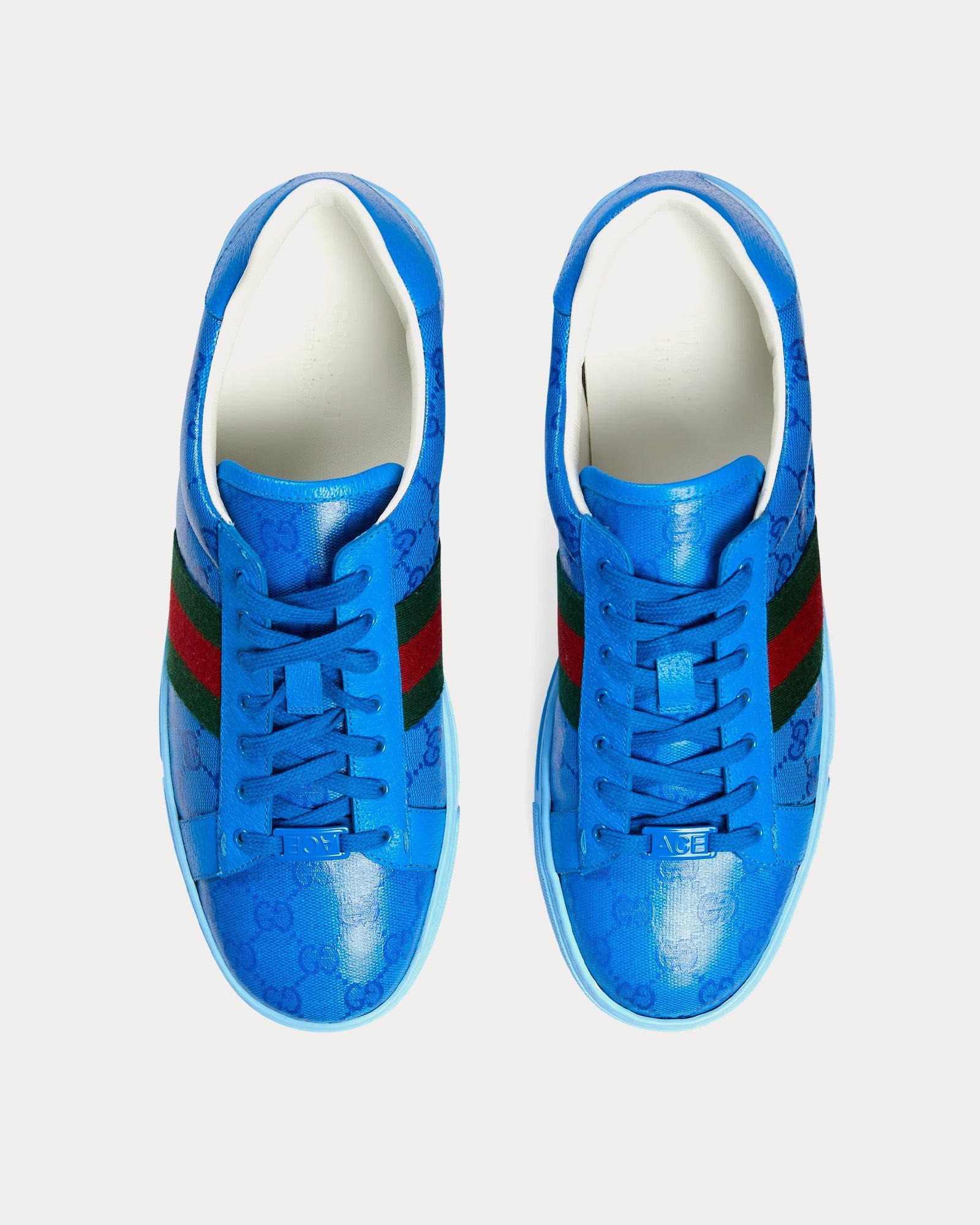 Les baskets basses pour hommes GucciAce GG Cystal Canvas en bleu présentent une tige en toile GG Crystal, une bande Web verte et rouge, une étiquette métallique « ACE », une semelle en caoutchouc ton sur ton et une fermeture à lacets. Fabriquées en Italie.