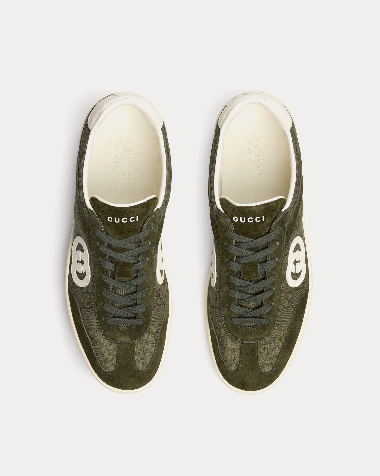 L’empeigne associe une toile monogramme GG vert foncé à des empiècements en daim ton sur ton, créant un look texturé et superposé. La semelle en caoutchouc offre durabilité et confort, tandis que la fermeture à lacets assure un maintien sûr. La paire comprend également un jeu de lacets supplémentaire pour un style polyvalent.