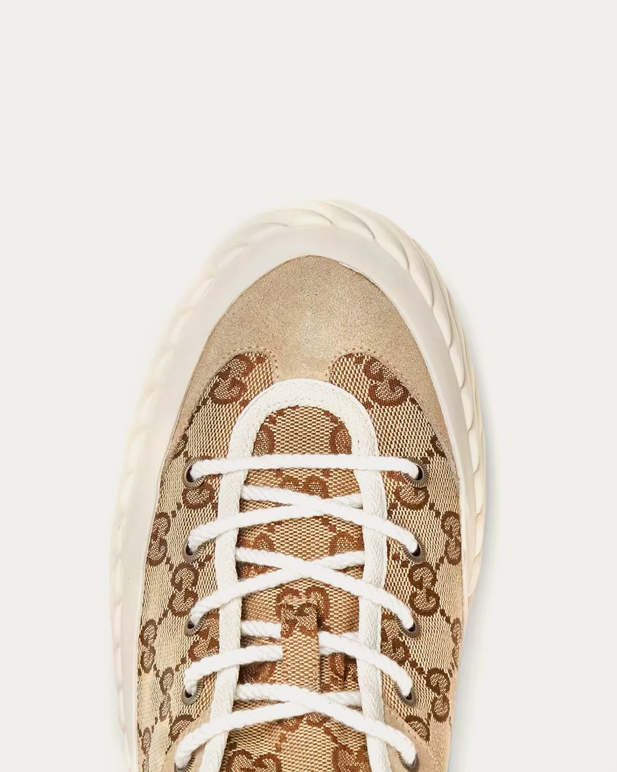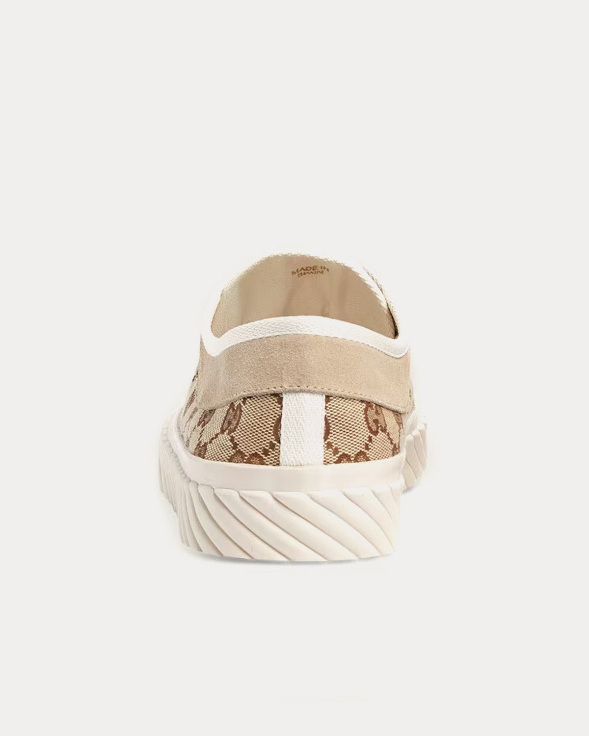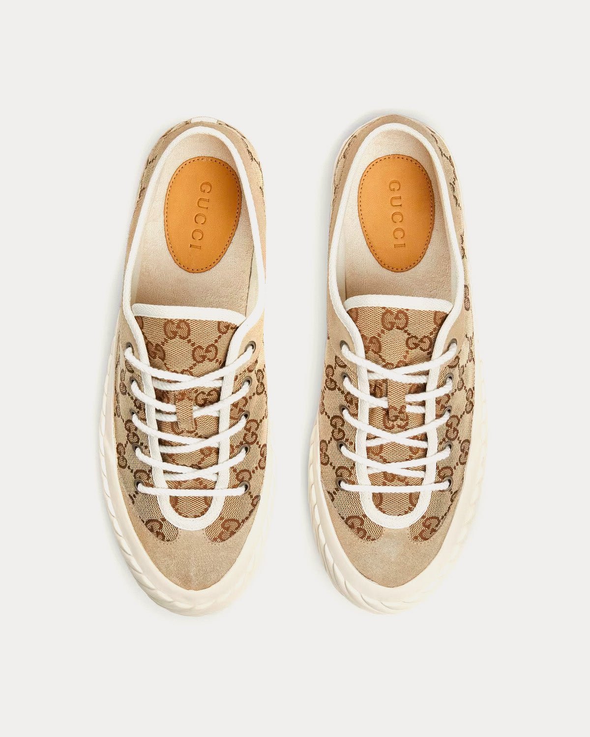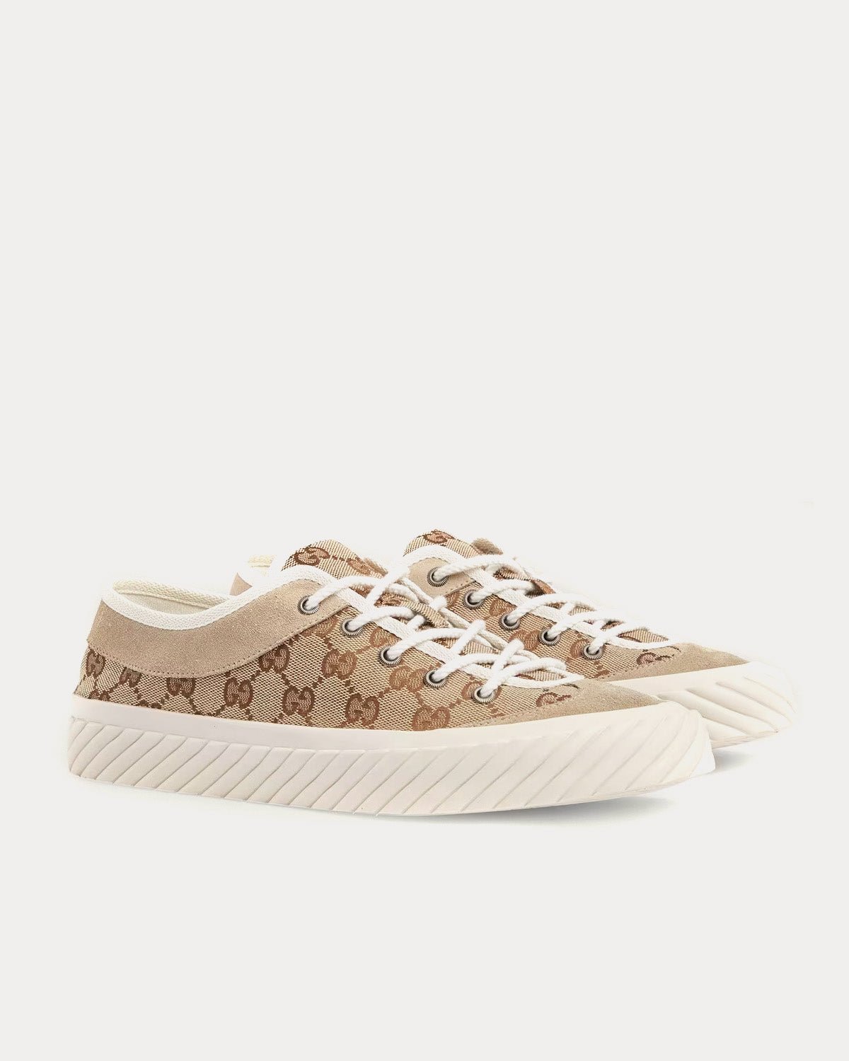 Baskets basses Gucci GG Canvas pour homme, beige et ébène, avec bordure en daim. Une semelle en caoutchouc blanc contrastant complète la finition. Fabriquées en Espagne.