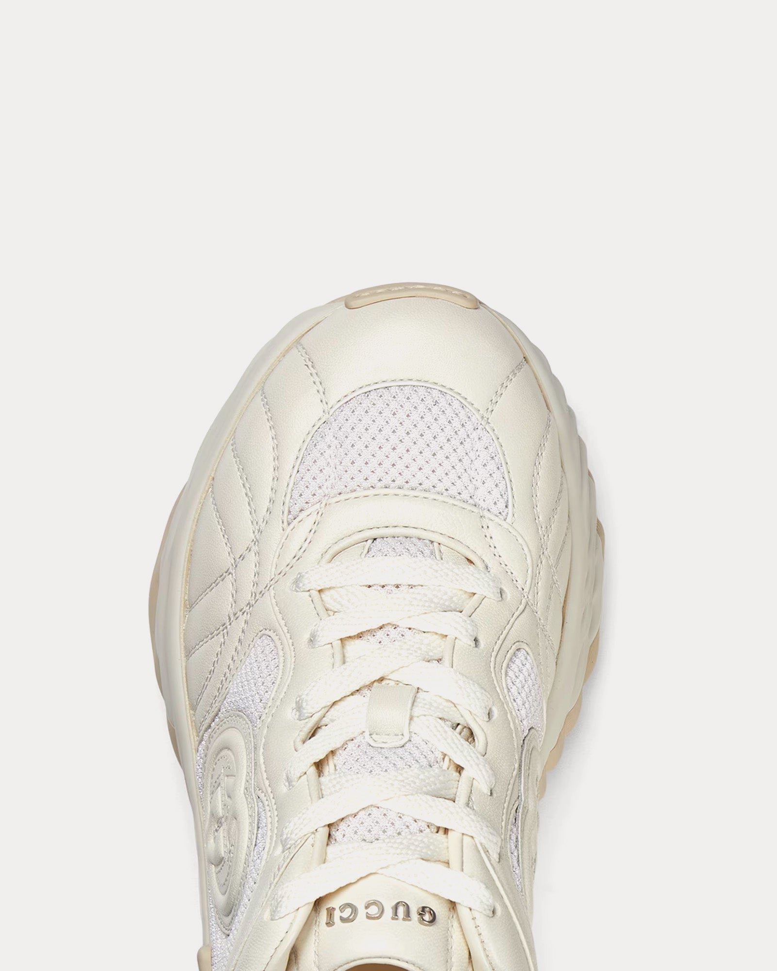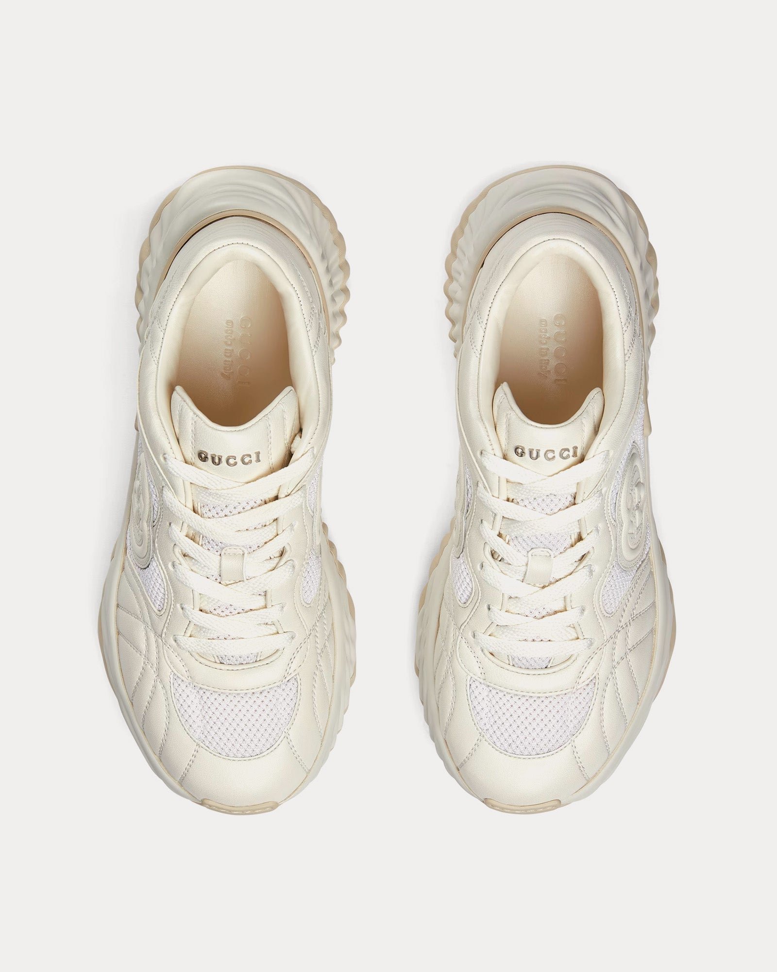 Les baskets basses GucciInterlocking pour hommes en blanc cassé présentent des semelles épaisses, des tiges en cuir cousues associées à une maille respirante et deux détails de logo complètent le design en cuir noir, notamment un patch en cuir Interlocking G avec un effet 3D et une quincaillerie en métal avec lettrage Gucci. Fabriquées en Italie.