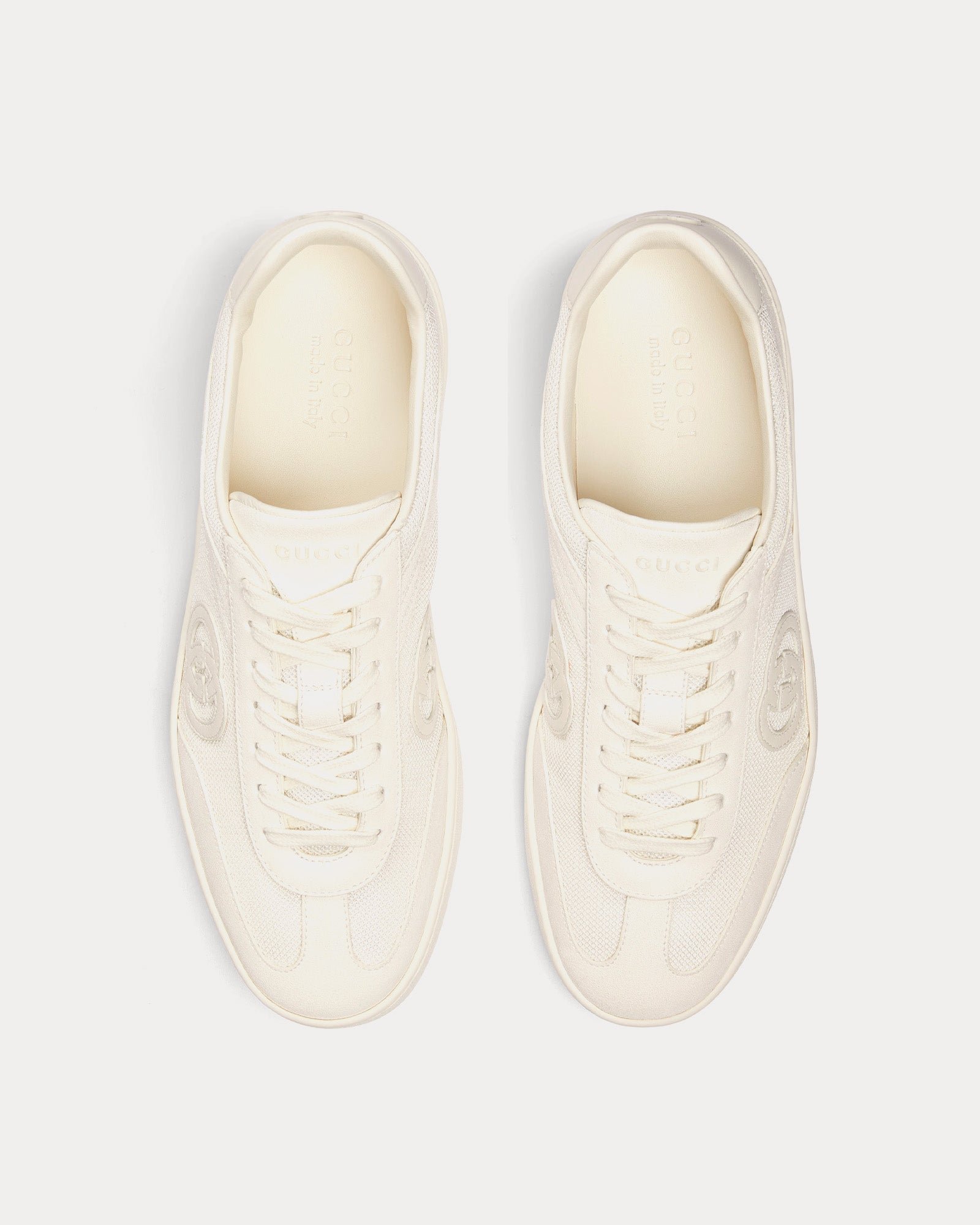 Les baskets basses pour homme Gucci Interlocking G en blanc sont confectionnées en daim et présentent une tige en mesh et daim, des empiècements en toile et le logo emblématique Interlocking G. Fabriquées en Italie.