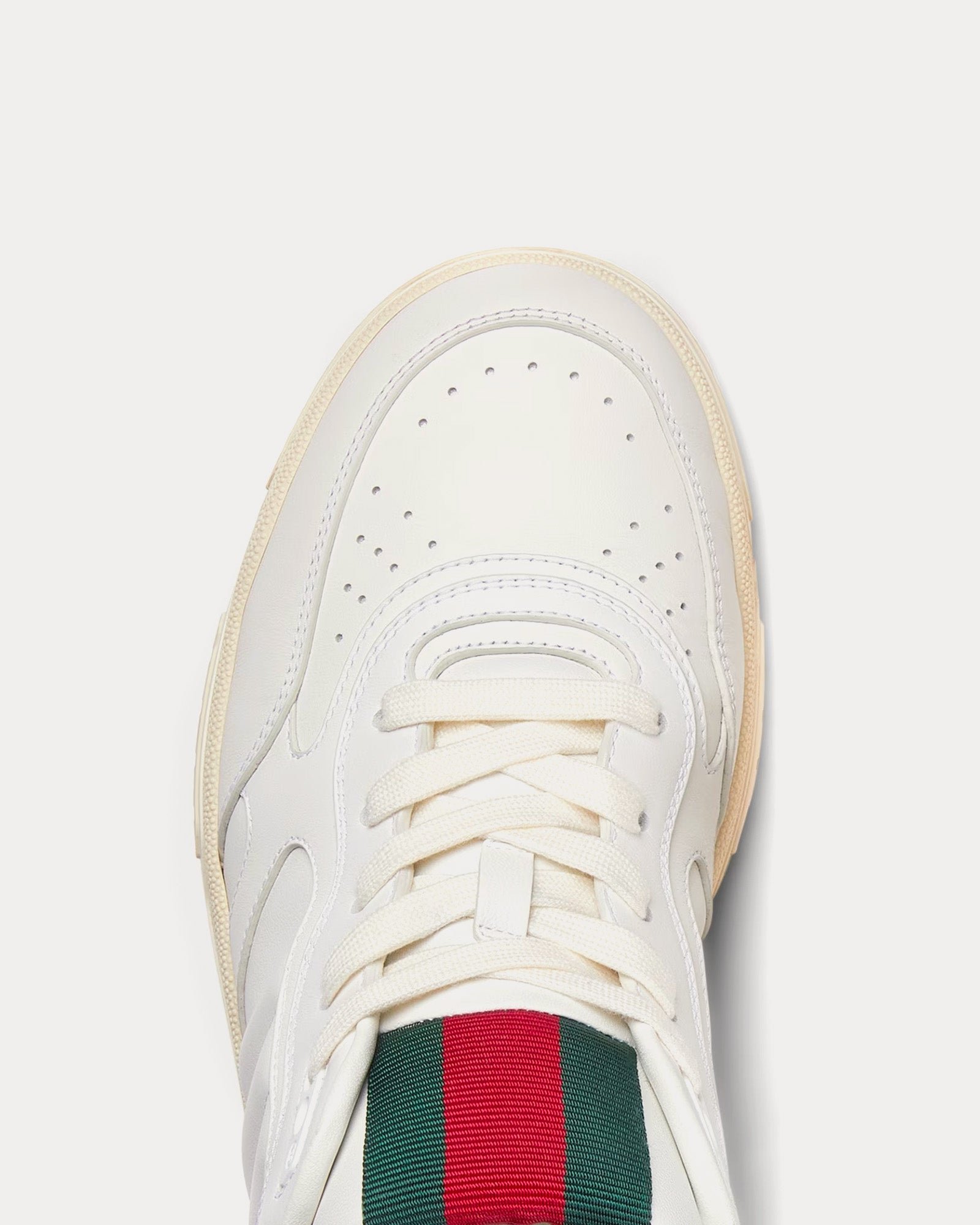 Les baskets basses GucciRe-Web pour hommes en blanc présentent une tige en cuir traitée avec un processus spécifique pour la rendre douce et brillante, une étiquette Web avec inscription Gucci et G entrelacés, des semelles extérieures en caoutchouc avec G entrelacés et logo Gucci, des détails G entrelacés sur les œillets et une languette Web verte et rouge audacieuse. Fabriquées en Italie.