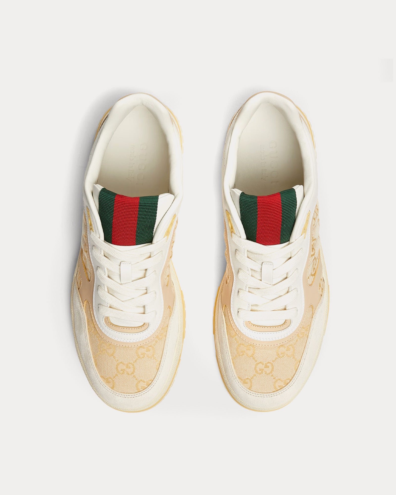 L’empeigne est en toile GG beige clair, rehaussée de daim et de cuir ivoire et beige clair, créant un contraste sophistiqué. La doublure est en cuir souple pour plus de confort. La marque Gucci est présente sur toute la chaussure, avec notamment l’inscription Gucci et l’étiquette Web Gucci, ainsi que des détails G entrelacés sur les œillets.