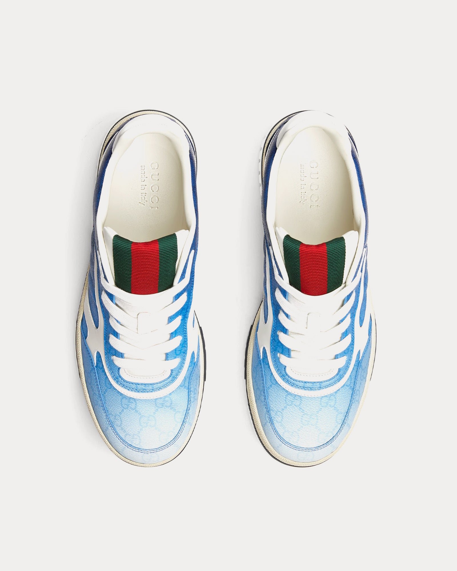 Confectionnées en Italie à partir de la toile GG Supreme bleu dégradé emblématique, ces baskets remarquables apportent dimension et profondeur à la tige grâce à leur finition monogramme à effet dégradé. Une languette Web verte et rouge éclatante rehausse le design avec un clin d’œil audacieux au motif à rayures emblématique de Gucci, mêlant inspiration vintage et énergie urbaine.