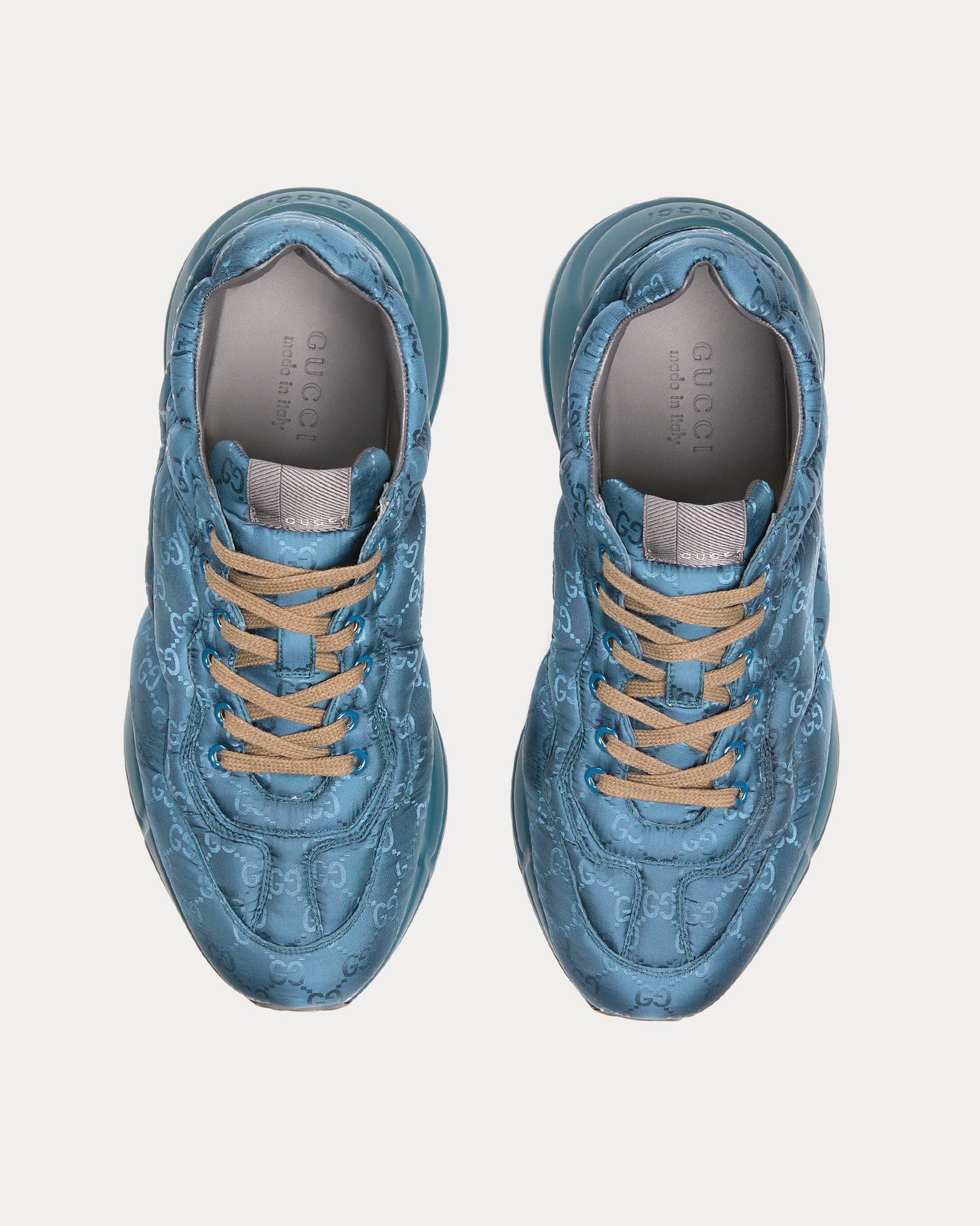 Les baskets basses pour hommes Gucci Rhyton de couleur bleue sont fabriquées en nylon jacquard GG rembourré et présentent une étiquette logo Gucci, des semelles en caoutchouc, des lacets contrastants et des semelles surdimensionnées avec une construction épaisse. Fabriquées en Italie.