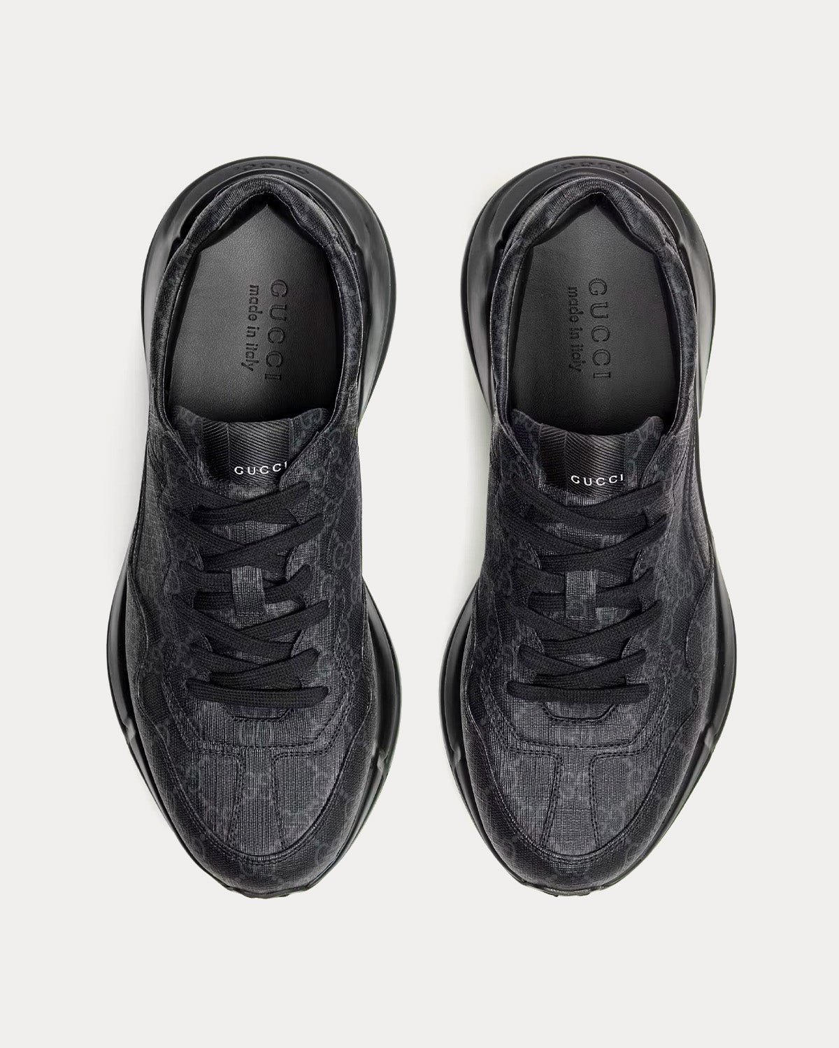 Les baskets basses pour hommes GucciRhyton en toile GG Supreme grise et graphite présentent un design élégant de style sportif, des fermetures à lacets, un talon bas et des semelles en caoutchouc. Fabriquées en Italie.