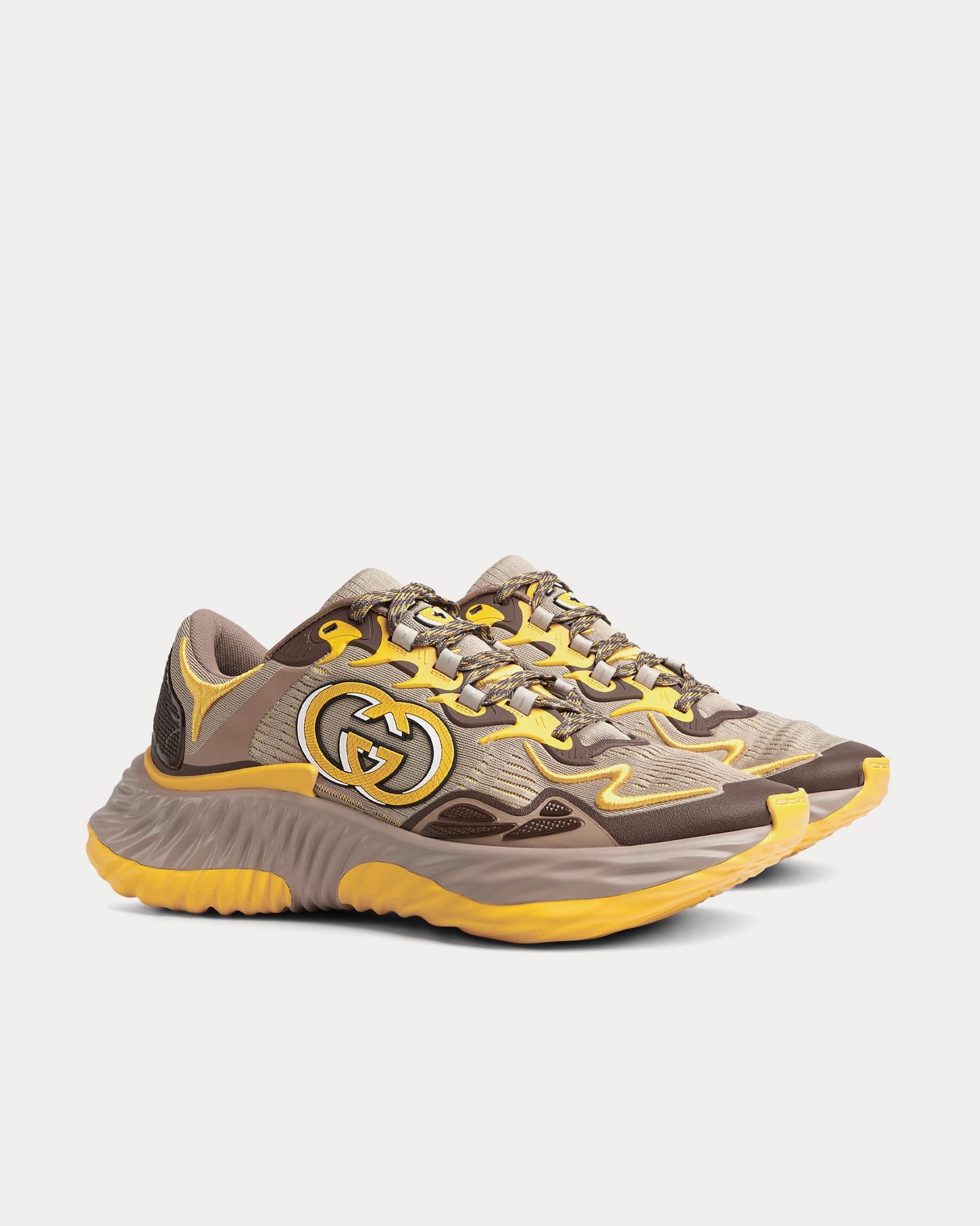 Les baskets basses pour hommes Gucci Ripple Mesh en beige et jaune présentent une tige en mesh respirant avec des détails brodés, des G entrelacés et des détails en caoutchouc éclair, un logo Gucci entrelacé sur les semelles en caoutchouc et un logo G entrelacé en caoutchouc. Fabriquées en Italie.