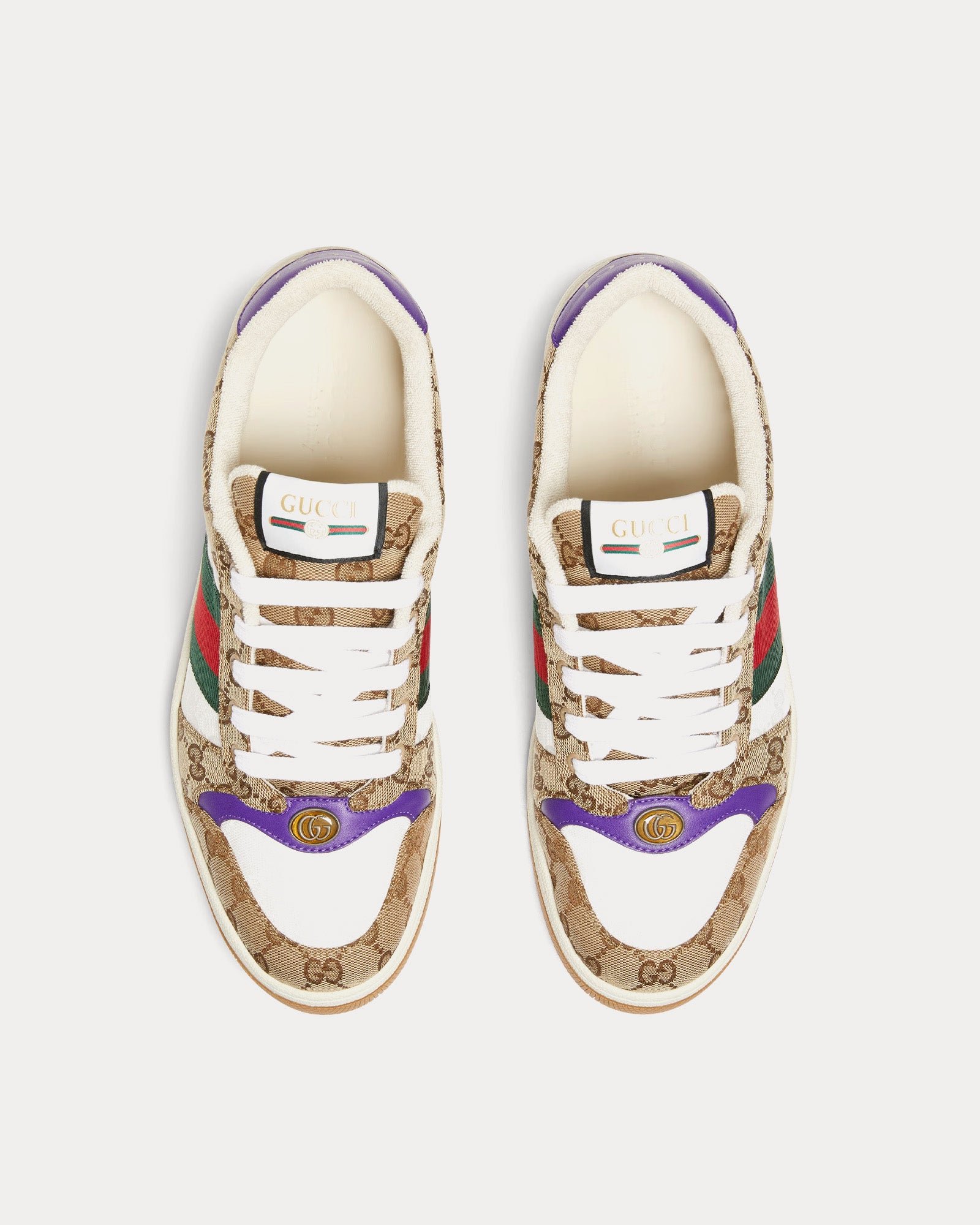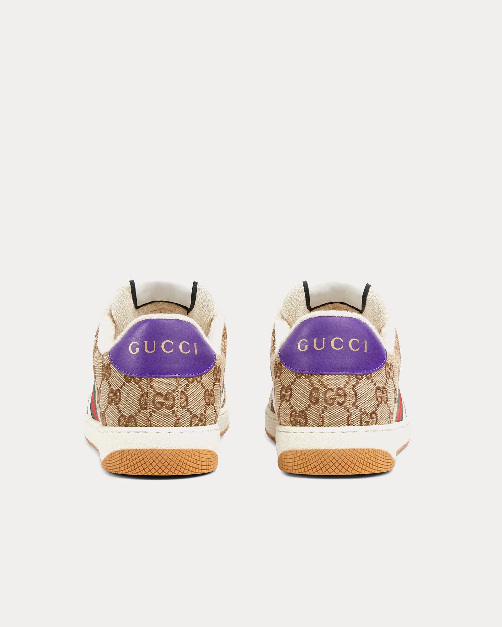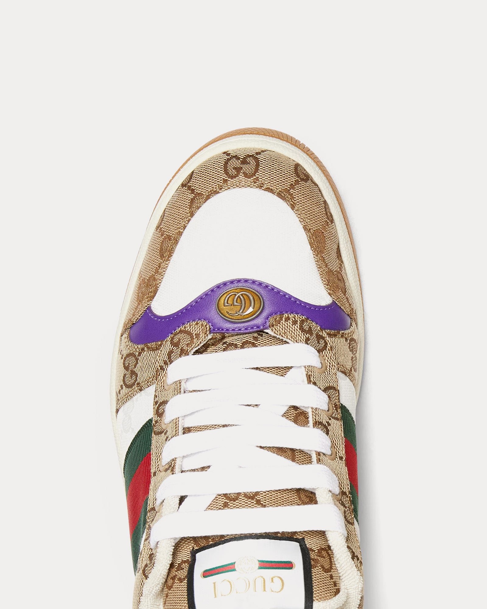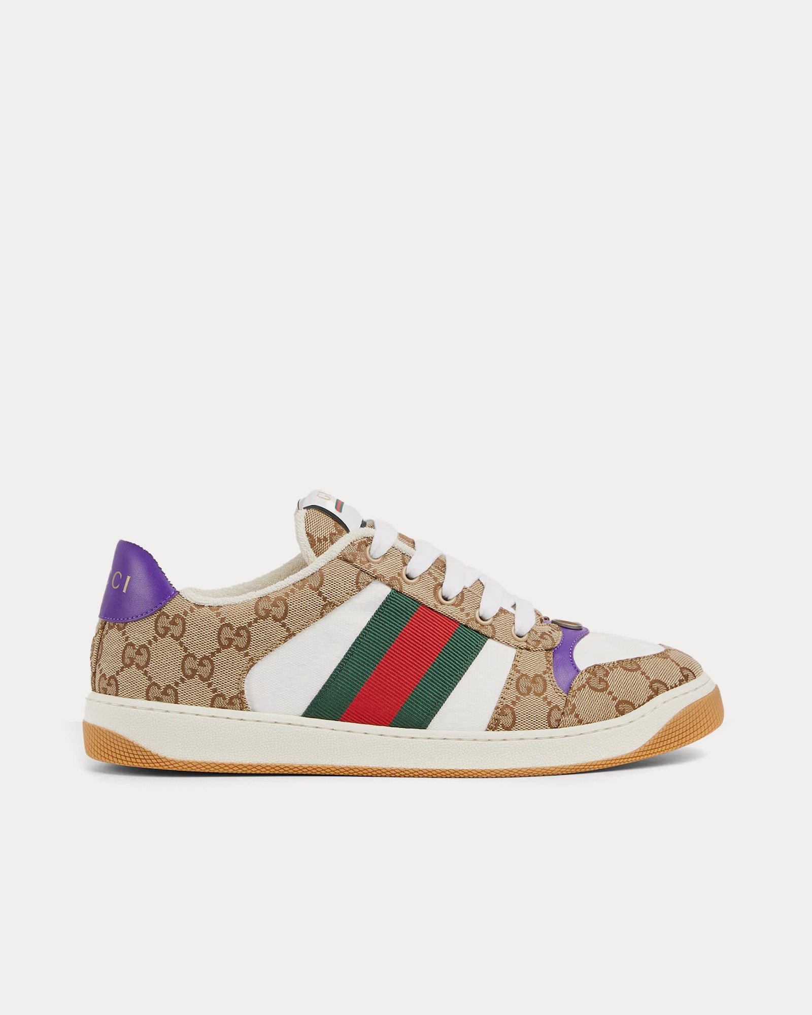 Les baskets basses pour homme Gucci Screener beige, marron foncé et violet s’inspirent des modèles classiques des années 1970 et présentent une tige en toile GG originale, une bande Web Gucci, des finitions en cuir, des détails ovales émaillés avec un double G en métal, une étiquette logo Gucci vintage et des semelles en caoutchouc. Fabriquées en Italie.