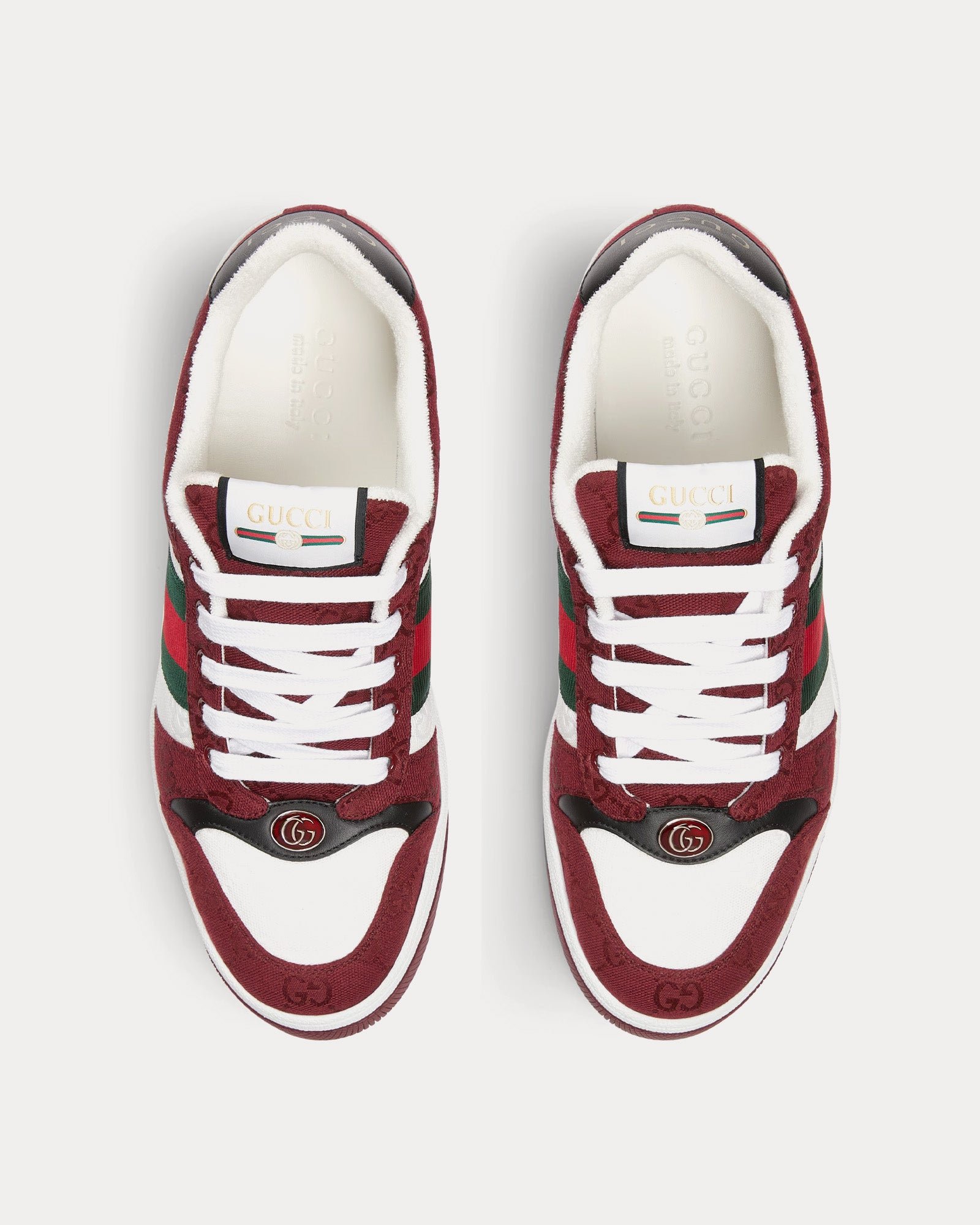 Les baskets basses pour homme Gucci Screener rouges et blanches s’inspirent des modèles classiques des années 1970 et présentent une tige en toile Rosso Ancora Original GG, une bande Web Gucci, des finitions en cuir, des détails ovales émaillés avec un double G en métal, une étiquette logo Gucci vintage et des semelles en caoutchouc. Fabriquées en Italie.