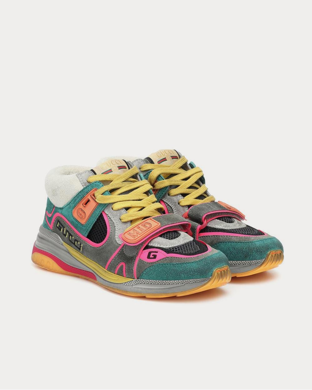 Inspirées des baskets de course classiques, les baskets Ultrapace de Gucci se présentent dans une silhouette mi-haute pour la nouvelle saison. Fabriquées en Italie, ces baskets dynamiques associent une palette de couleurs vives à du daim vieilli pour un effet vintage d’occasion, tandis que le logo de la marque est visible grâce à des broderies et des détails en caoutchouc.