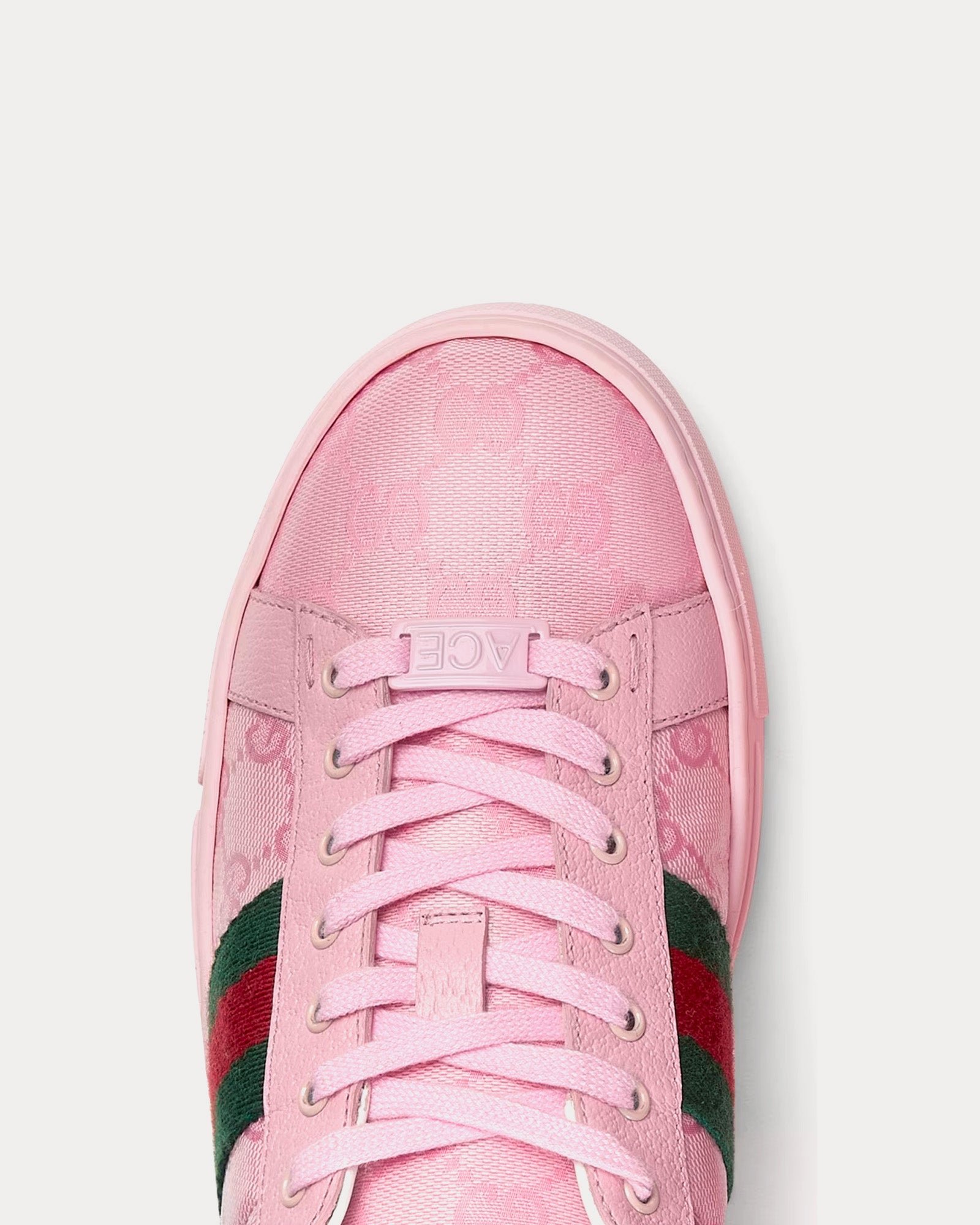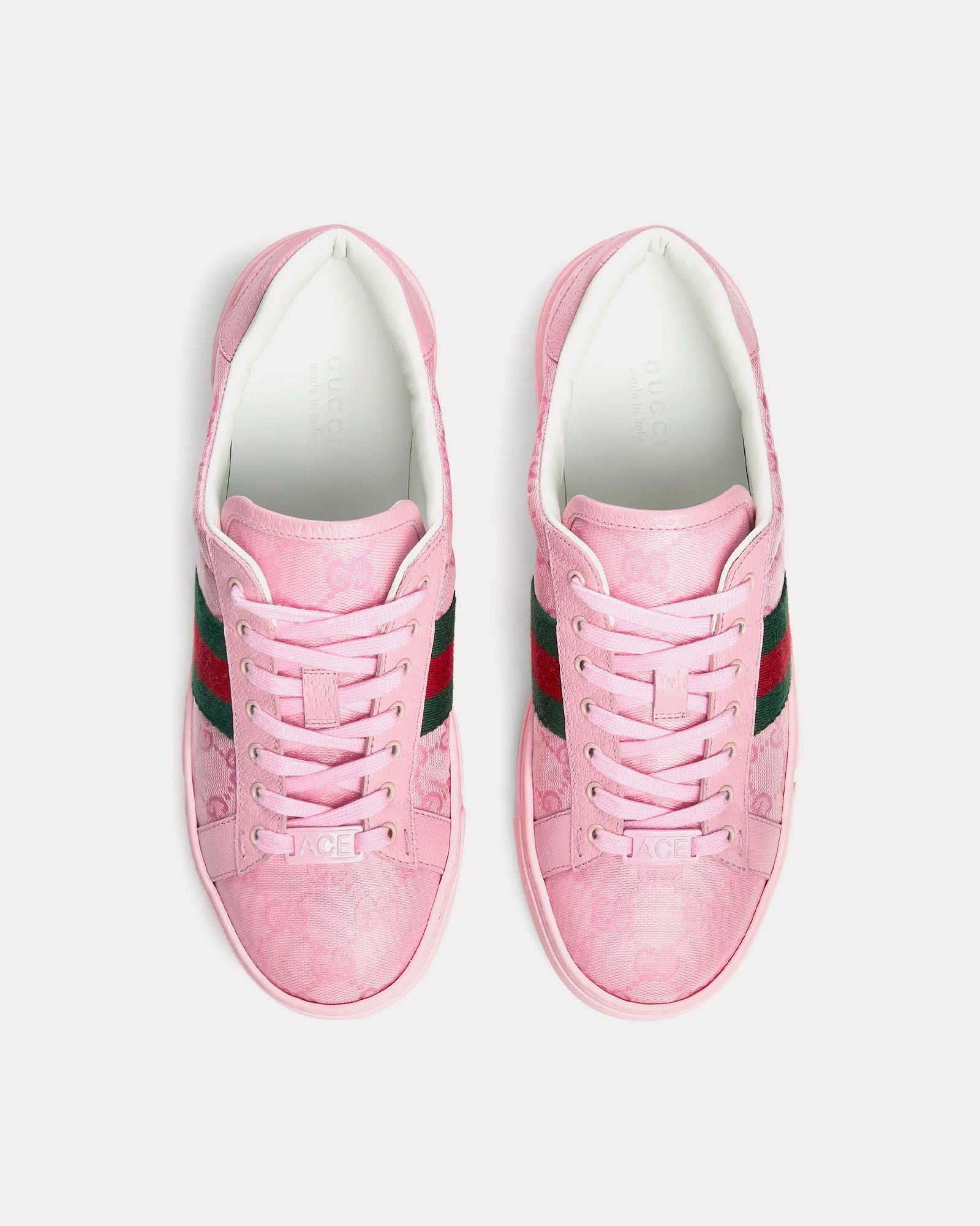 Les baskets basses pour femmes GucciAce GG Cystal Canvas en rouge présentent une tige en toile GG Crystal, une bande Web verte et rouge, une étiquette métallique « ACE », une semelle en caoutchouc ton sur ton et une fermeture à lacets. Fabriquées en Italie.