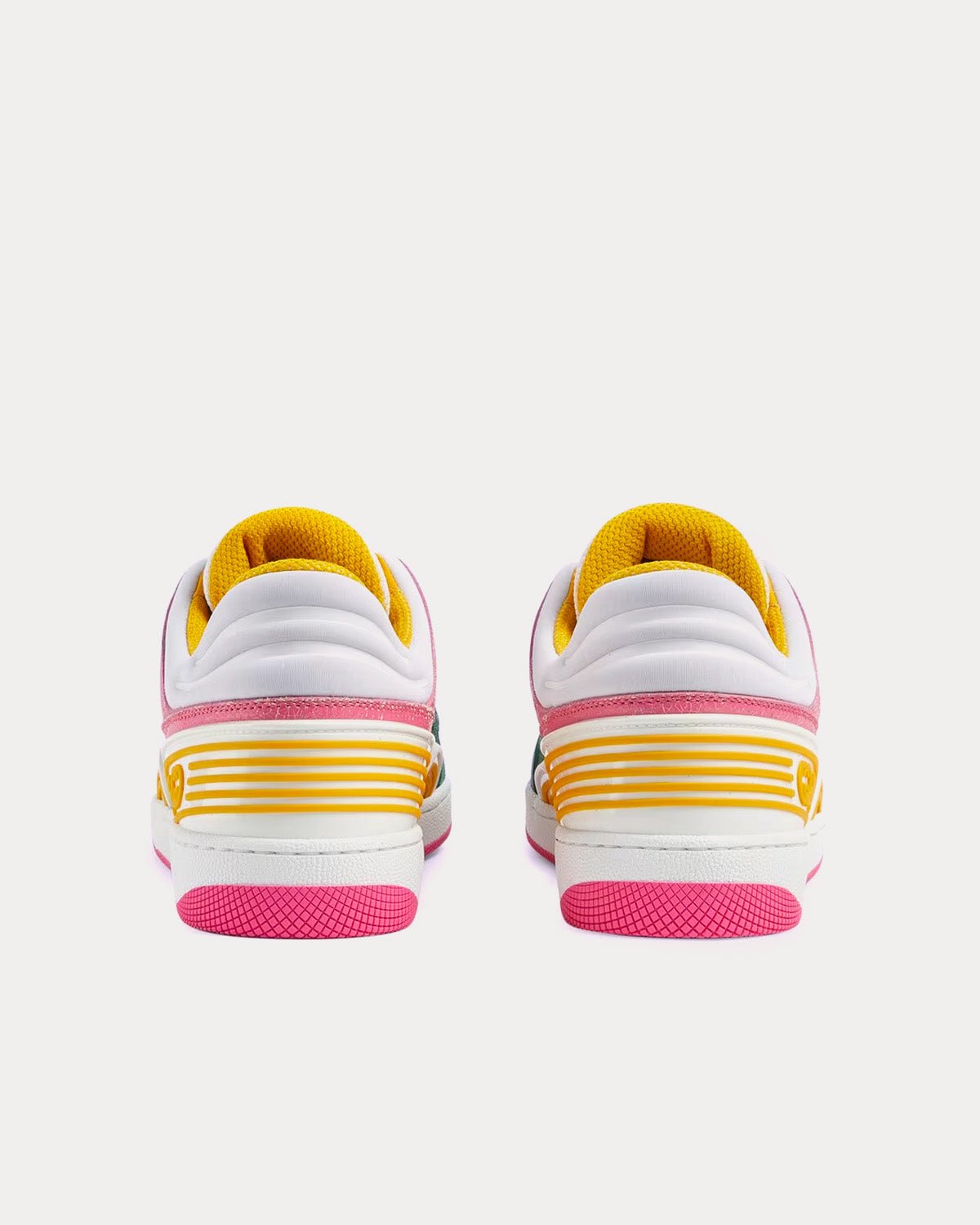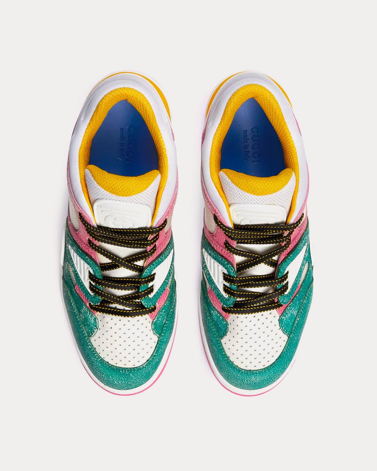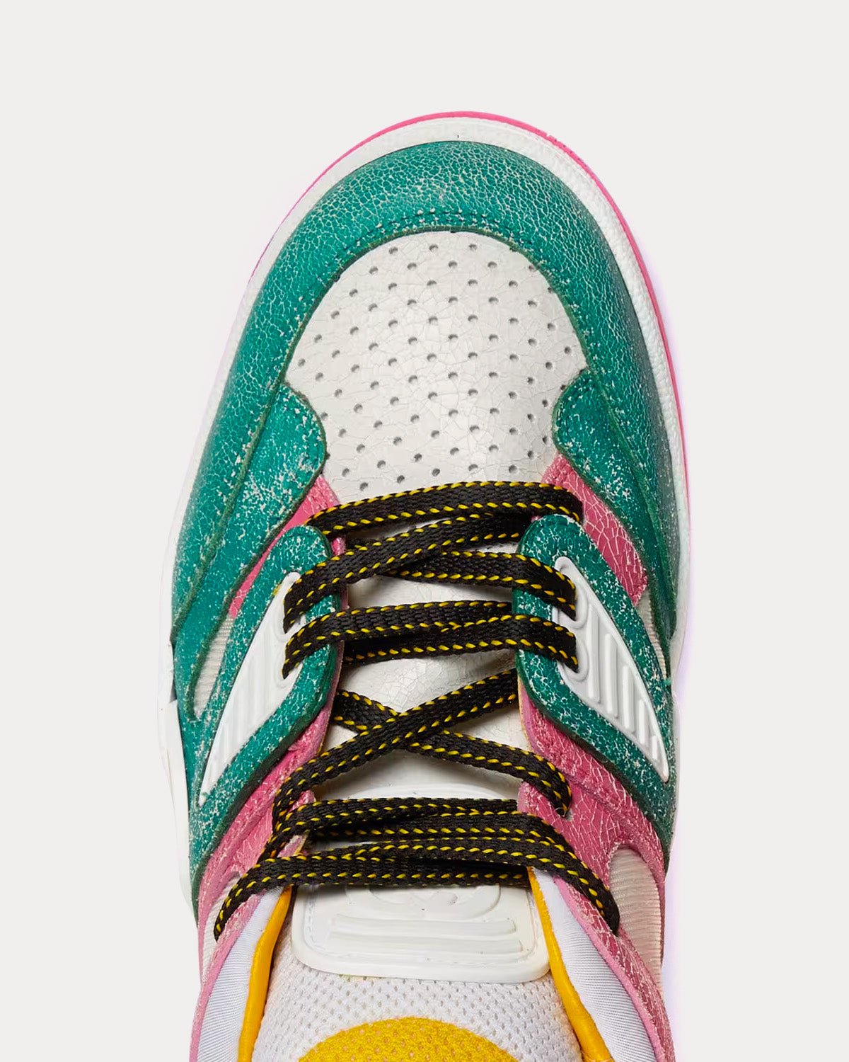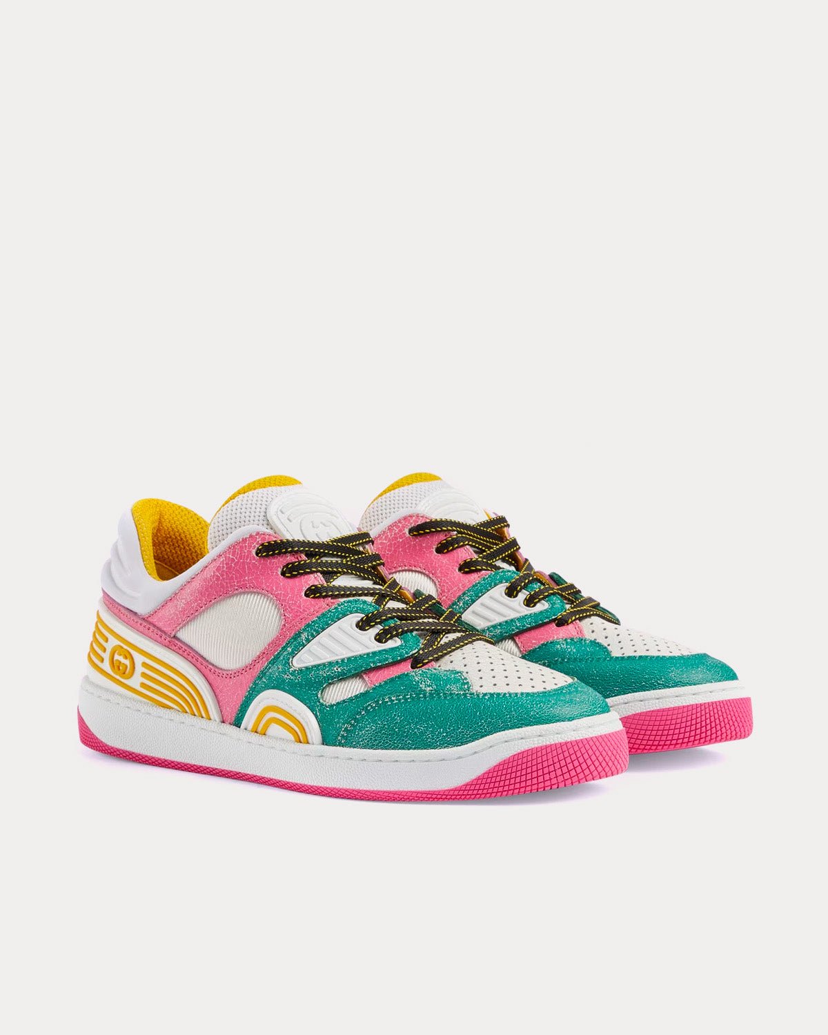 Baskets Gucci Basket Multi en cuir multicolore effet vieilli pour femme, avec bordure en caoutchouc jaune, semelle en caoutchouc et logo G entrelacé en caoutchouc sur le côté. Fermeture à lacets. Arborant un look emblématique des baskets de basket des années 90, la Maison présente de nouvelles interprétations de la basket Gucci Basket. Fabriquées en Italie.