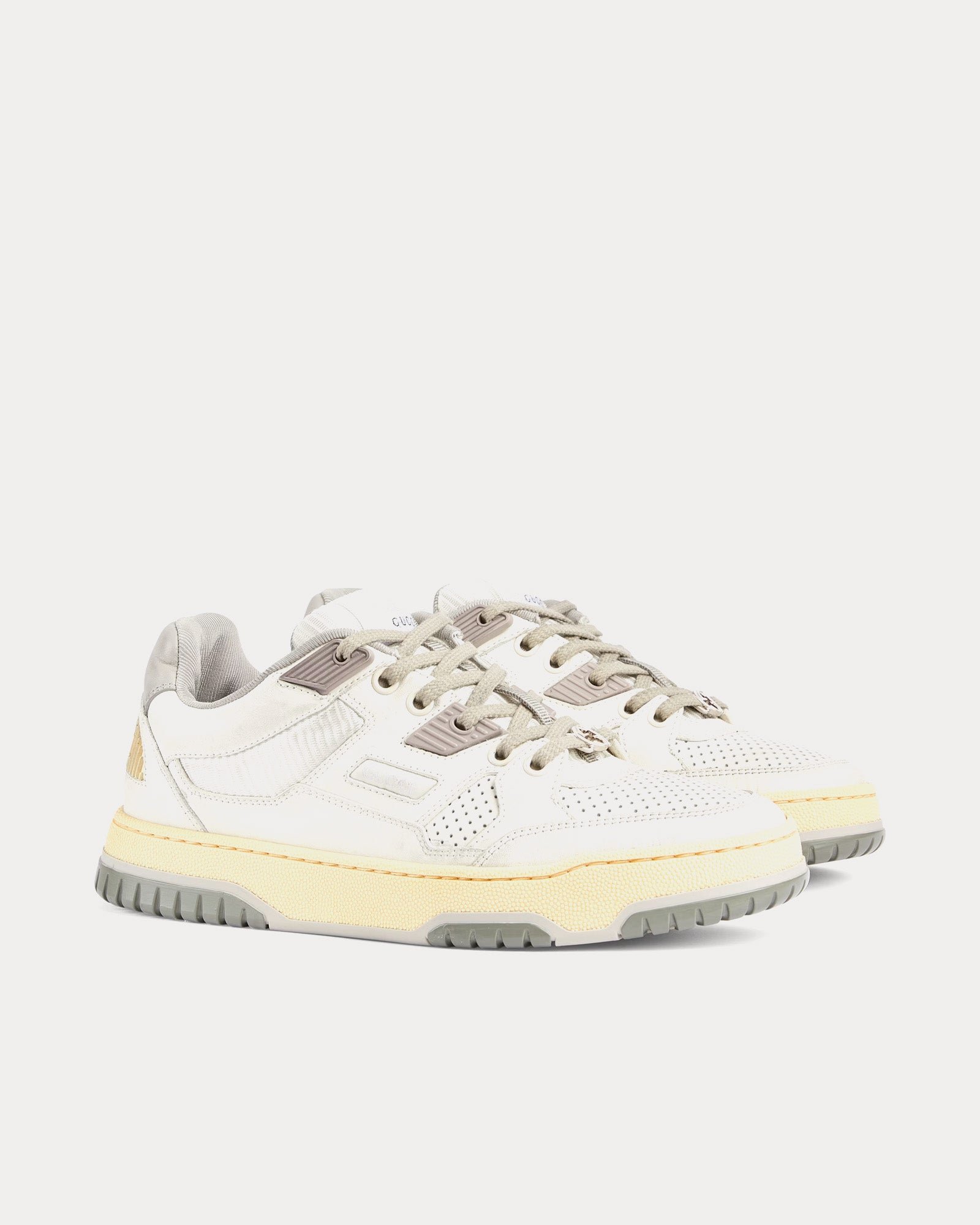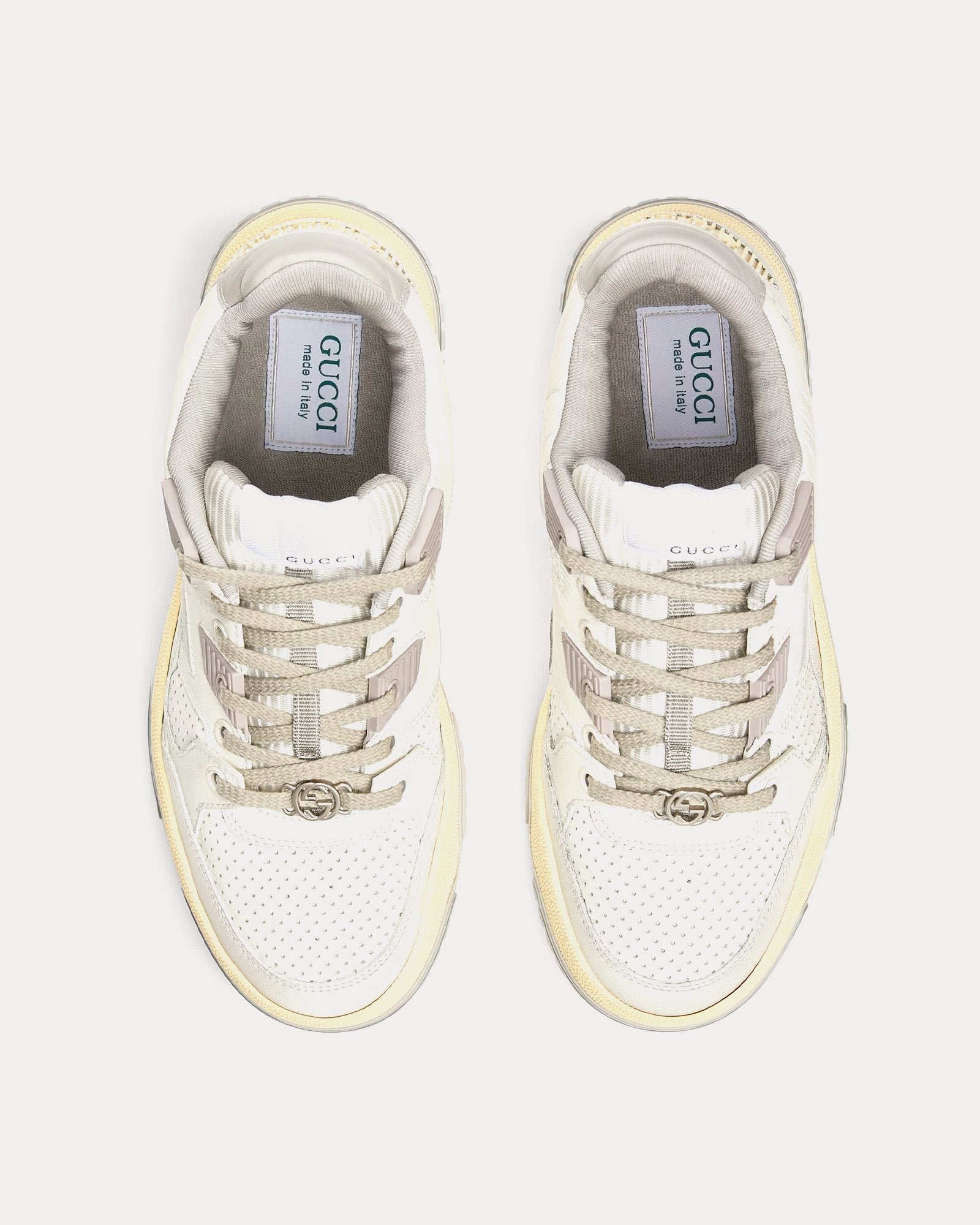Les baskets basses pour femme GucciDistressed Effect en blanc cassé et gris sont confectionnées en cuir et présentent des empiècements en tissu perforé, des détails en caoutchouc, l’inscription Gucci, un détail G entrelacé sur les lacets, des semelles en caoutchouc et une fermeture à lacets. Fabriquées en Italie.