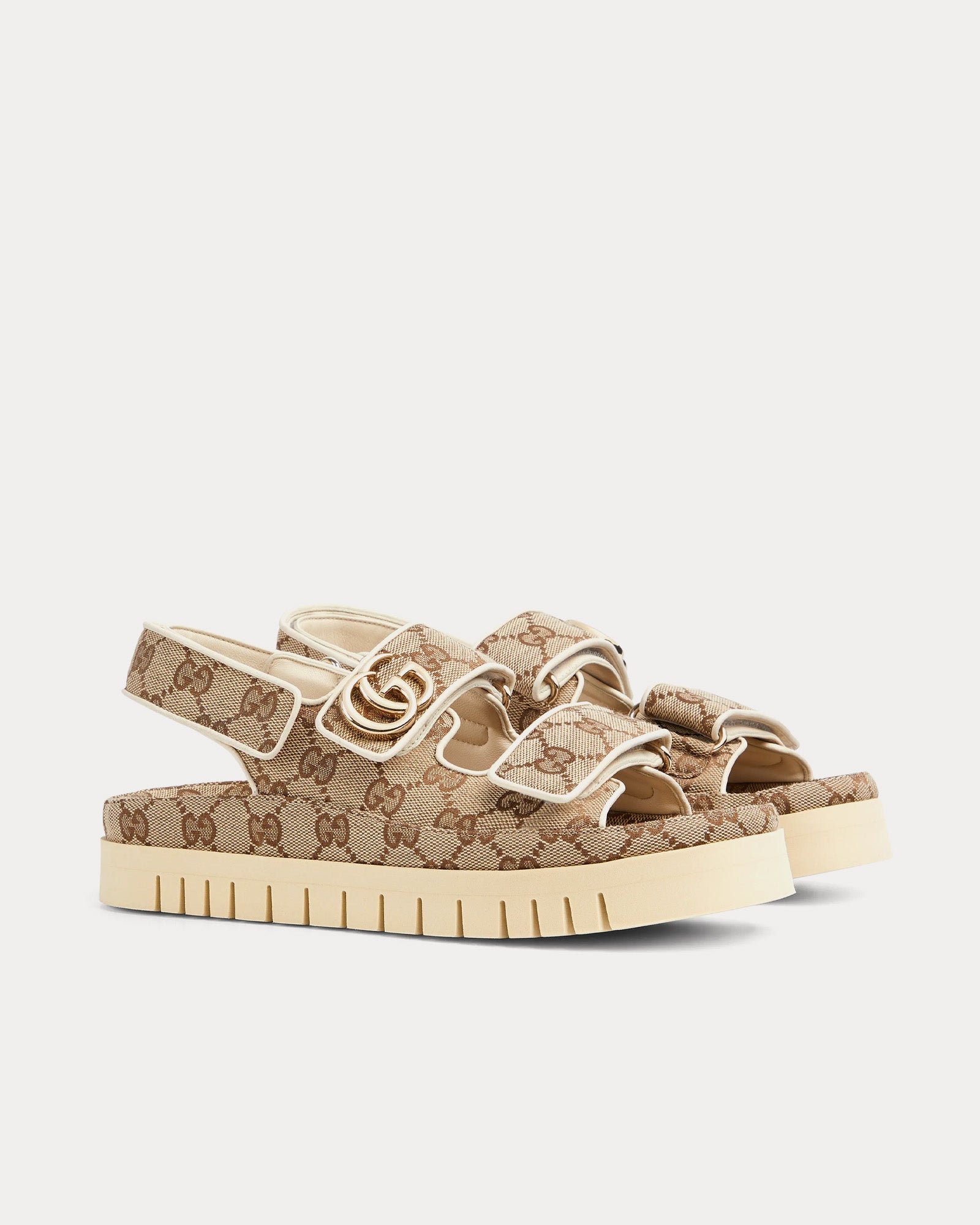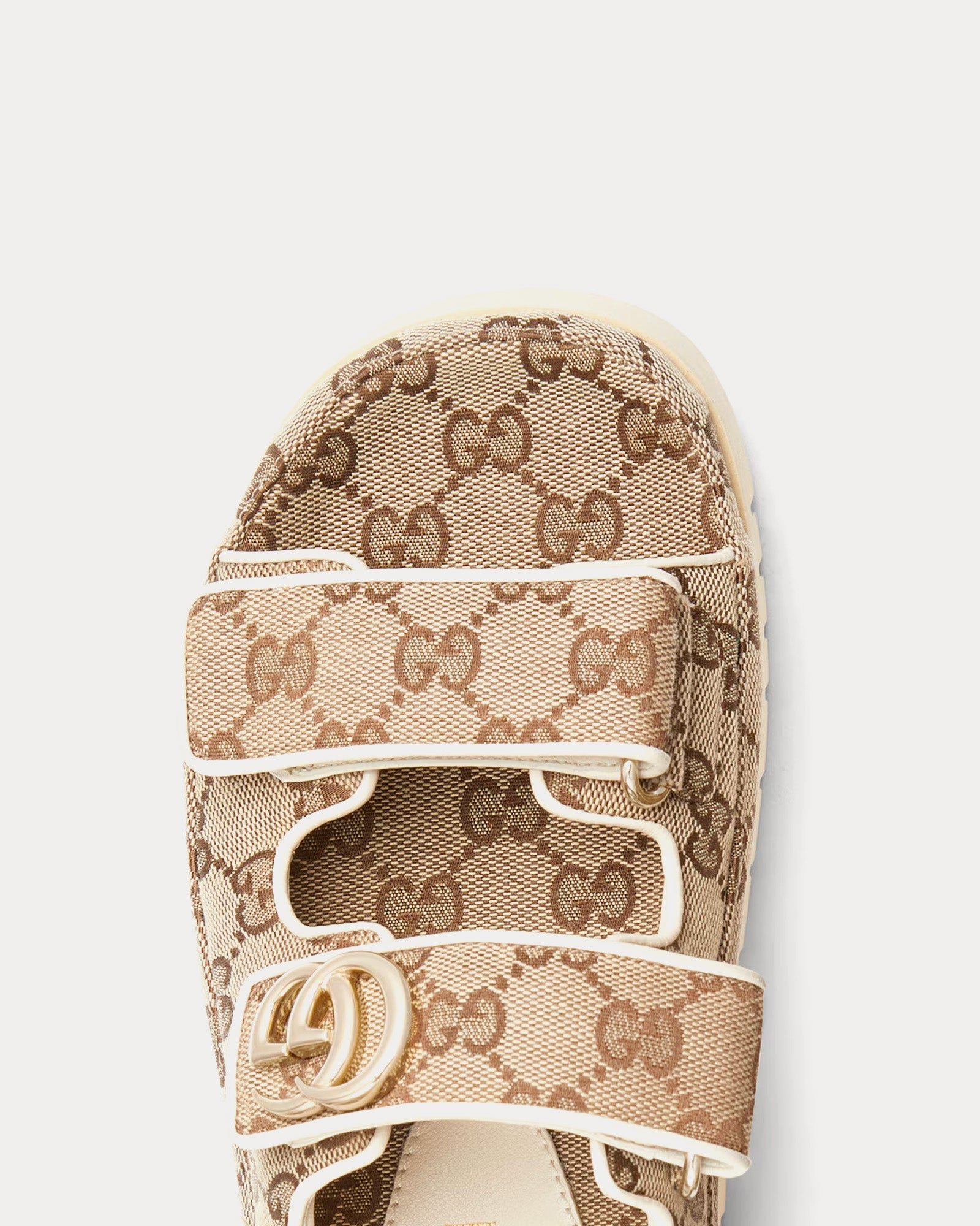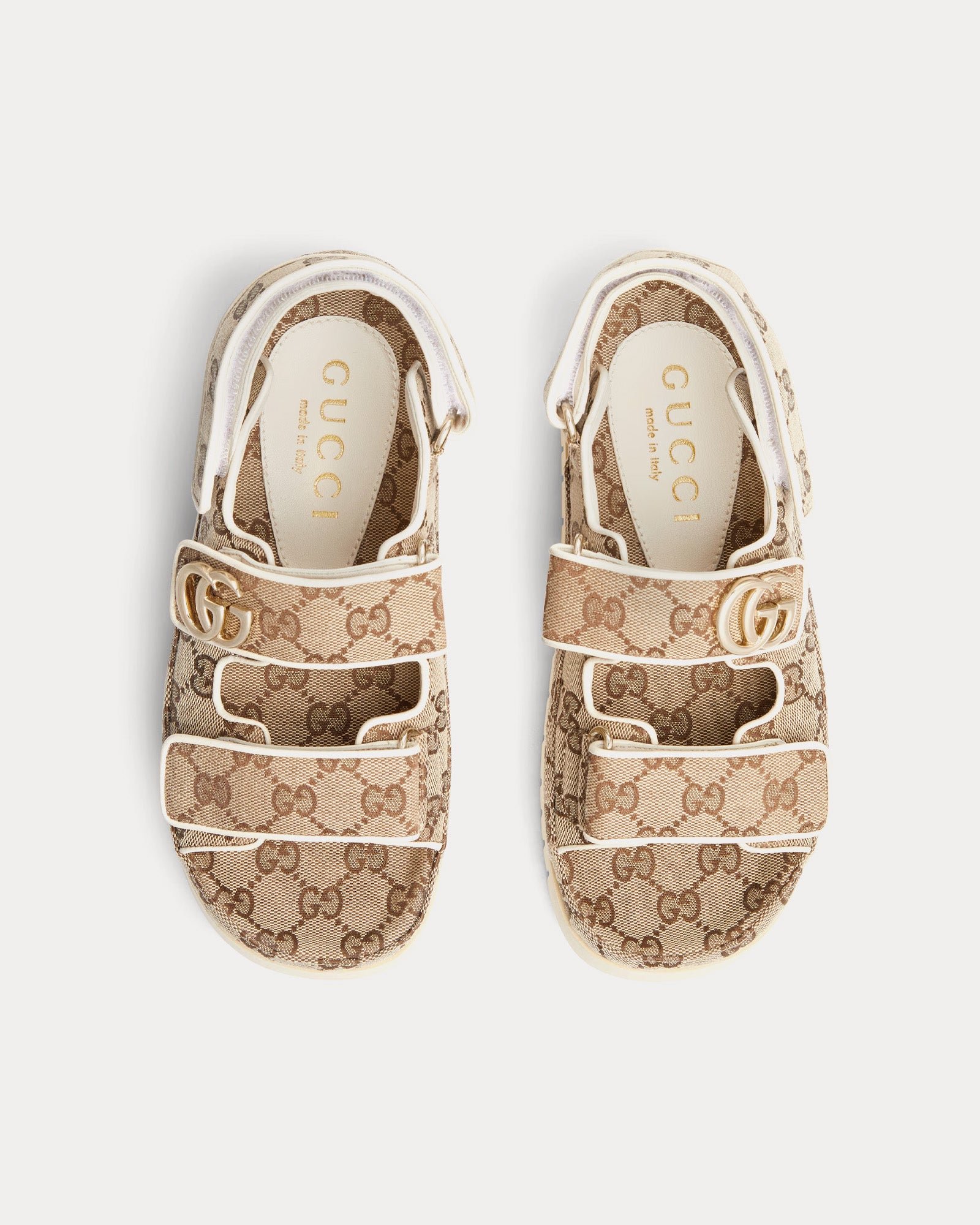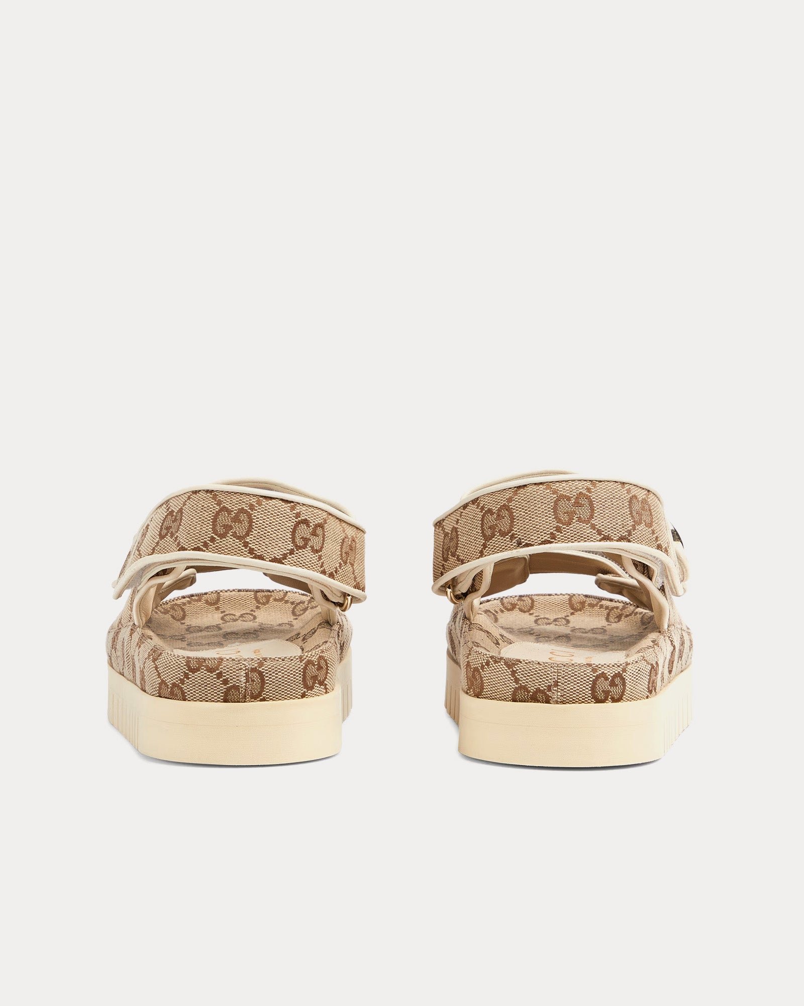 Les fermetures à scratch sur la tige et le talon offrent un maintien sûr et ajustable, tandis que la doublure en cuir assure un confort optimal tout au long de la journée. L’association d’un contraste marron foncé avec l’imprimé GG beige ajoute de la profondeur visuelle, conférant à la sandale une esthétique à la fois raffinée et décontractée. Une semelle en caoutchouc résistante renforce le look et offre une adhérence accrue, ce qui en fait un modèle idéal au quotidien.