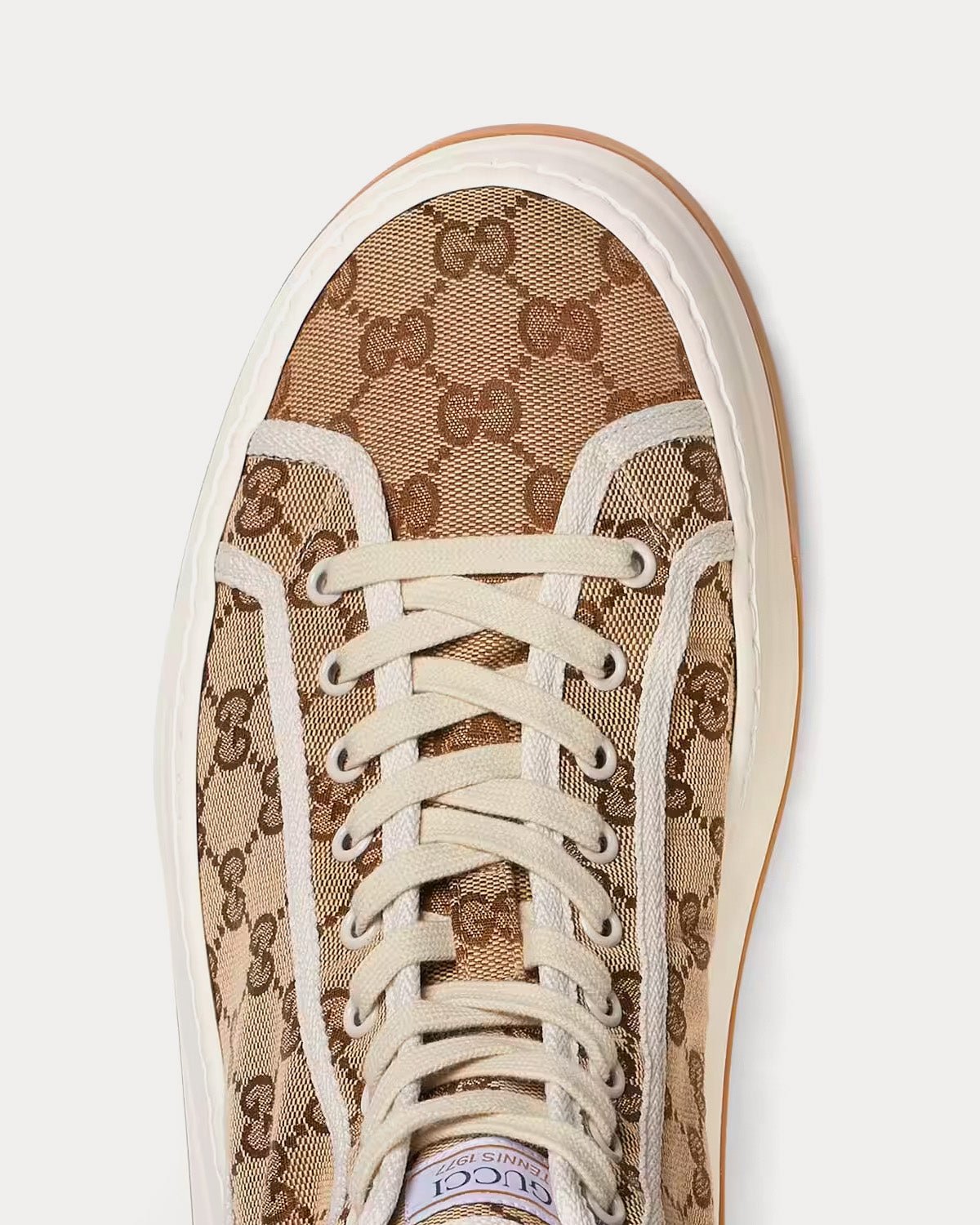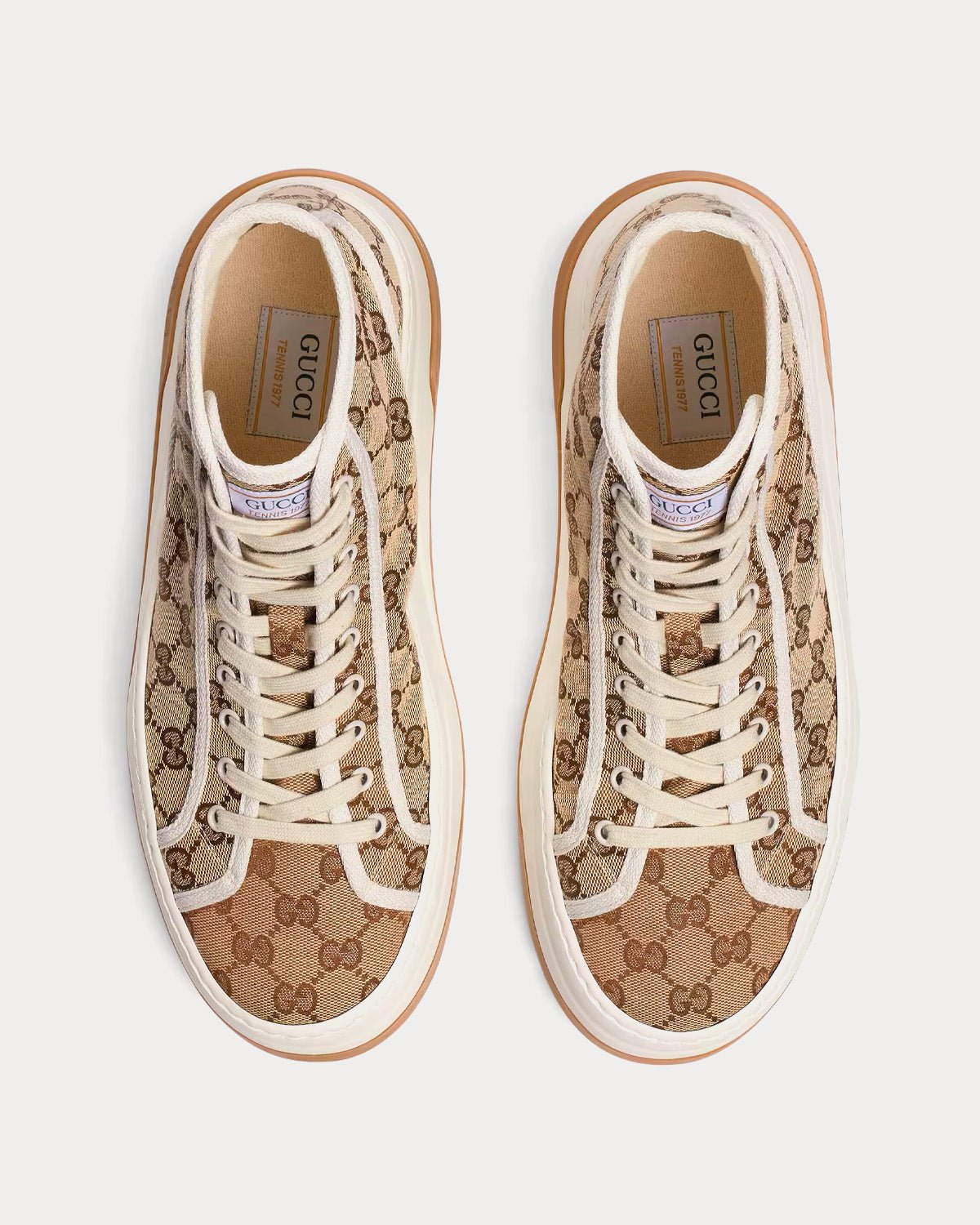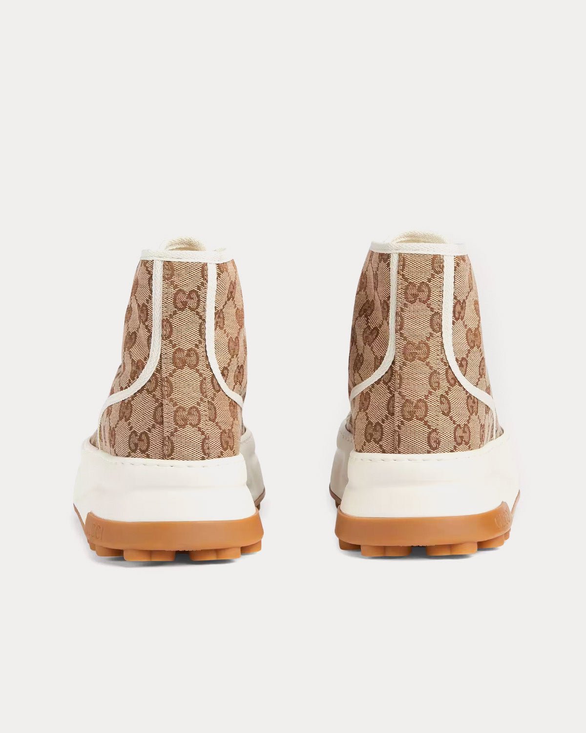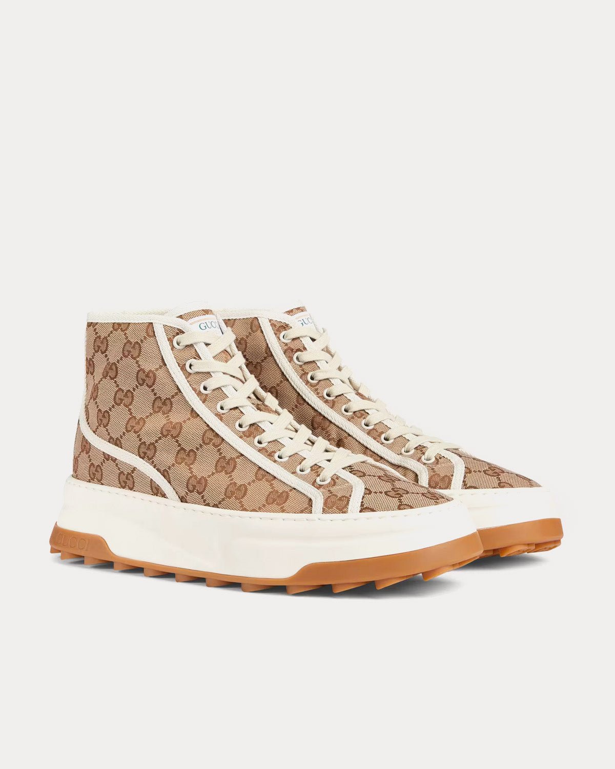 Les baskets montantes Gucci GG Canvas pour femmes sont dotées d’une toile GG originale beige et ébène, d’une bordure en gros-grain blanc et de semelles en caoutchouc avec adhérence G entrelacées. Fabriquées en Italie.