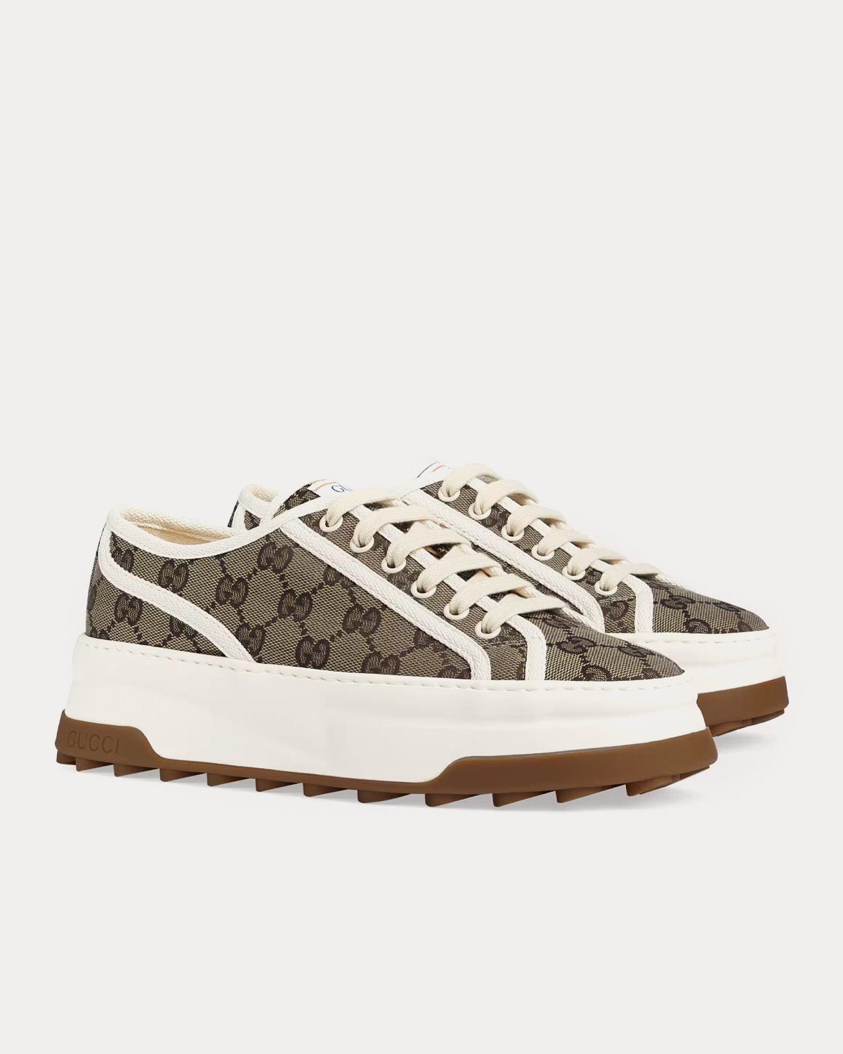 Les baskets basses pour femmes GucciGG Canvas en beige et ébène. La toile GG originale présente une silhouette de basket inspirée des courts de tennis, des bordures en gros-grain blanc et des semelles en caoutchouc avec adhérence en G entrelacés. Fabriquées en Italie.