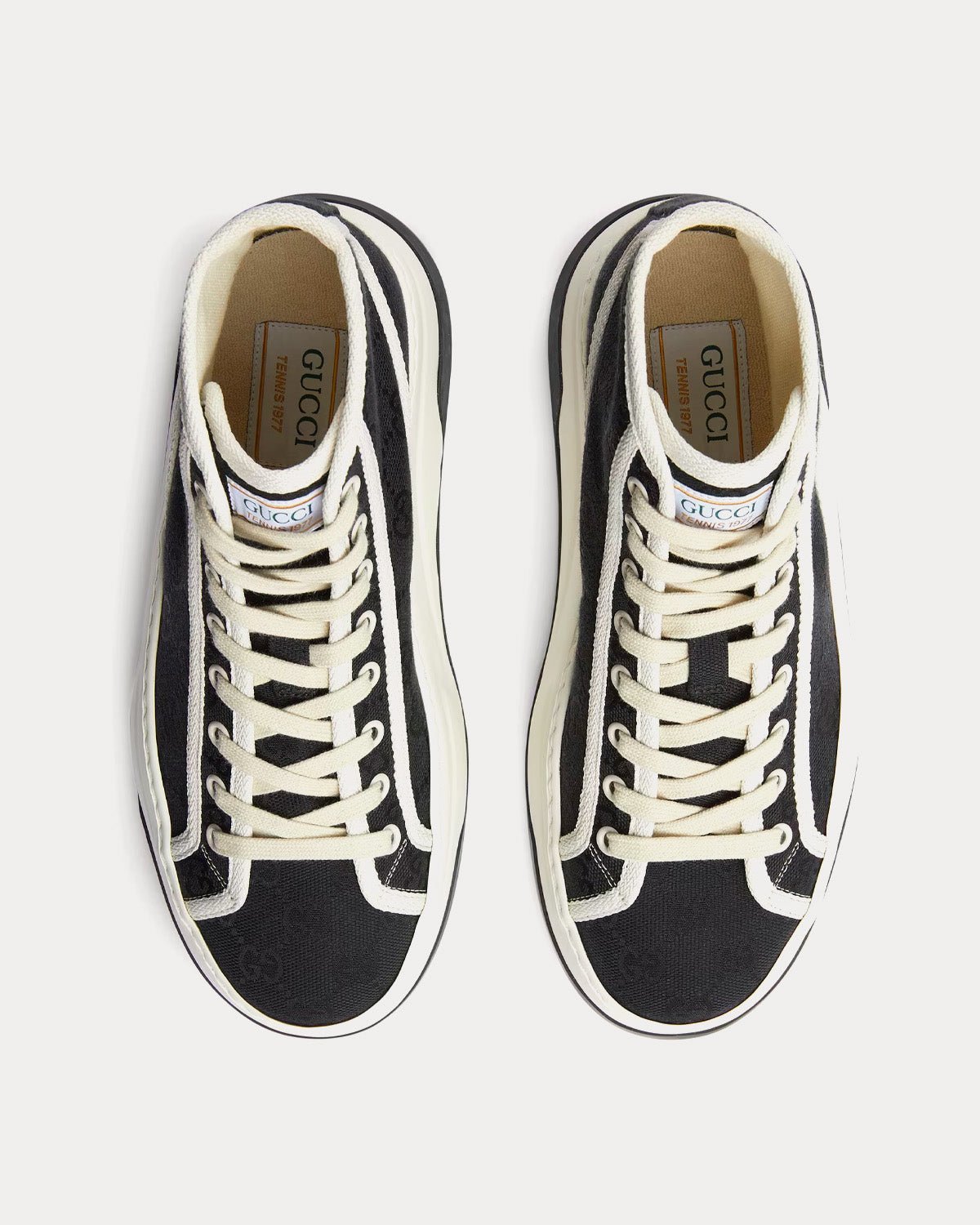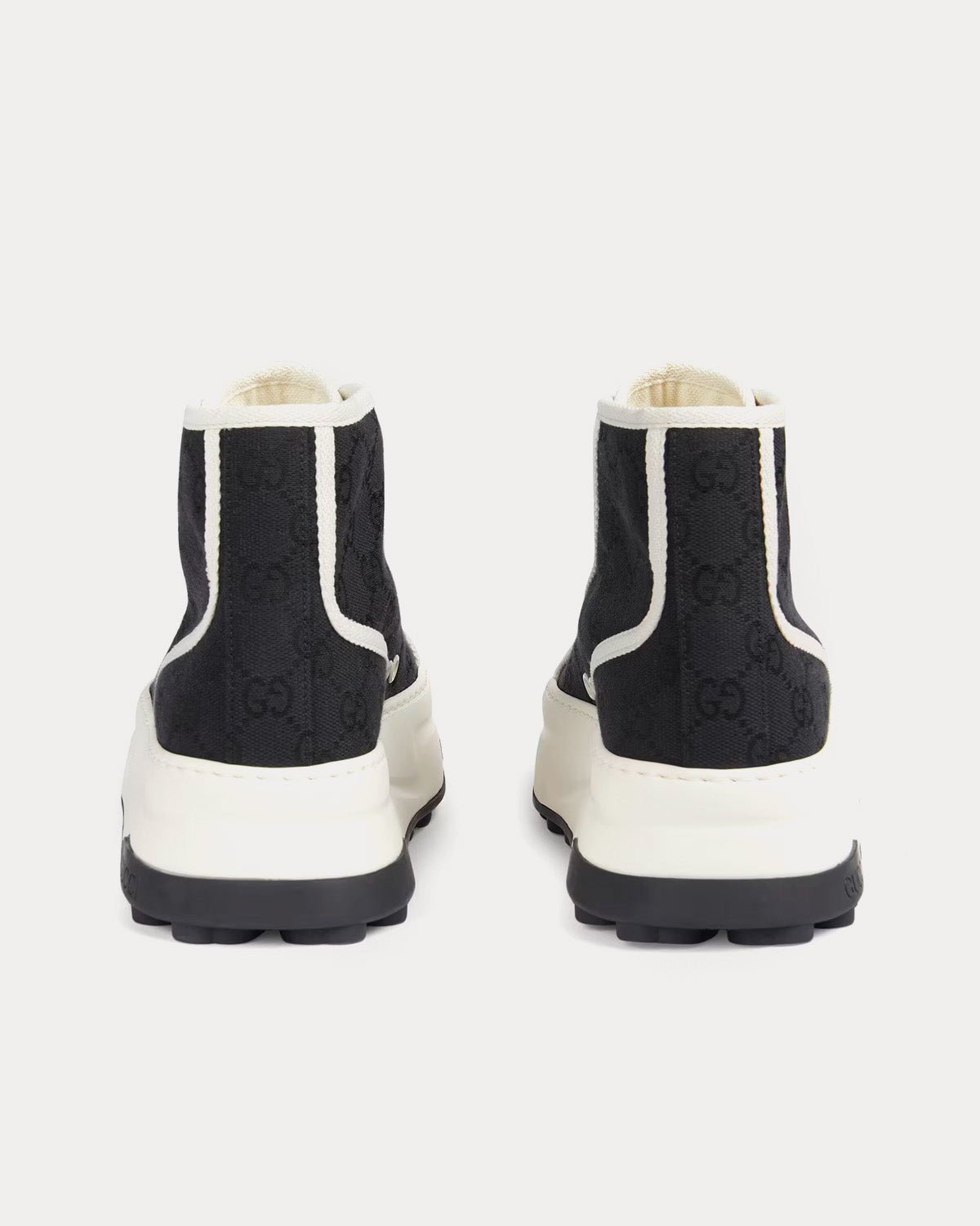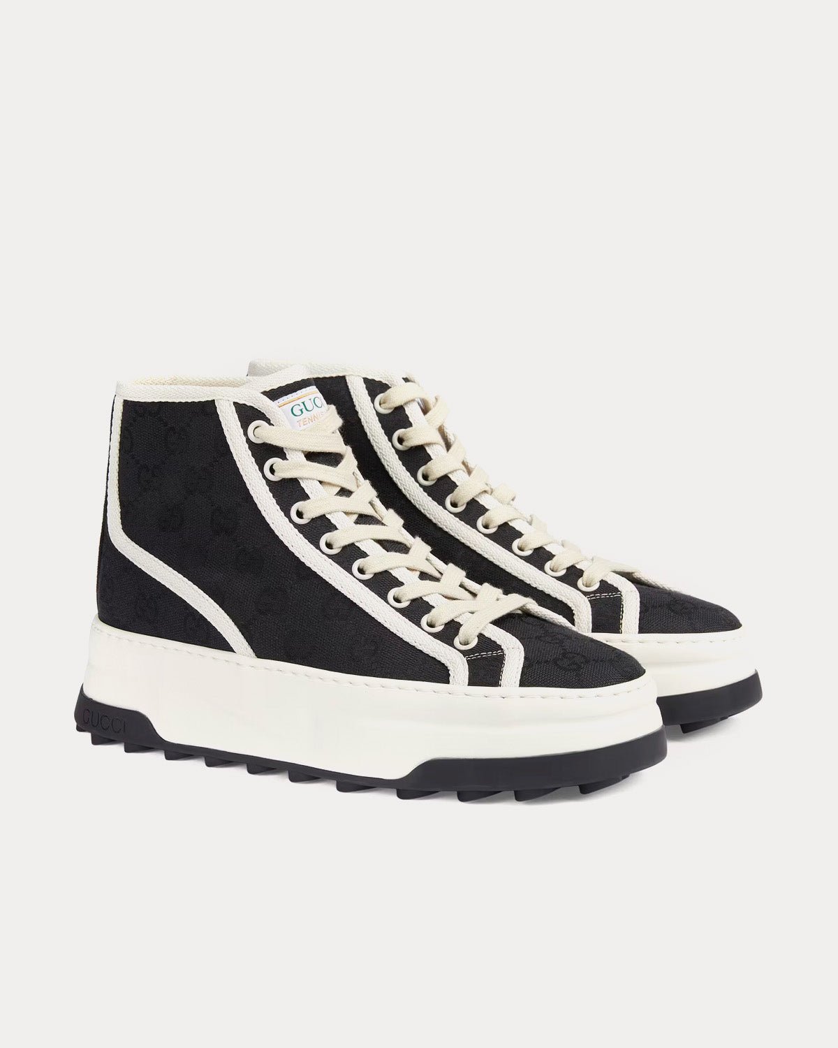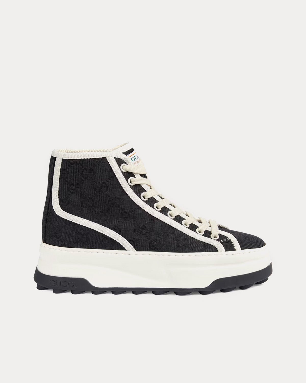 Les baskets montantes Gucci GG Canvas pour femmes sont dotées d’une toile GG noire, d’une bordure en gros-grain blanc et de semelles en caoutchouc avec adhérence G entrelacées. Fabriquées en Italie.