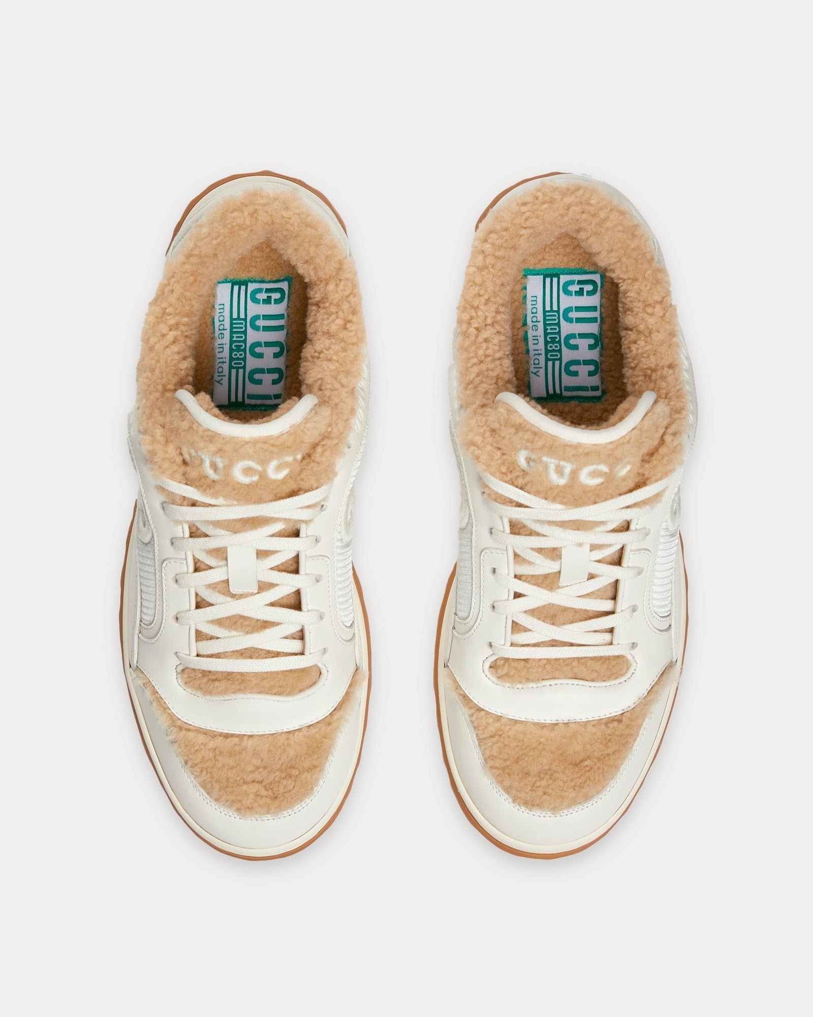 Les baskets basses pour femmes GucciMac80 en blanc cassé et beige sont confectionnées en cuir et en laine mérinos et présentent une broderie G entrelacé, une inscription Gucci brodée, un bout rond et des semelles en caoutchouc. Fabriquées en Italie.