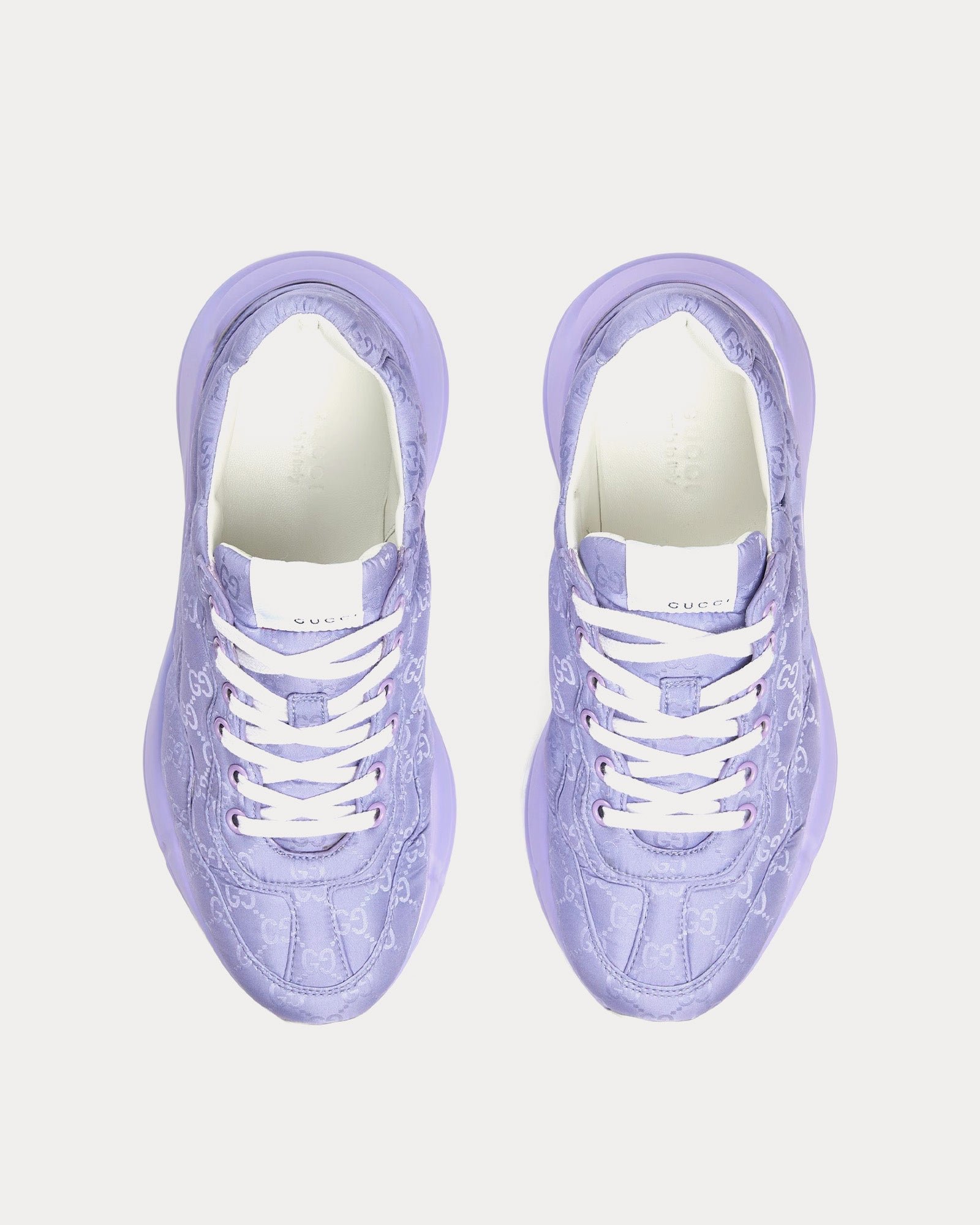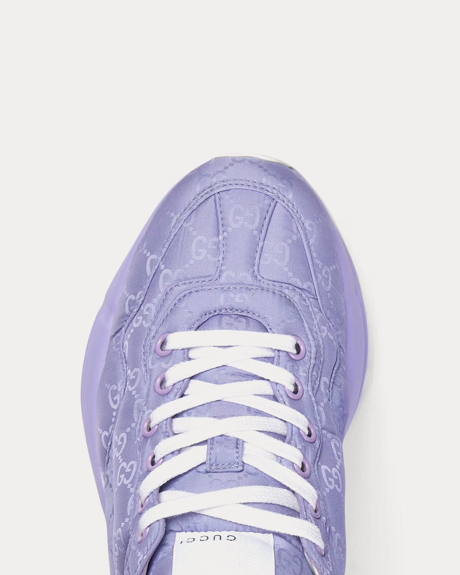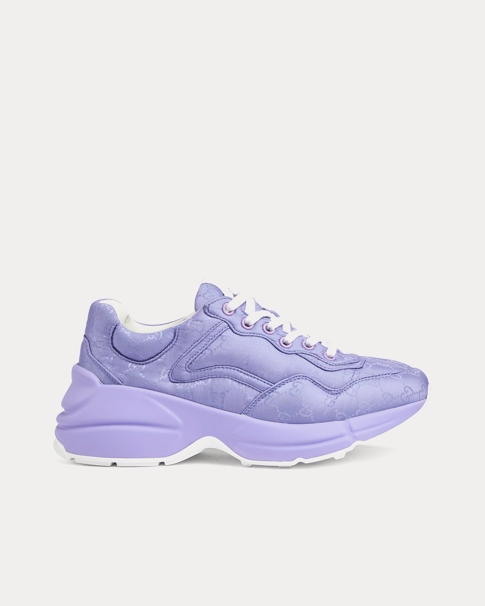 Les baskets basses pour femmes GucciRhyton en lilas sont confectionnées en nylon jacquard GG rembourré et présentent une étiquette logo Gucci, des semelles en caoutchouc, des lacets contrastants et des semelles surdimensionnées avec une construction épaisse. Fabriquées en Italie.