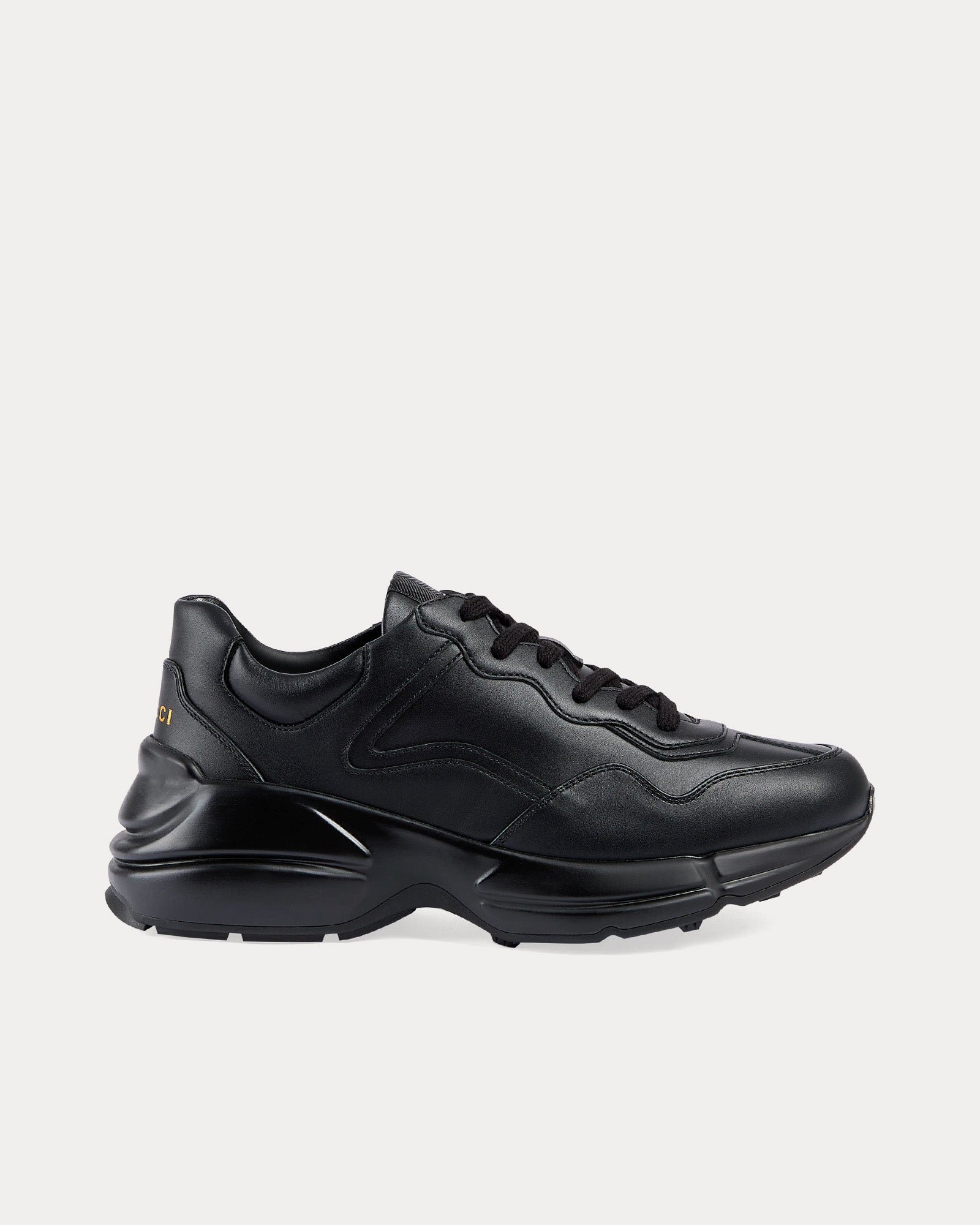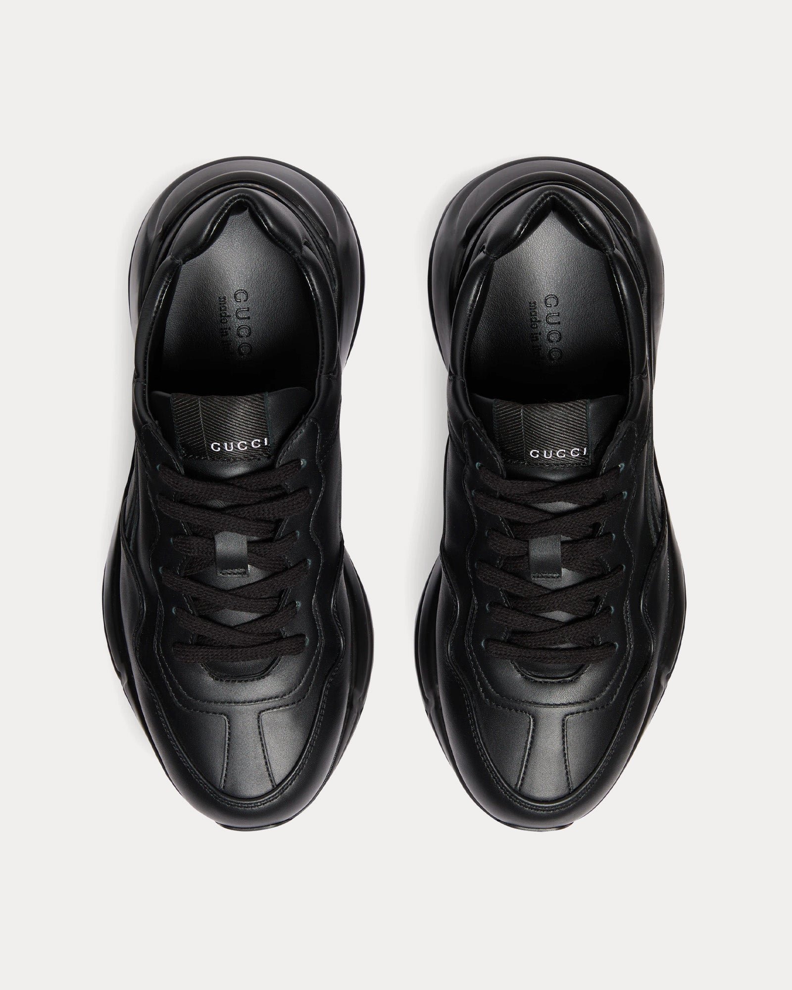 Les baskets basses pour femmes GucciRhyton en noir présentent un design élégant et sportif, des fermetures à lacets, un talon bas et des semelles en caoutchouc. Fabriquées en Italie.