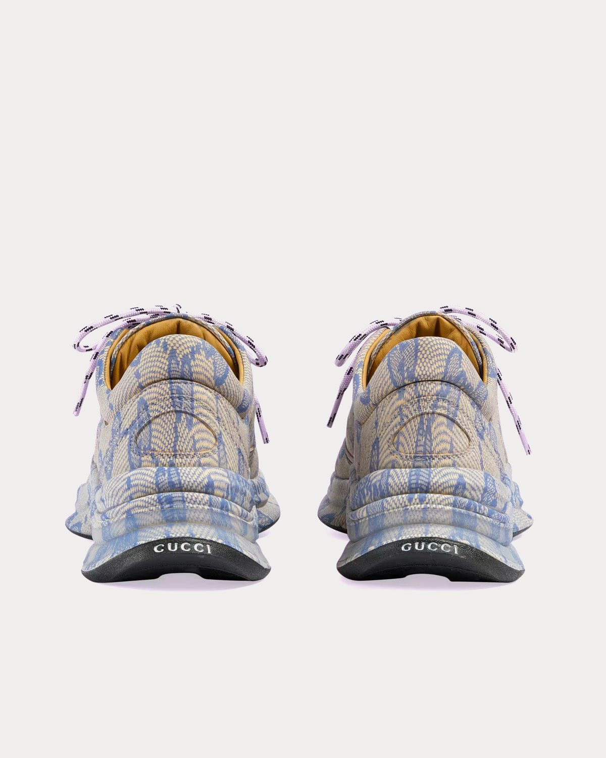 Baskets basses Gucci Run pour femme en cuir beige et bleu avec imprimé GG par transfert à l’eau, logo Gucci sur la semelle extérieure arrière et semelle en caoutchouc. Fabriquées en Italie.