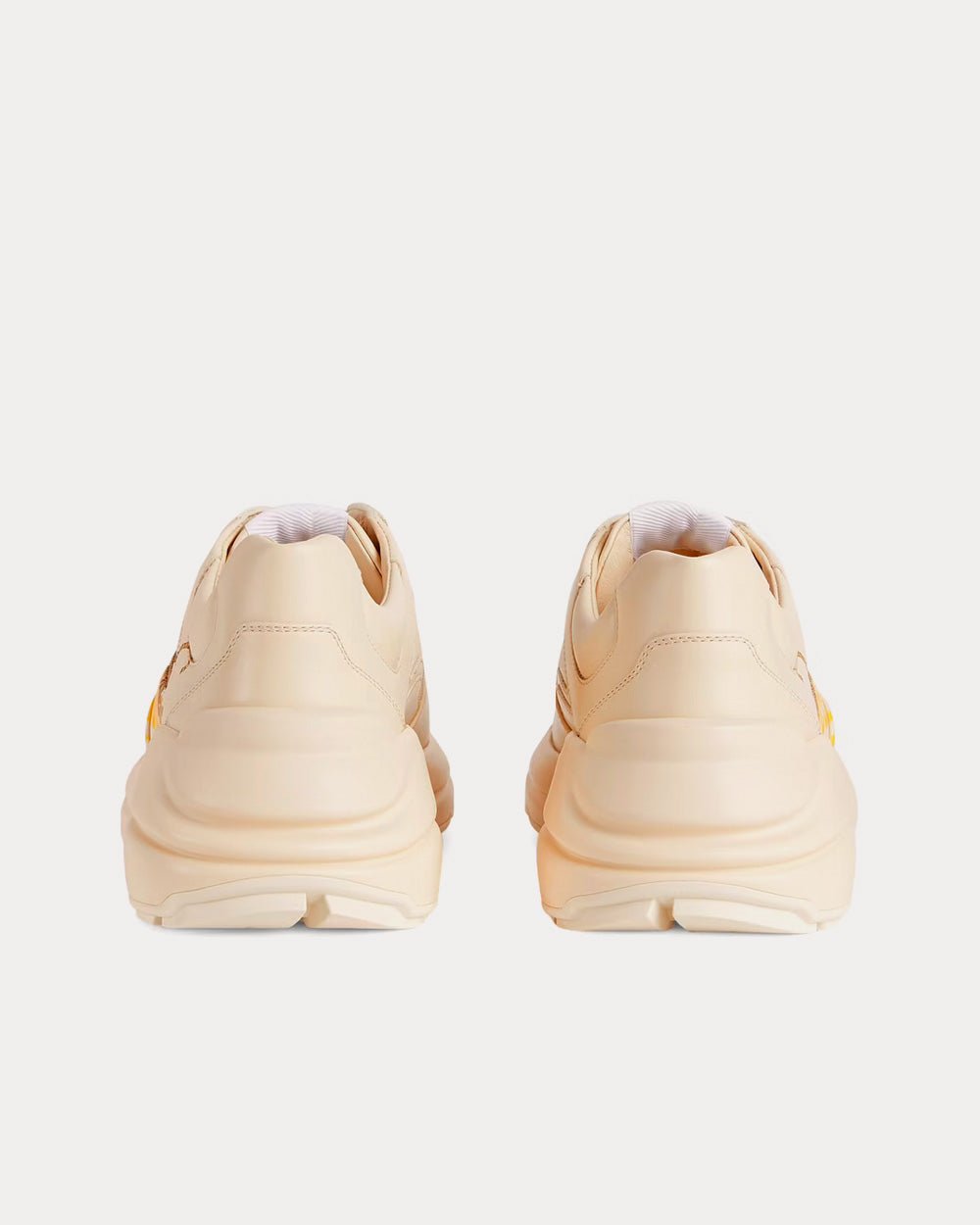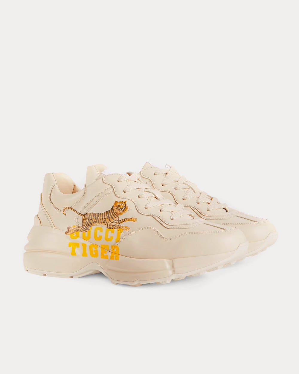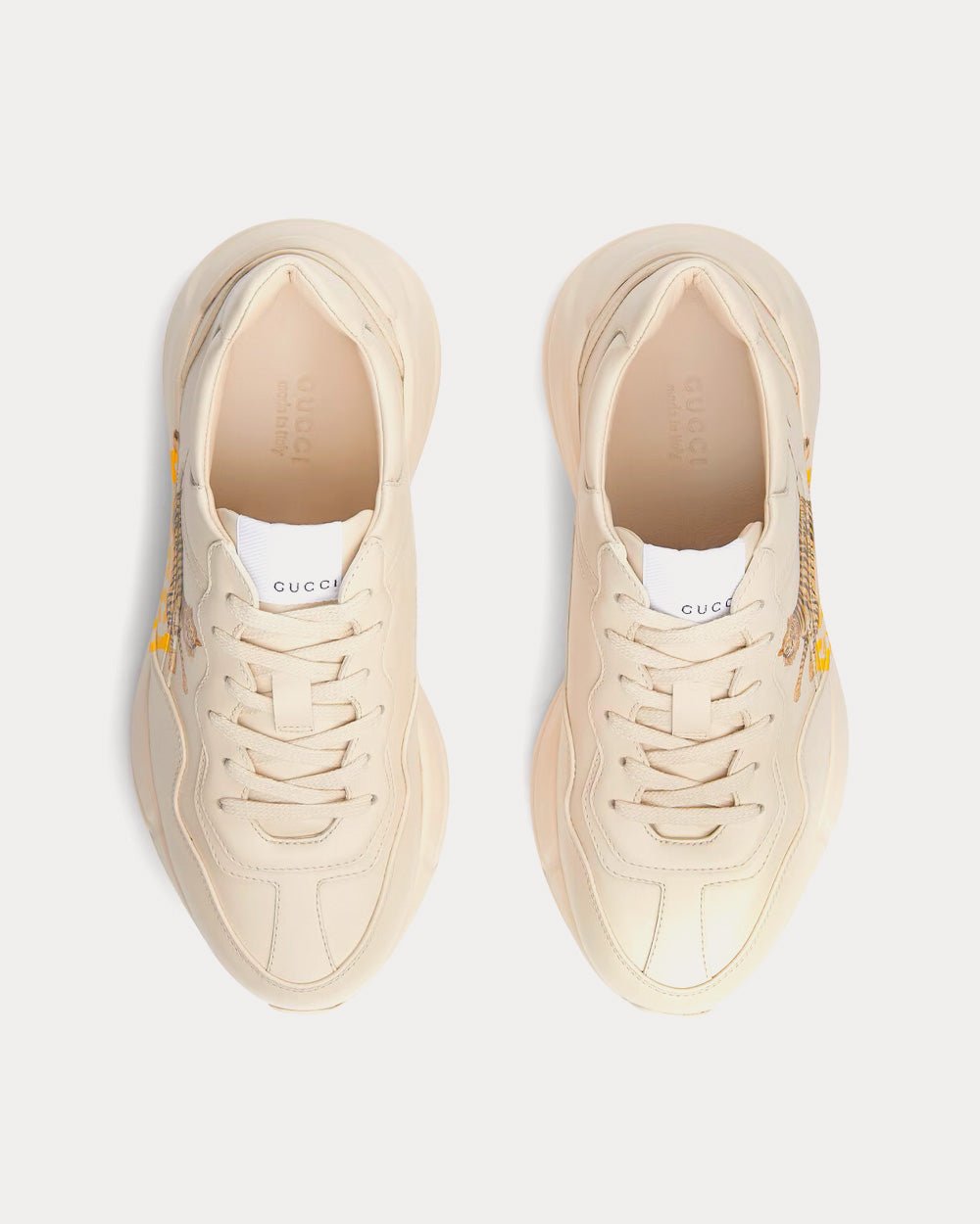 Cette paire de baskets Rhyton est ornée de la devise imprimée « Gucci Tiger ». Les références au félin sont fréquentes dans les collections du directeur artistique, exprimant la fascination de la Maison pour la beauté sauvage de la nature.