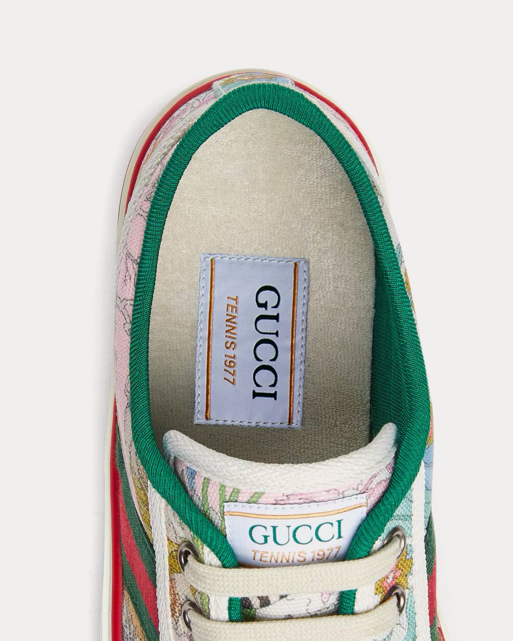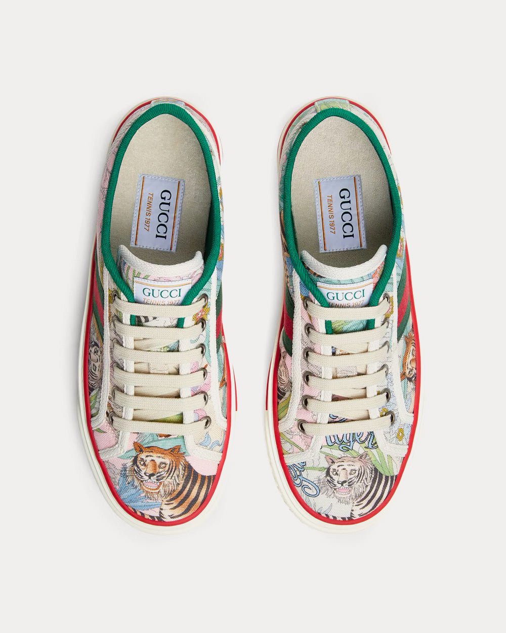 Gucci présente une réinterprétation d’un motif d’archive de la fin des années 1960, créé par Vittorio Accornero, l’artiste et illustrateur à l’origine de l’imprimé Flora emblématique de la Maison. Le tigre, motif récurrent dans les collections d’Alessandro Michele, exprime la fascination de la Maison pour la beauté sauvage de la nature. Ici, le félin incarne cette paire de baskets Gucci Tennis 1977.