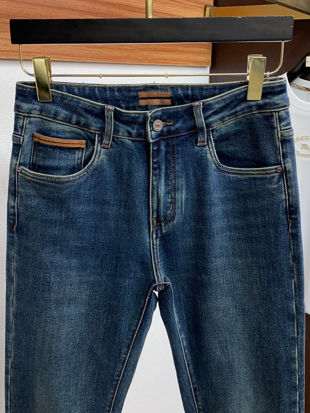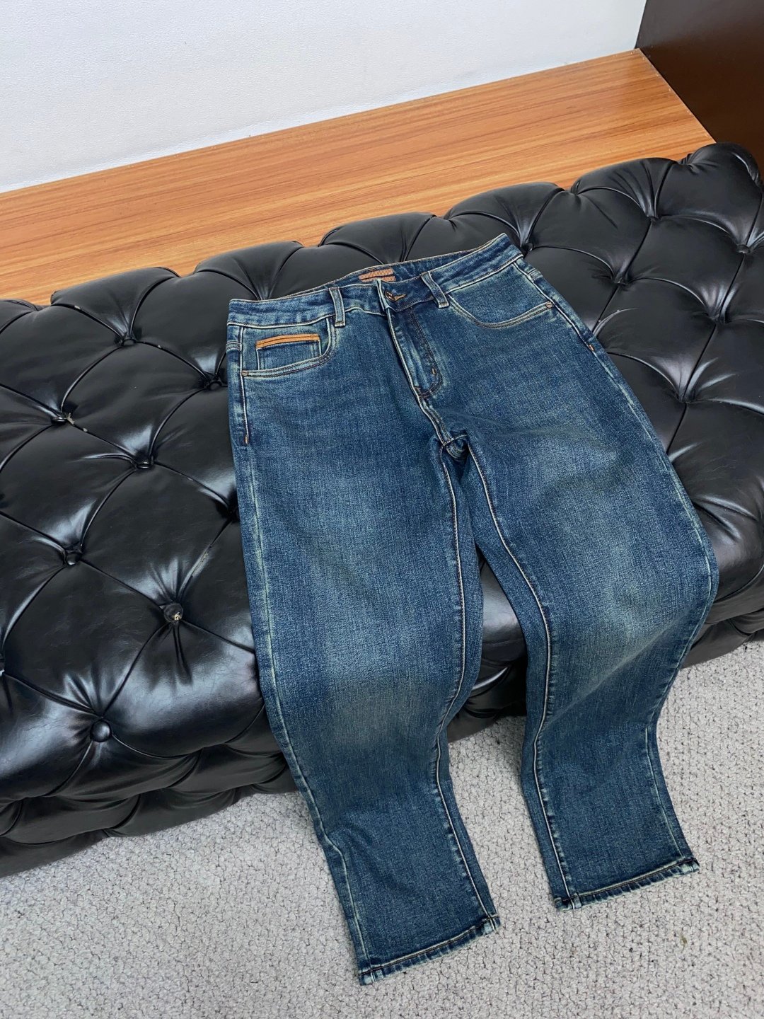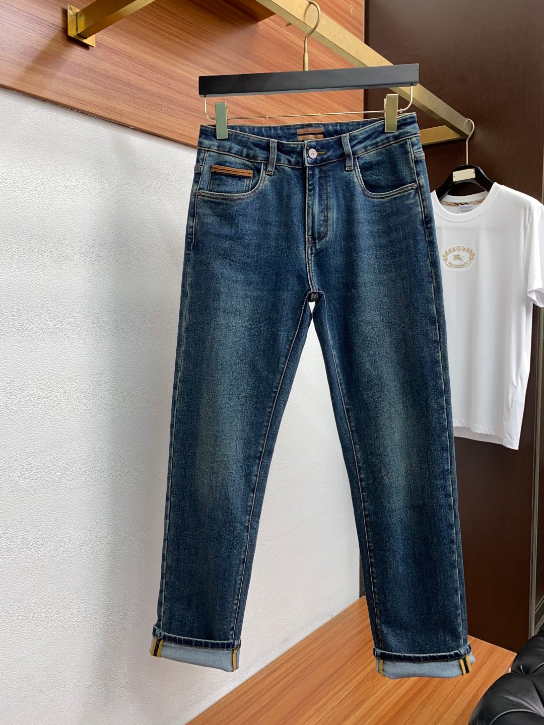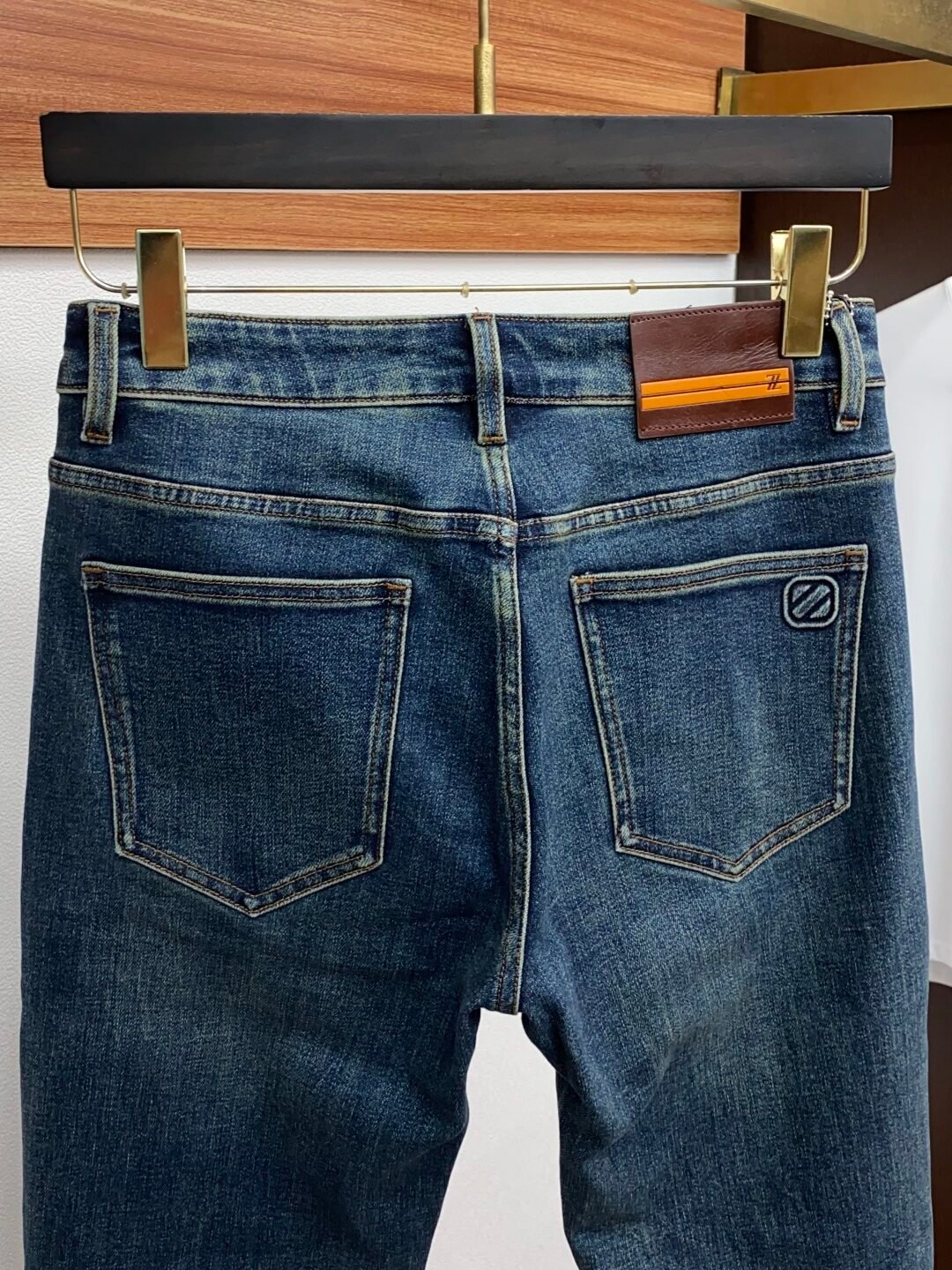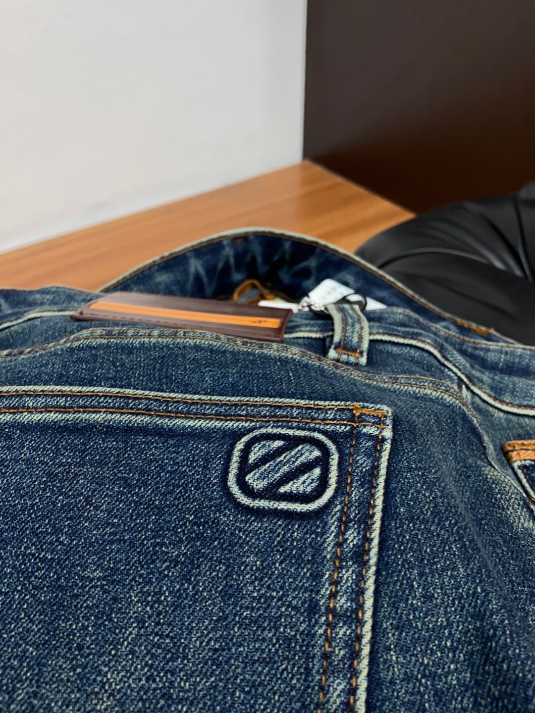 Jean Zegna en denim bleu, coupe ajustée et finitions en cuir. Alliance parfaite entre confort et élégance italienne.