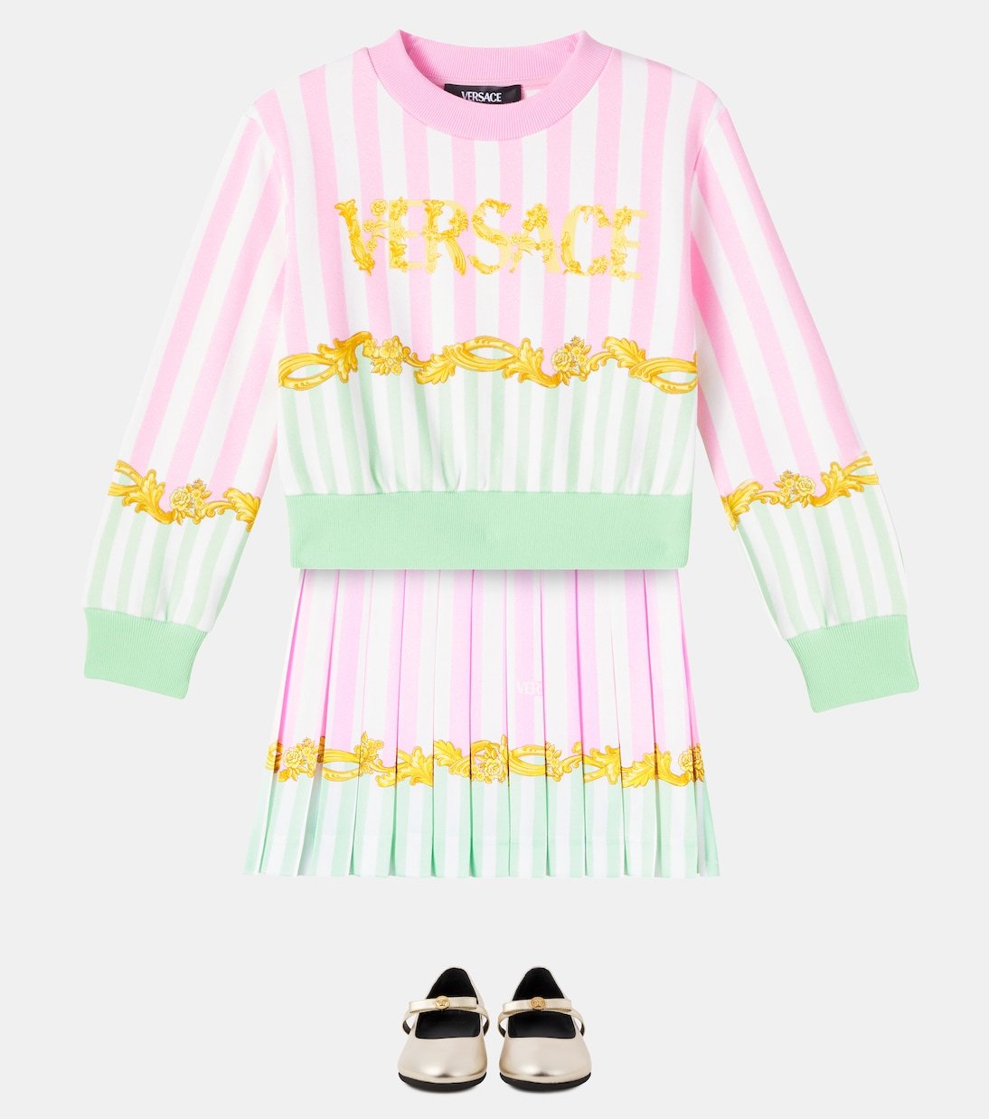 Versace Kids ajoute une note majestueuse à la garde-robe de votre enfant avec des motifs d’inspiration baroque. Remarquez le bord Leaf le long de l’ourlet de cette jupe plissée en sergé.