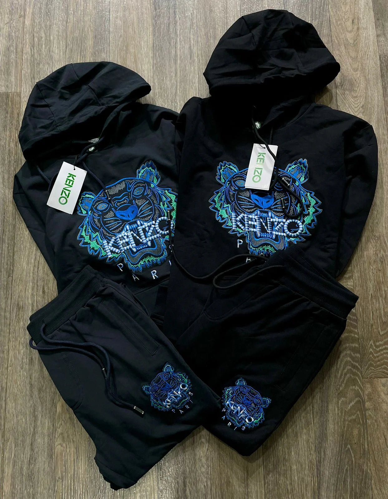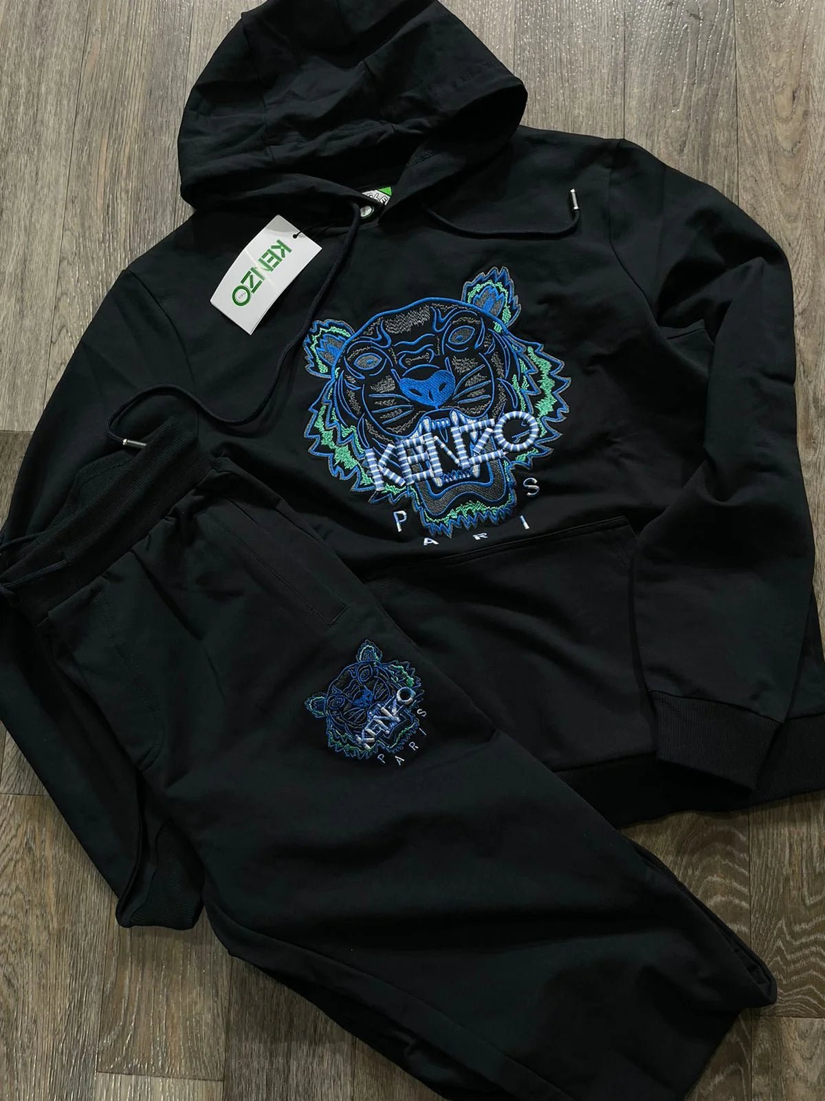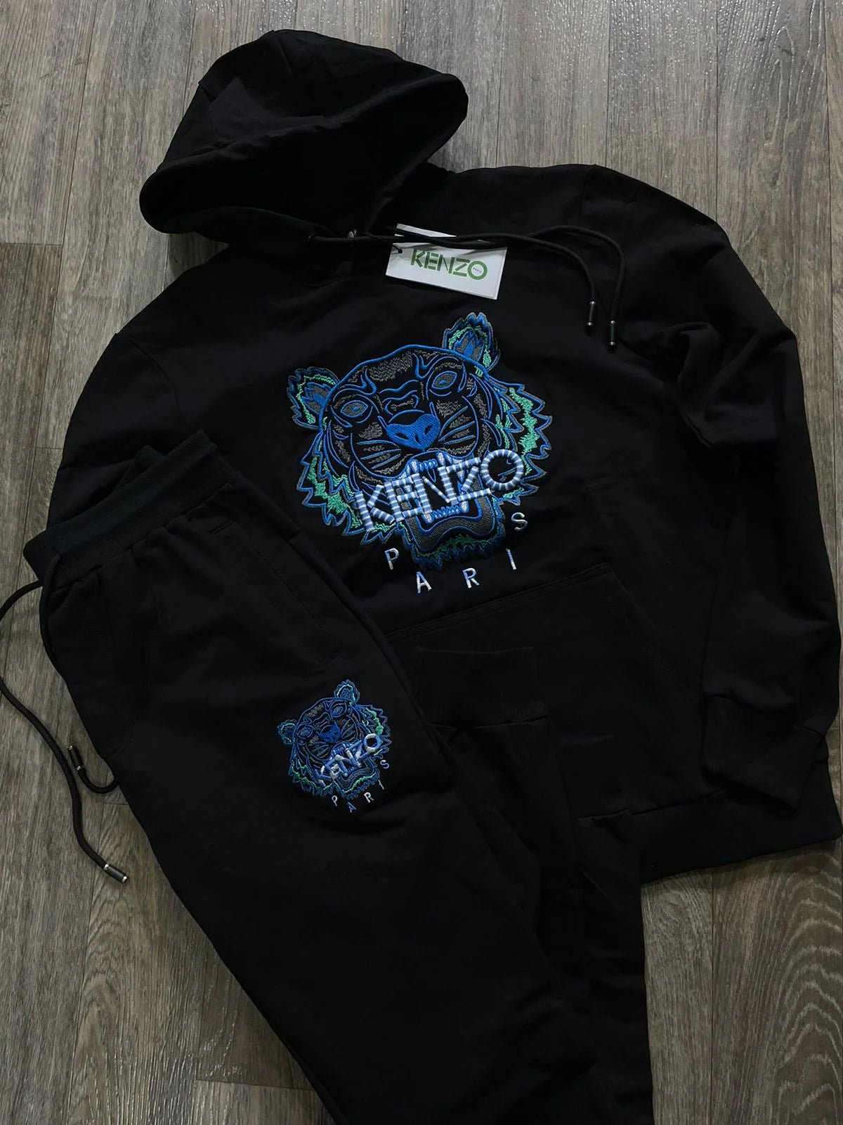 KENZO || Survêtement à capuche motif tigre embossé noir/bleu/blancKENZO || Survêtement à capuche motif tigre embossé noir/bleu/blanc