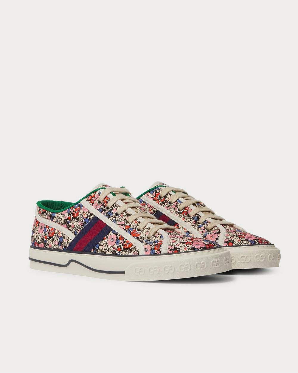 Gucci a collaboré avec Liberty sur une série de pièces pour la collection automne-hiver 2020. Ces baskets « Tennis 1977 » sont confectionnées en toile ornée des motifs floraux emblématiques du grand magasin londonien. Elles sont ornées de bandes latérales en toile et de semelles en caoutchouc embossées GG.