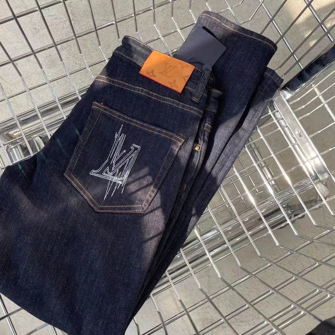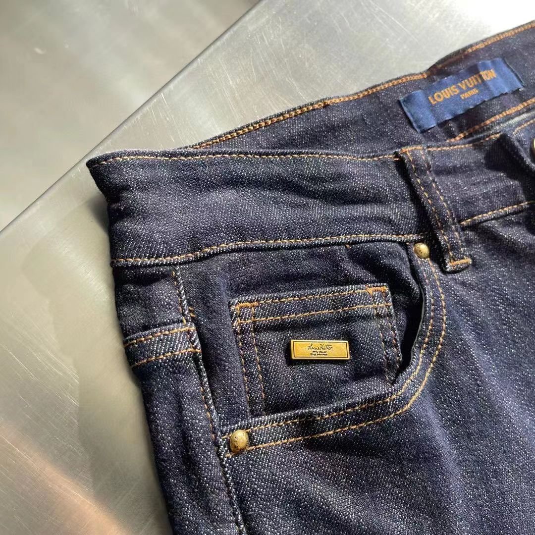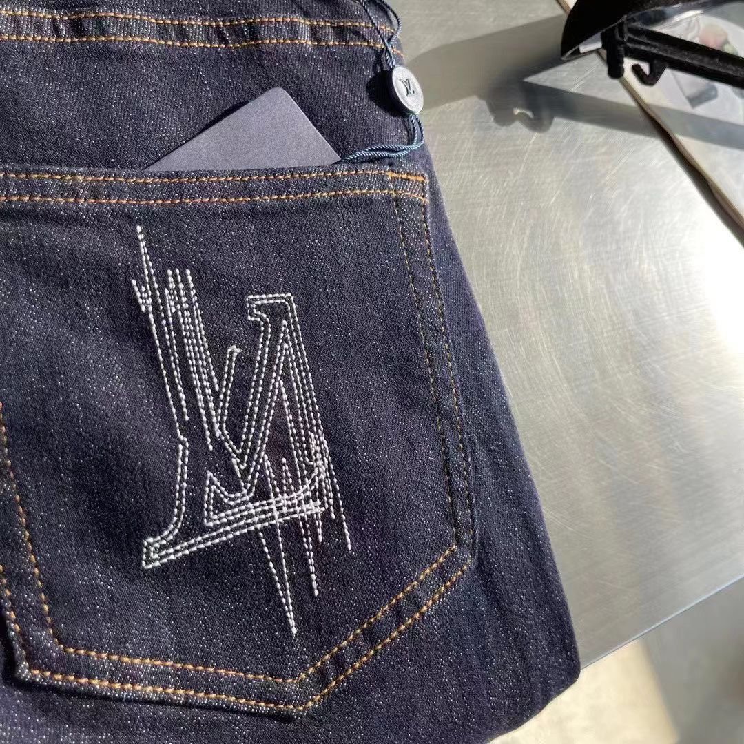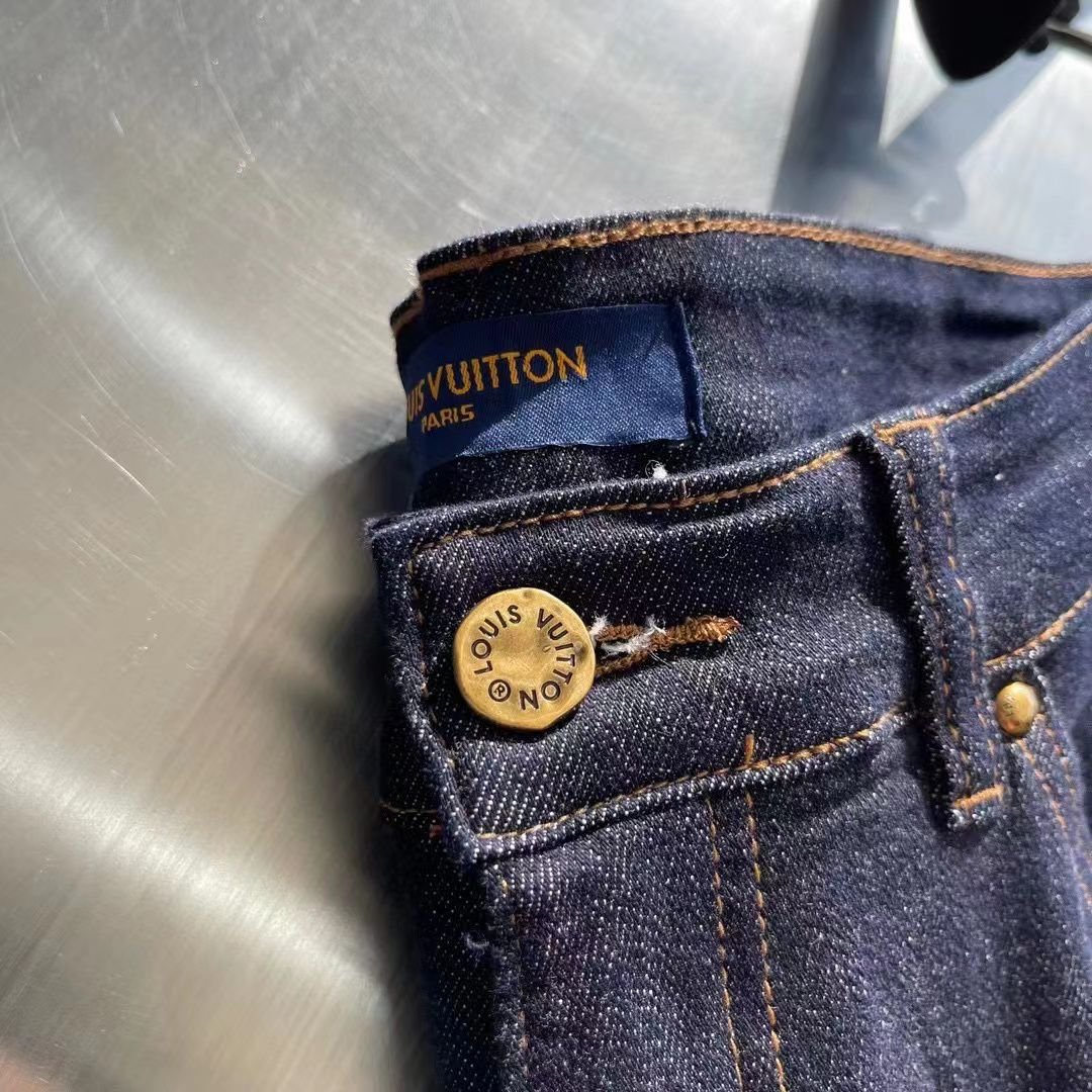 Jean Louis Vuitton en denim bleu foncé avec logo brodé sur la poche arrière. Coupe ajustée et finitions haut de gamme.