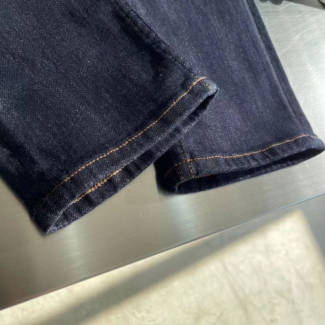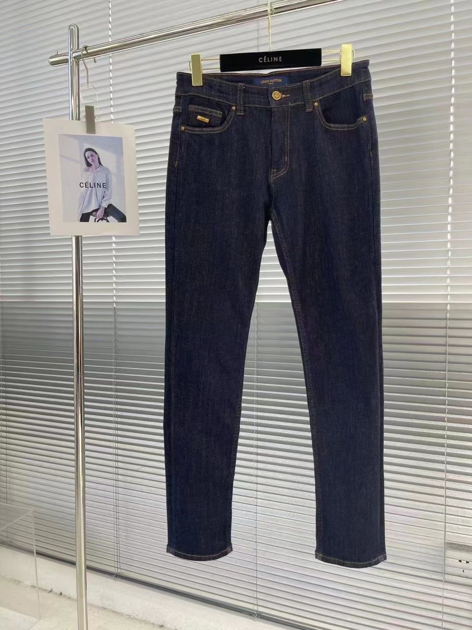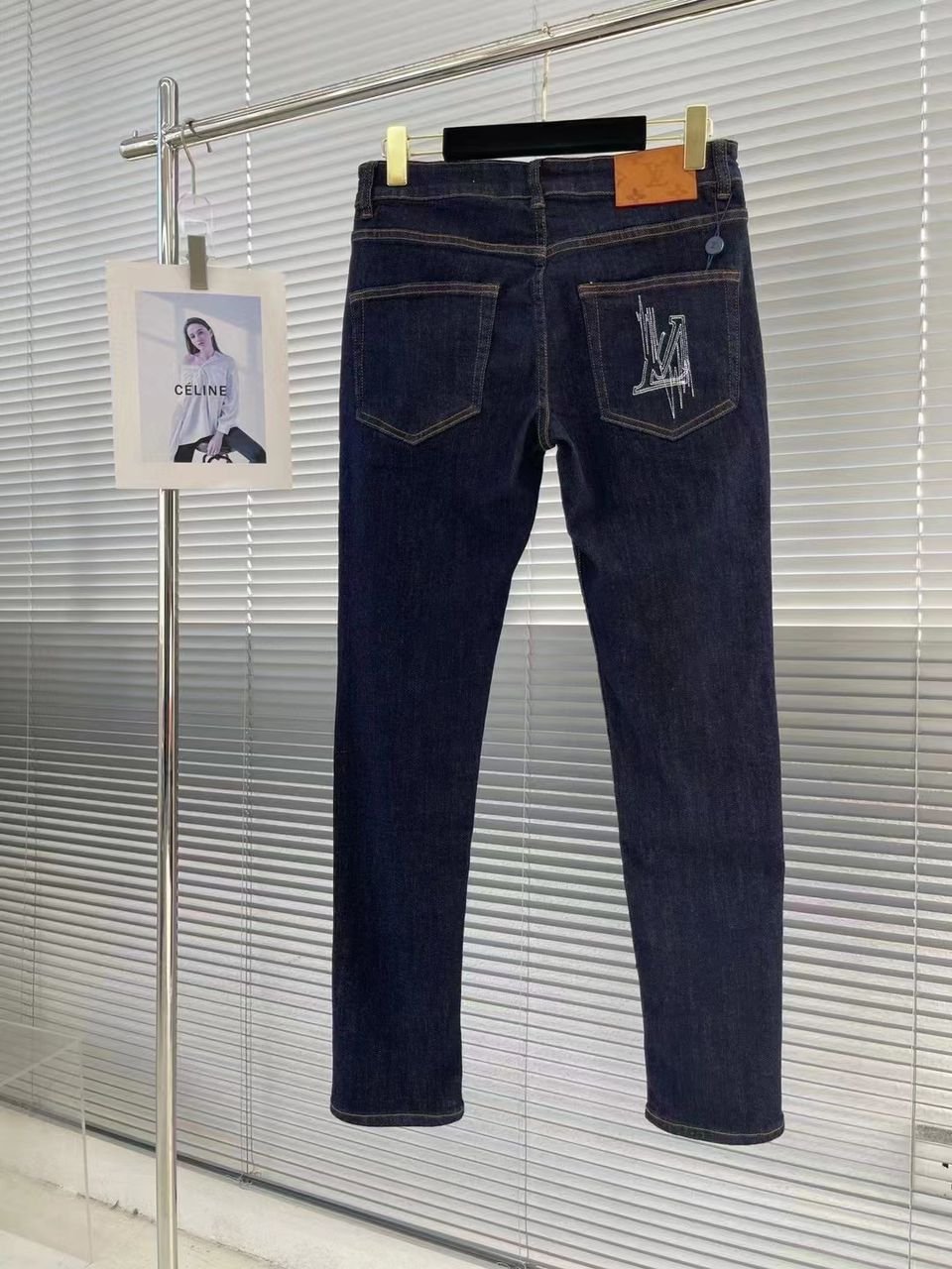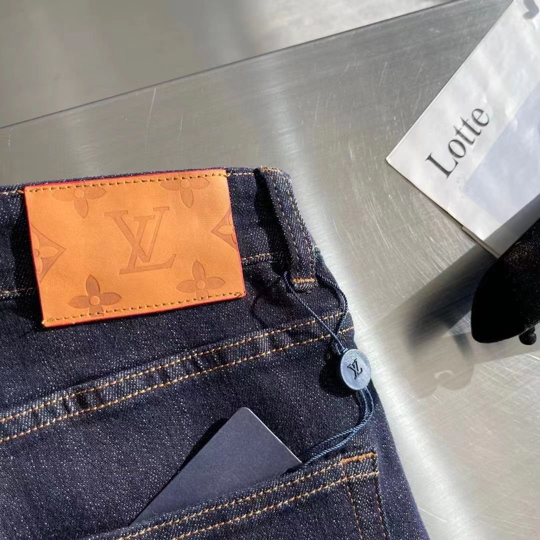 Jean Louis Vuitton en denim bleu foncé avec logo brodé sur la poche arrière. Coupe ajustée et finitions haut de gamme.