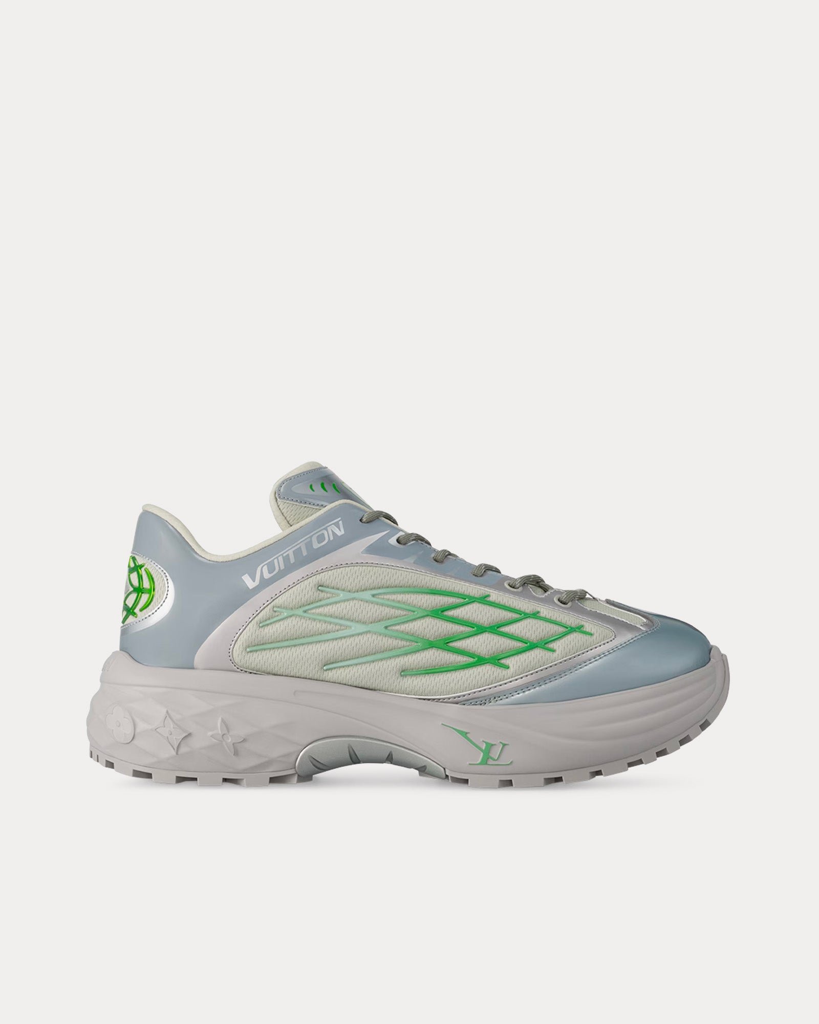 Les baskets basses pour hommes Louis VuittonLV Discovery en gris et vert sont fabriquées en cuir de veau grainé et en maille technique et présentent une maille technique et des matériaux synthétiques avec une finition métallique, des initiales LV sur la languette, une signature Vuitton sur le côté, l’arrière et la semelle extérieure, ainsi que des initiales LV et des fleurs Monogram sur la semelle extérieure. Fabriquées en Italie.