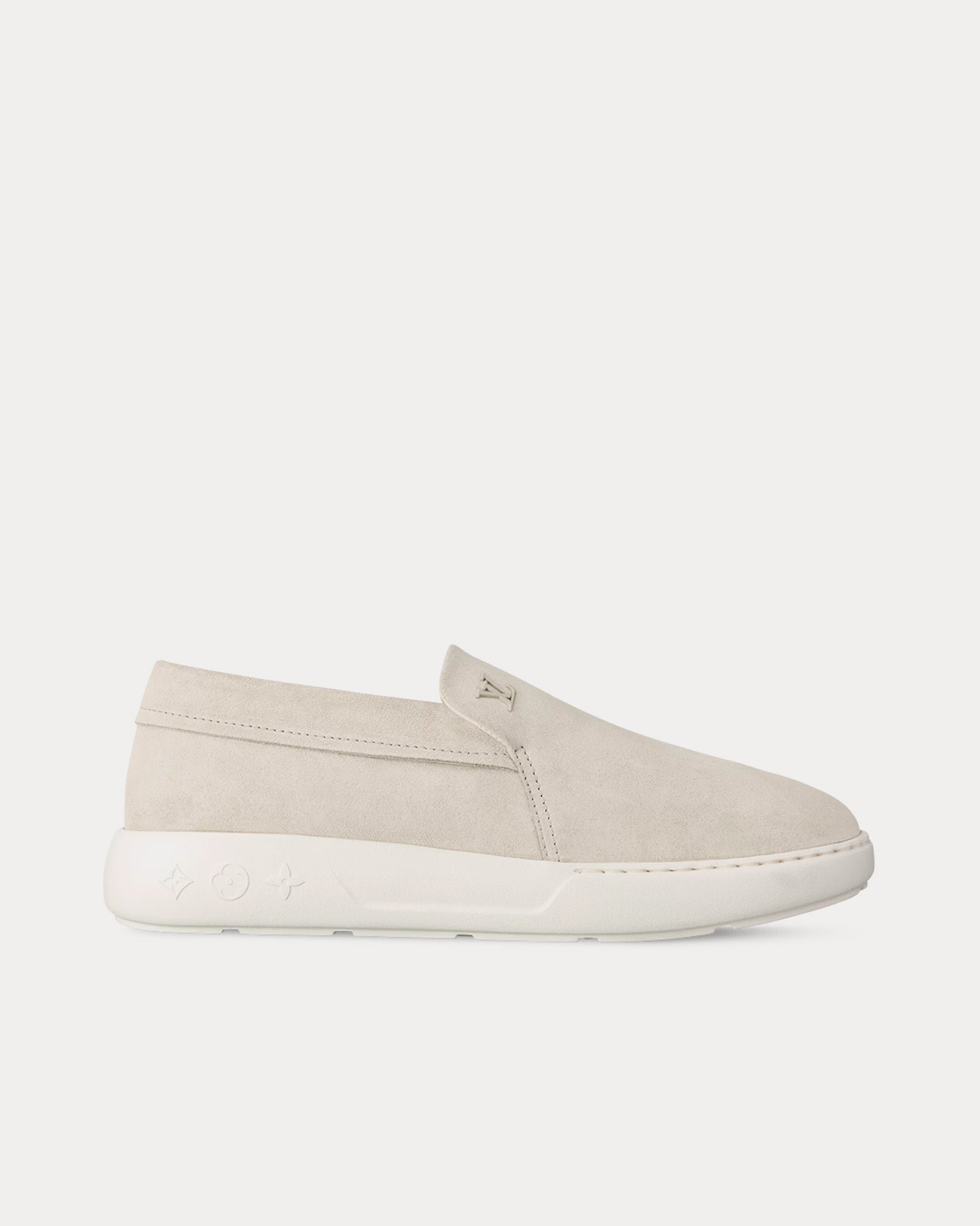 Les mocassins Louis Vuitton LV Pacific pour homme de couleur beige sont confectionnés en cuir de veau suédé souple et arborent des logos LV Initiales discrets ton sur ton sur la tige, ainsi que trois fleurs Monogram sur la semelle extérieure en caoutchouc léger. Fabriqués en Italie.