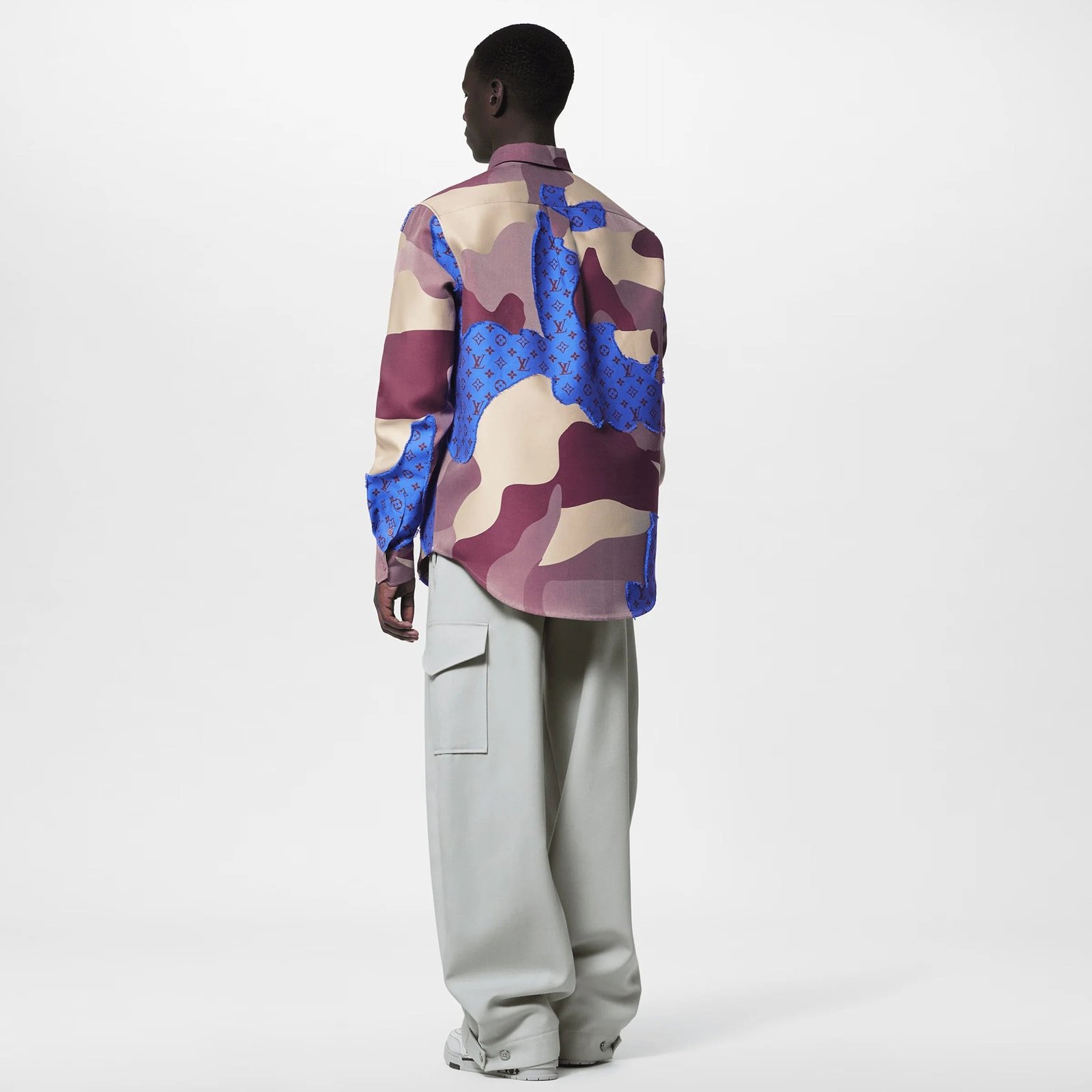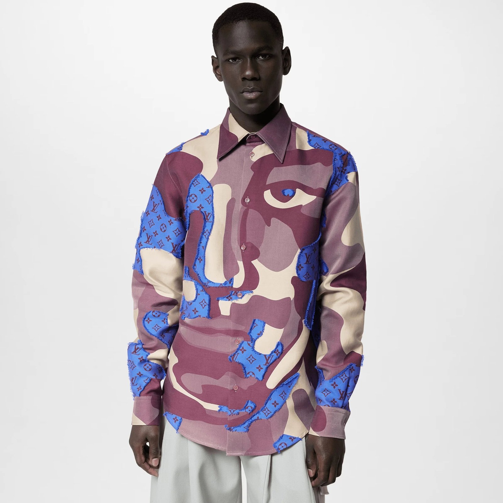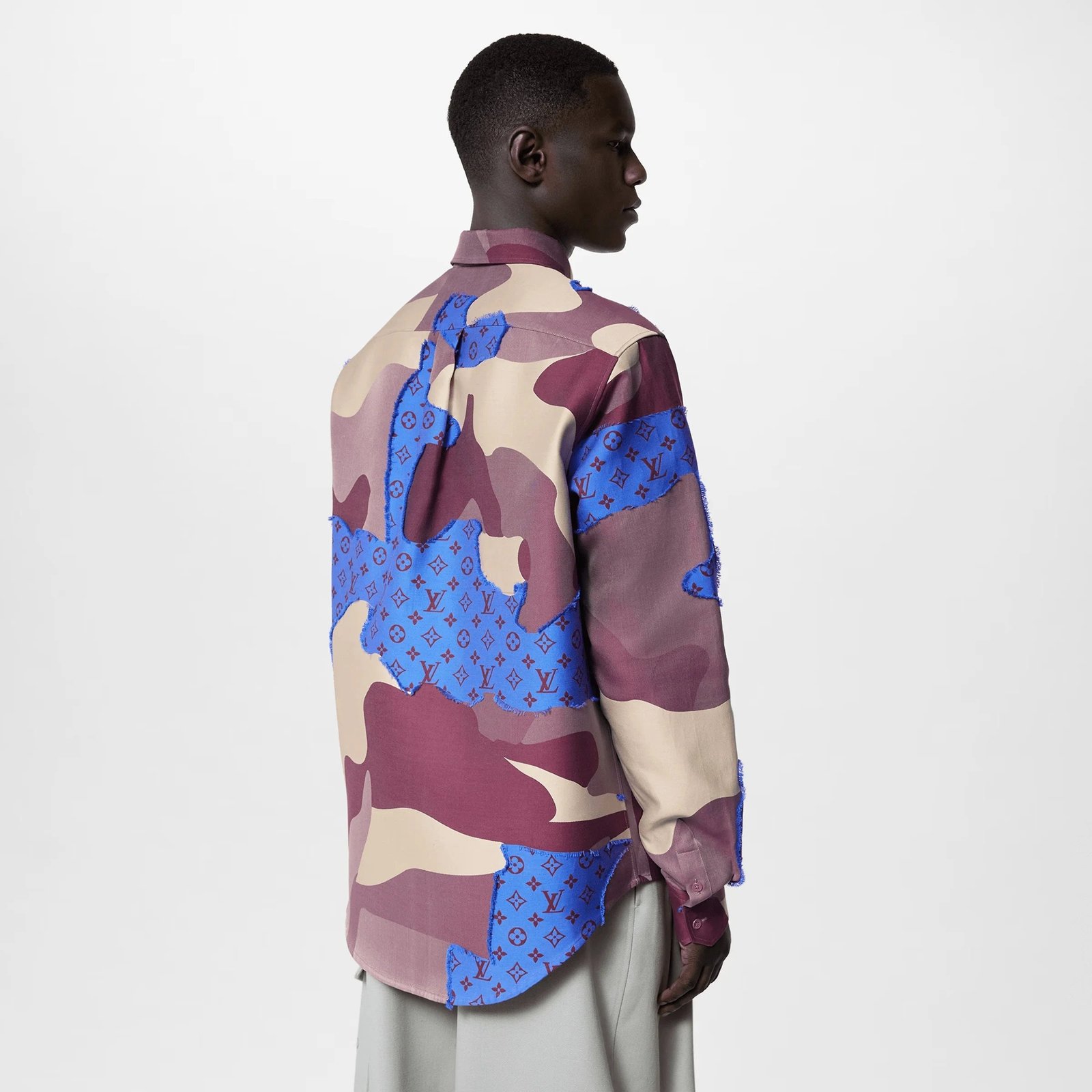Cette surchemise en coton présente le portrait en patchwork du défilé automne-hiver 2023. Elle présente un motif graphique imprimé et tissé, avec le portrait camouflé représenté dans des tons rouge foncé et indigo sur une base jacquard Monogram avec un fil coupé plumeux. Ce vêtement apporte une touche sophistiquée à un look décontracté.