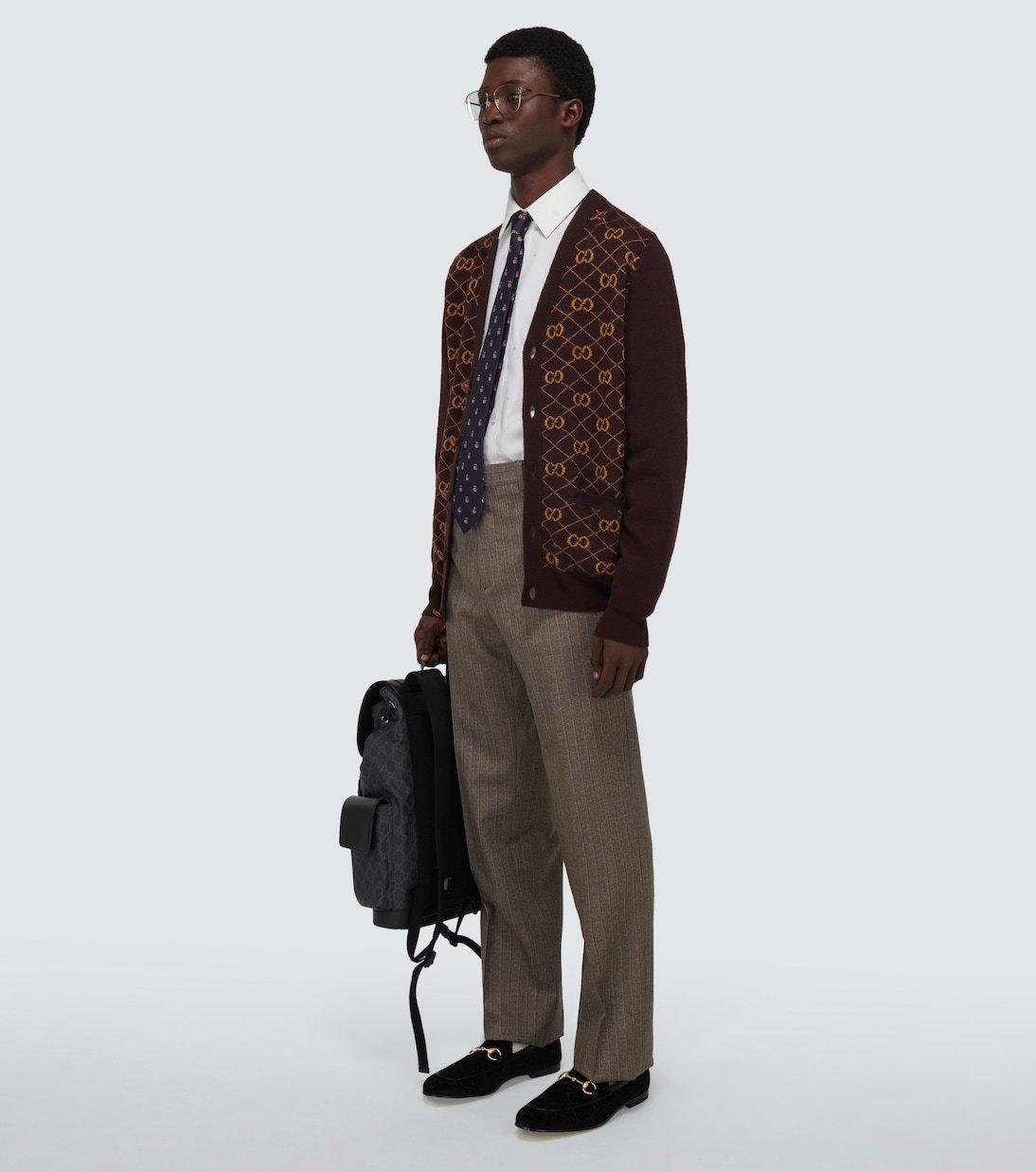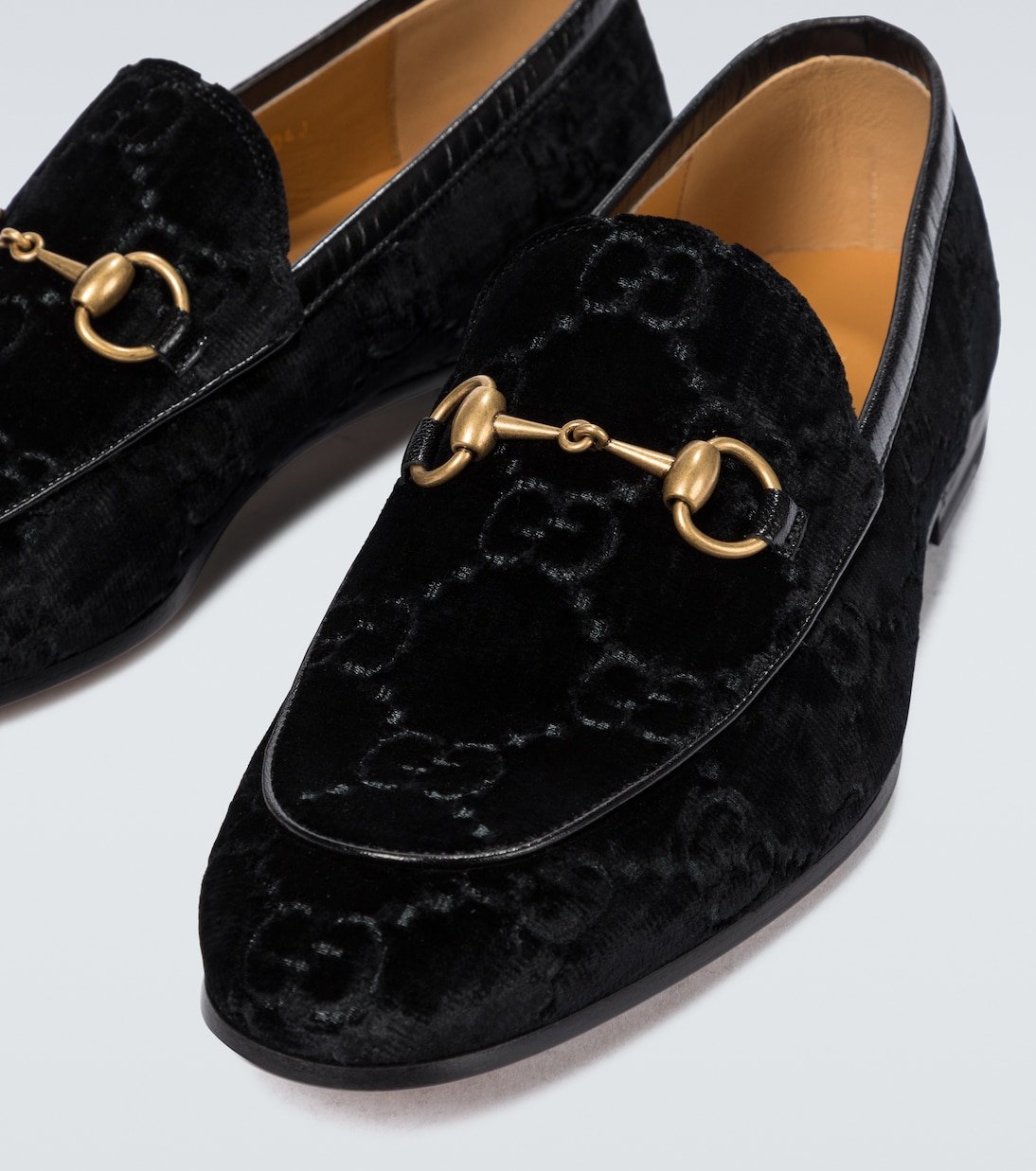 Fabriquées en velours noir orné d’un motif GG, ces mocassins de Gucci arborent un Horsebit en métal doré sur la tige.