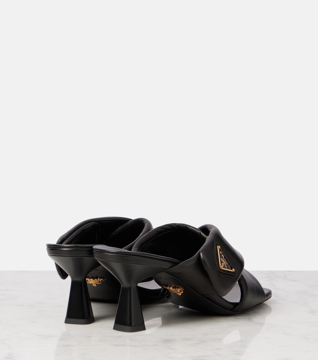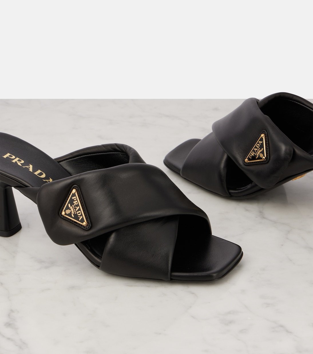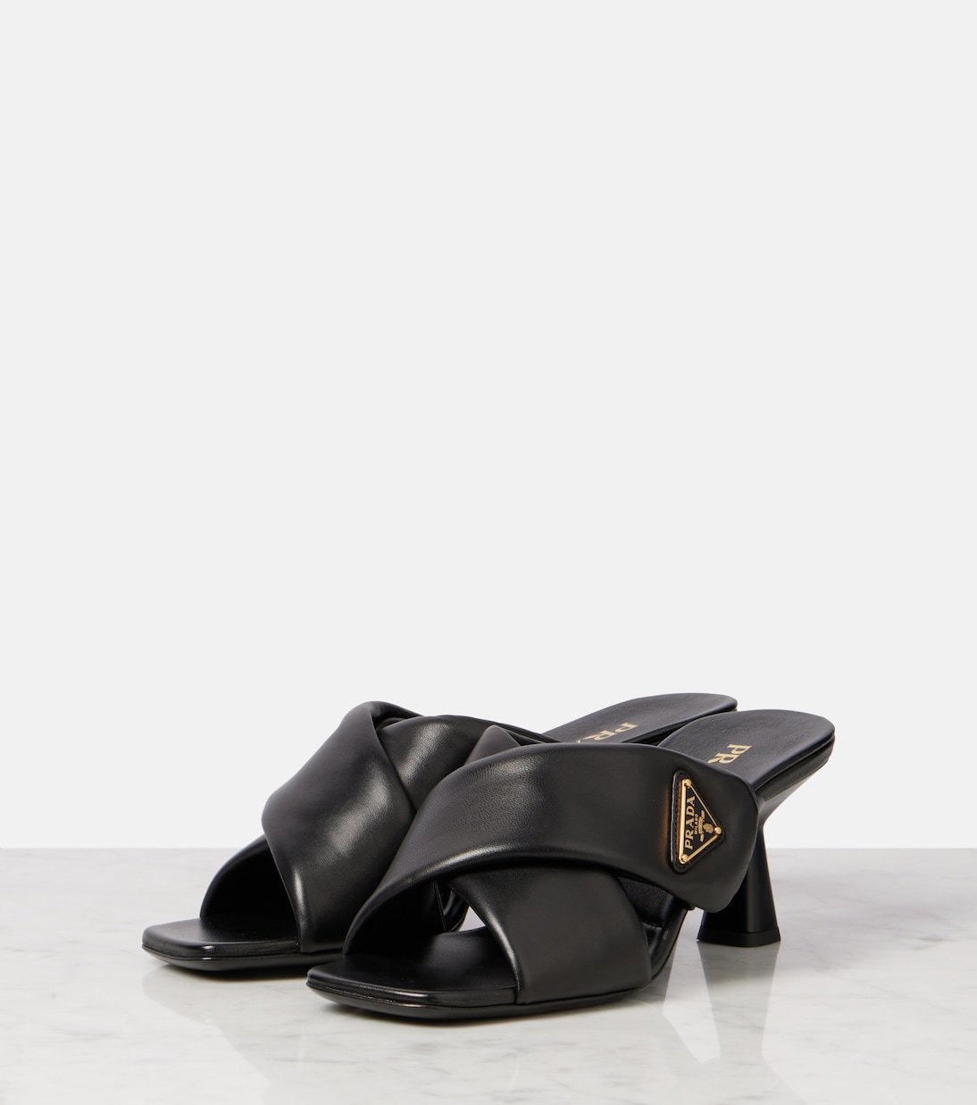 Le logo triangulaire de Prada rend hommage à la relation de longue date entre la maison Savoy et la famille royale italienne. Ces mules Criss Cross en cuir sont dotées de brides croisées et de talons de 65 mm.