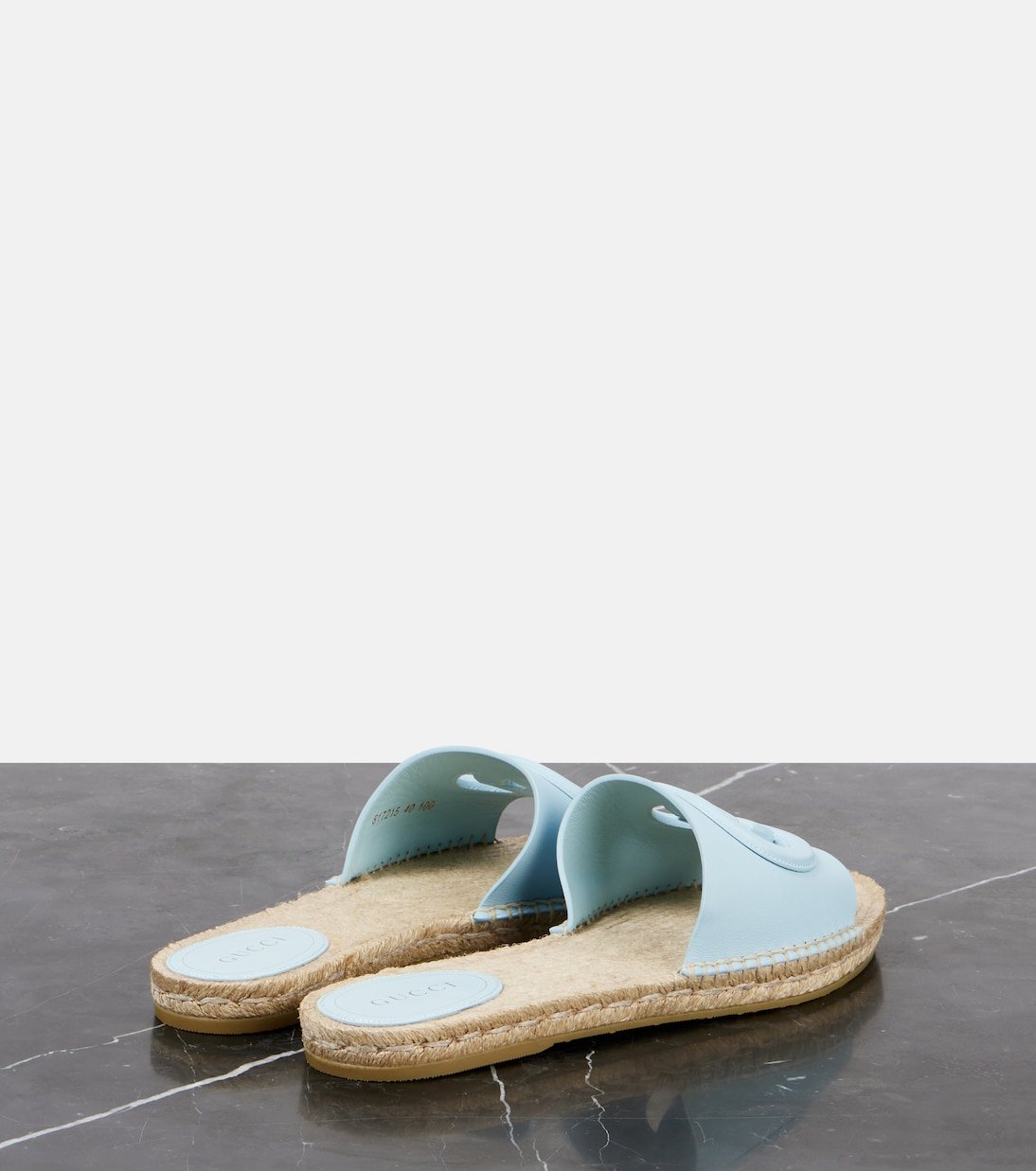 Reprenant les archives estivales des années 70 de Gucci, ces sandales sont caractérisées par des découpes formant le logo GG sur l’empeigne. Confectionnées en Espagne en cuir bleu pastel, ces mules espadrilles témoignent d’une élégance intemporelle.