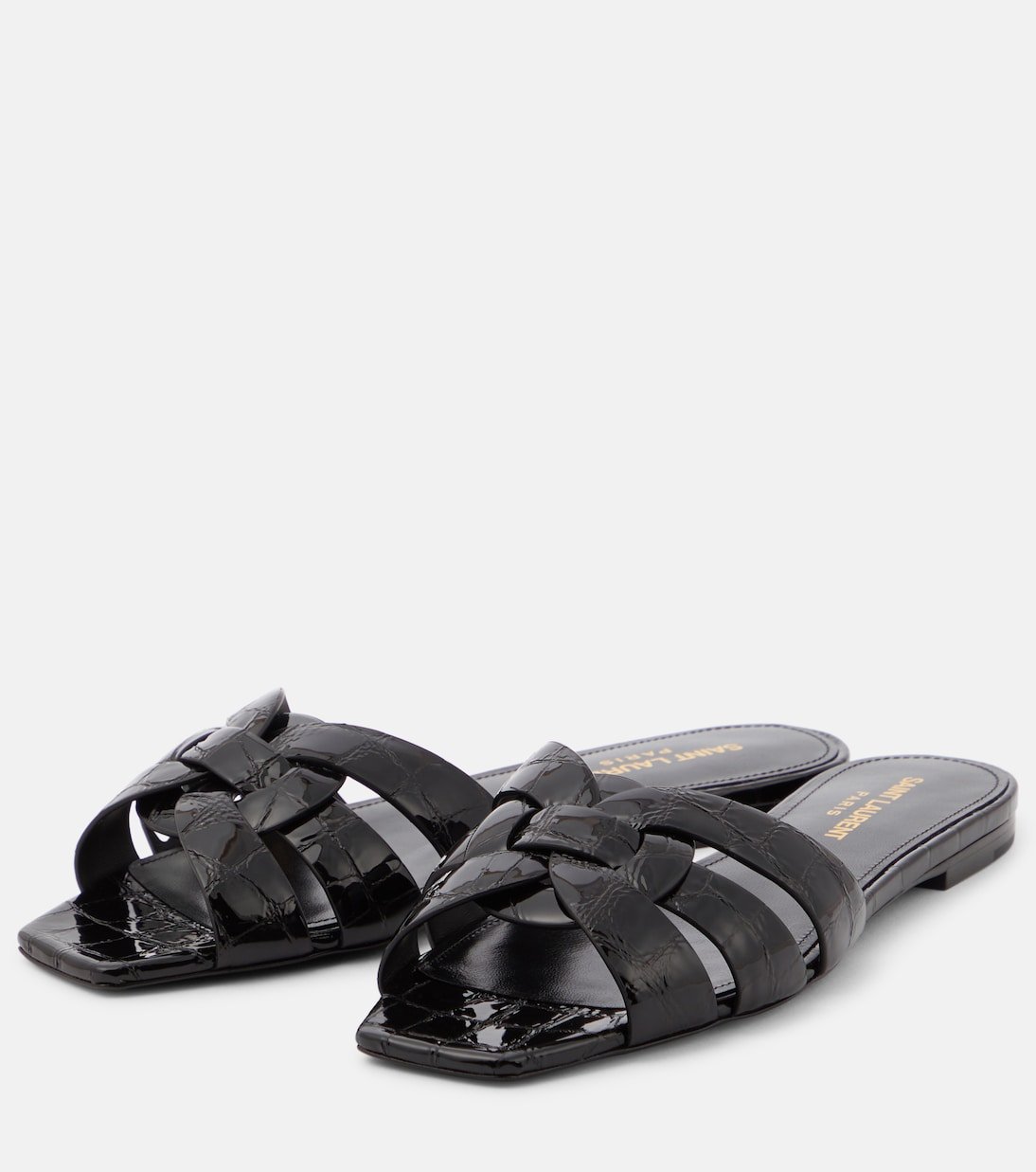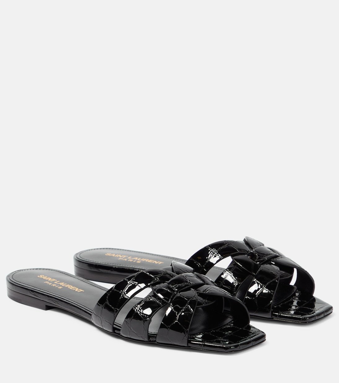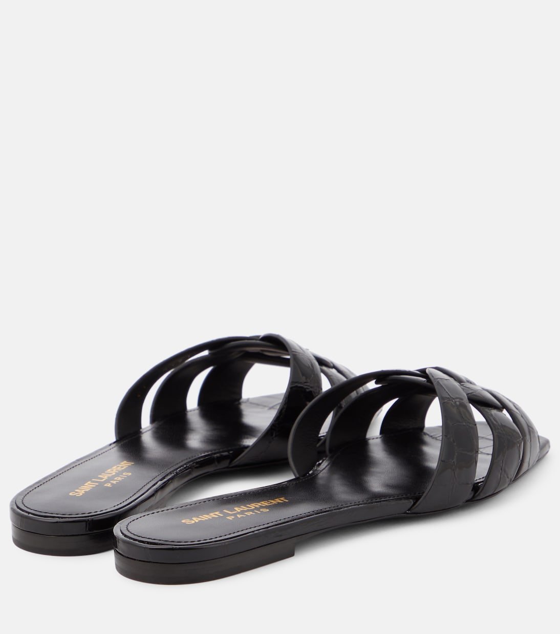 Alliant glamour et simplicité, les mules Tribute Nu Pieds 05 de Saint Laurent relèveront toutes vos tenues d’une touche chic et décontractée. Elles sont confectionnées en Italie à partir de cuir verni embossé effet crocodile et présentent des brides méticuleusement tressées de façon à former le motif Tribute signature.