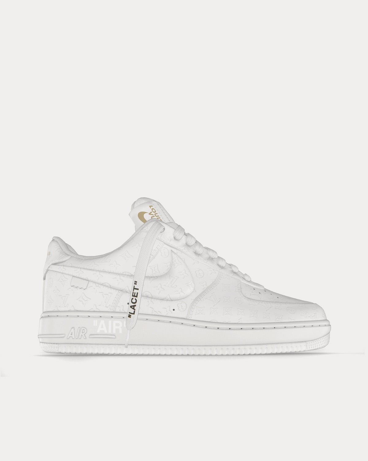À l’occasion du 40e anniversaire de la Nike Air Force 1, Virgil Abloh a réinterprété cette basket emblématique dans des matières emblématiques de Louis Vuitton, présentant ses créations lors du défilé Homme Printemps-Été 2022. Cette version basse est confectionnée en cuir de veau blanc souple, estampé du motif Monogram. La collection Louis Vuitton et Nike « Air Force 1 » par Virgil Abloh est confectionnée dans l’usine de fabrication de chaussures Louis Vuitton de Fiesso d’Artico, en Italie.